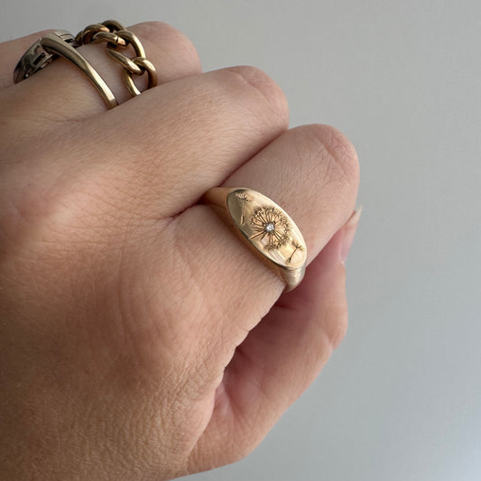 reimagined V I N T A G E // letting go / 10k gold signet with newly engraved dandelion and diamond / size 7.75+
