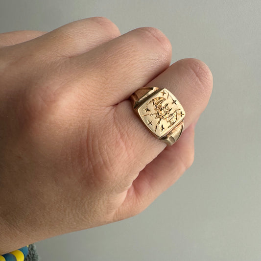 reimagined V I N T A G E // intuitive guide / 10k rosy yellow signet with a newly engraved bat / size 8.5