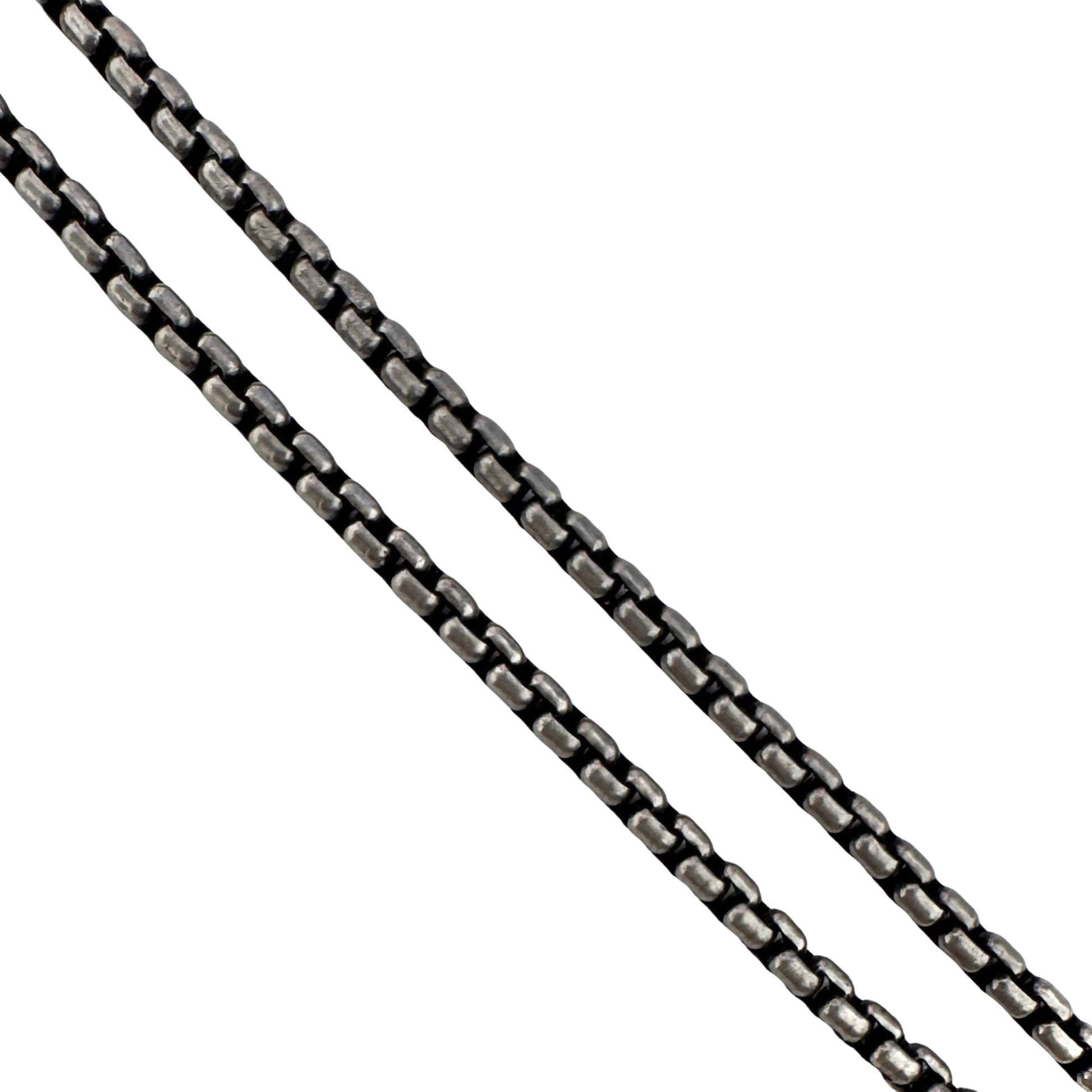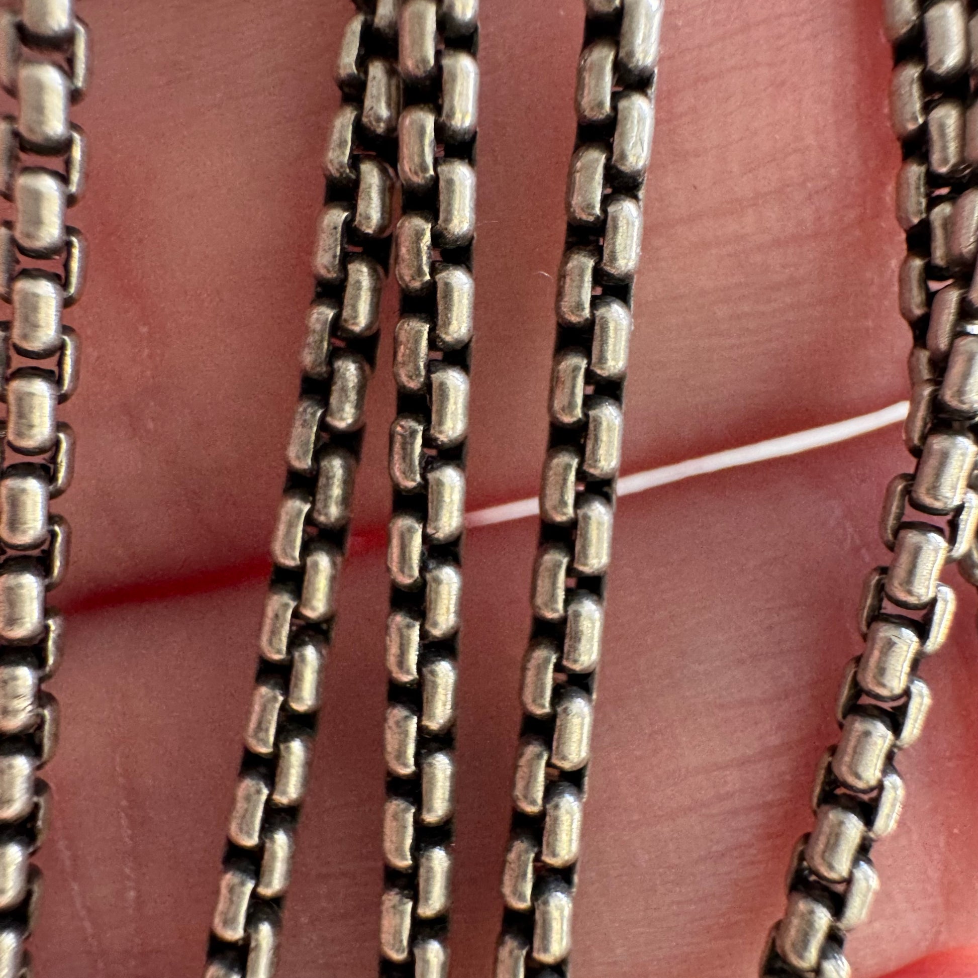 a sturdy, dainty, rounded box chain with patina added for contrast. it's really one of the nicer examples of a box chain — and... if you don't like chains that have a tendency to wrap in hair then this is NOT the chain for you
