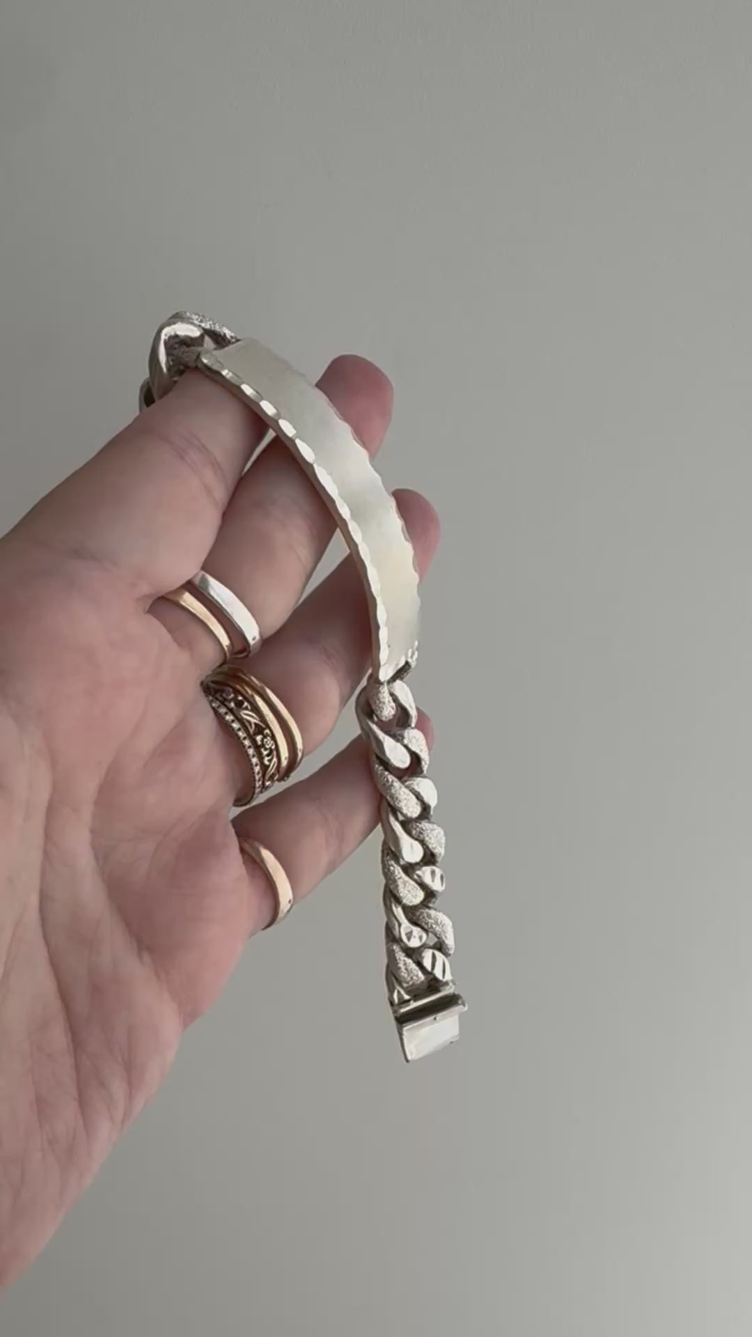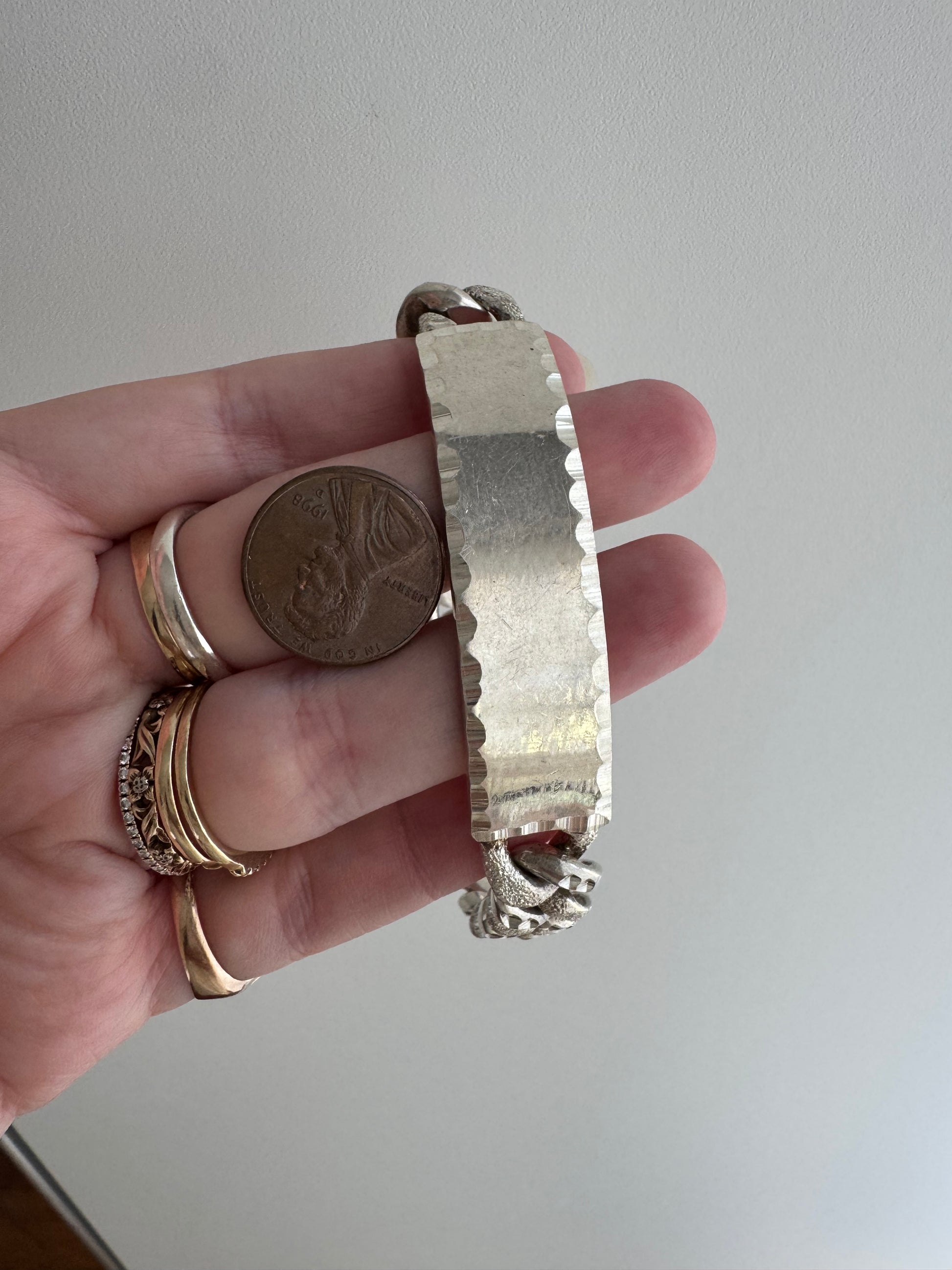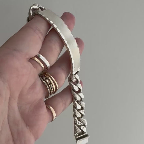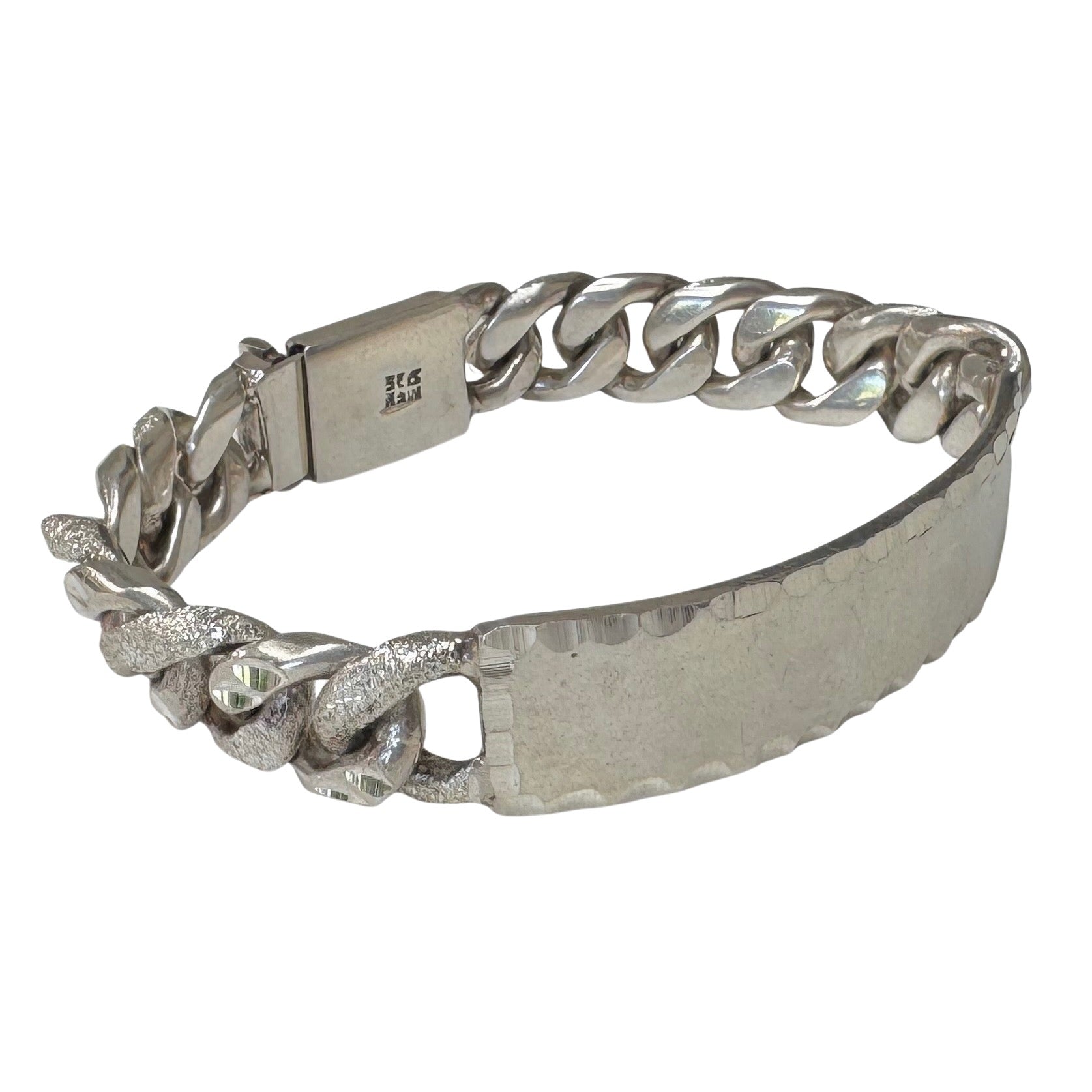 it's a treat to stumble upon a new old stock vintage chunky ID bracelet in glorious Mexican sterling silver, which is an alloy of silver with a bright white hue and no pesky rhodium plating in sight. If you're looking for a sturdy, chunky, heavy ID bracelet for a project this could be it!