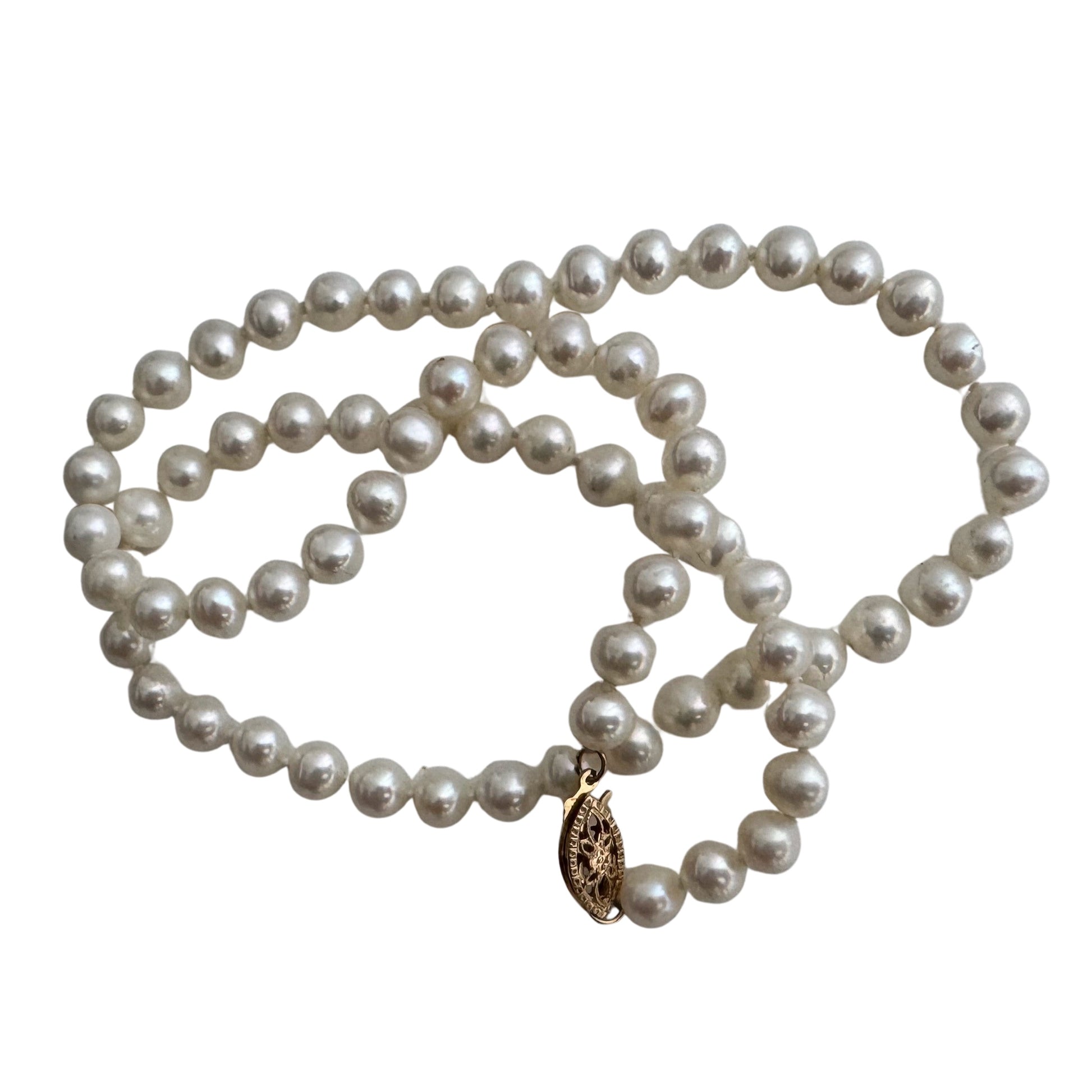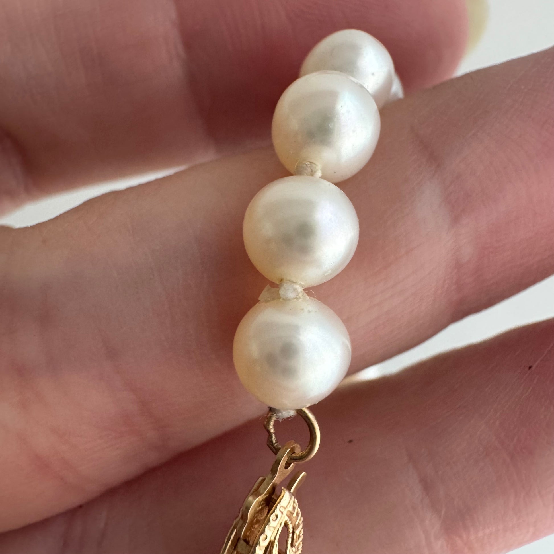V I N T A G E // classic pearls / 14k clasp and off white pearl knotted strand necklace / 16.5", ~16.2g