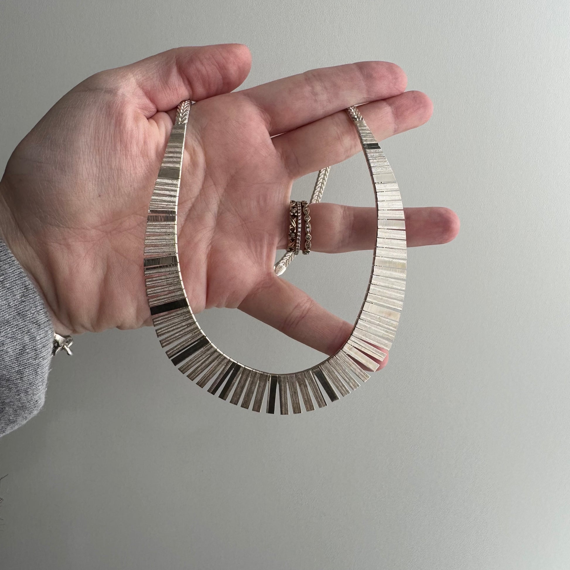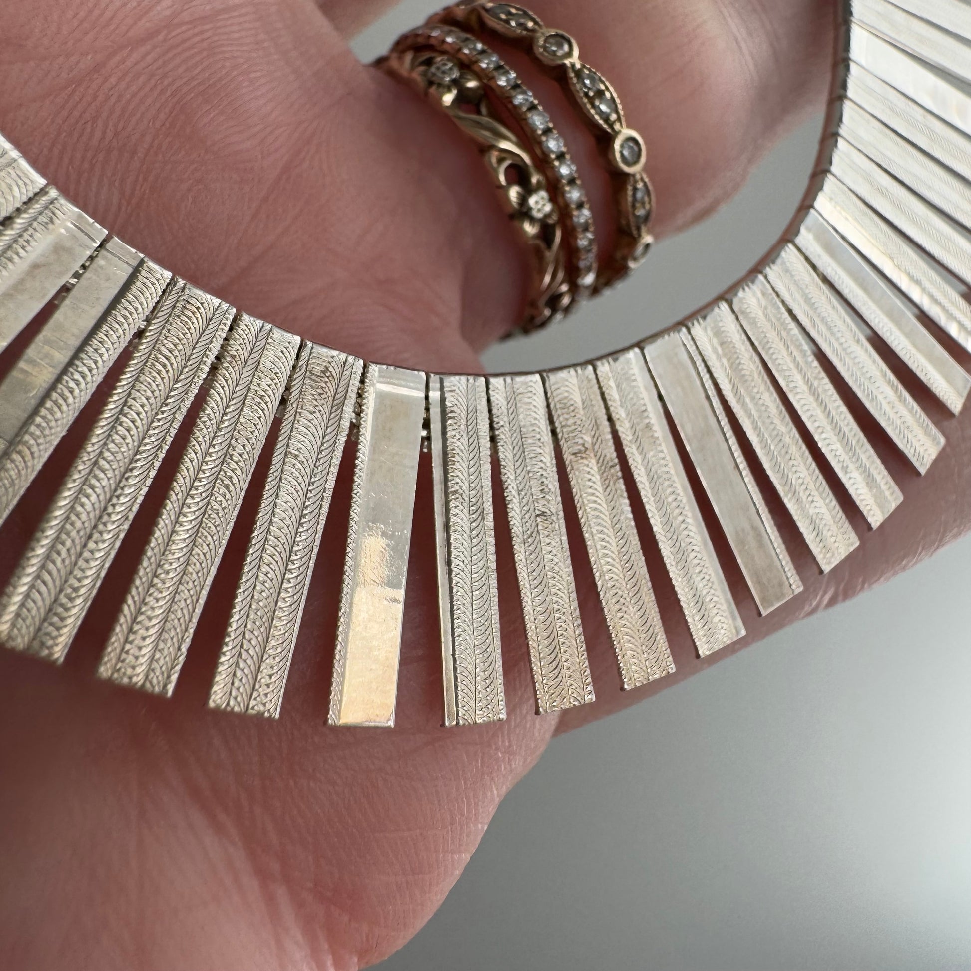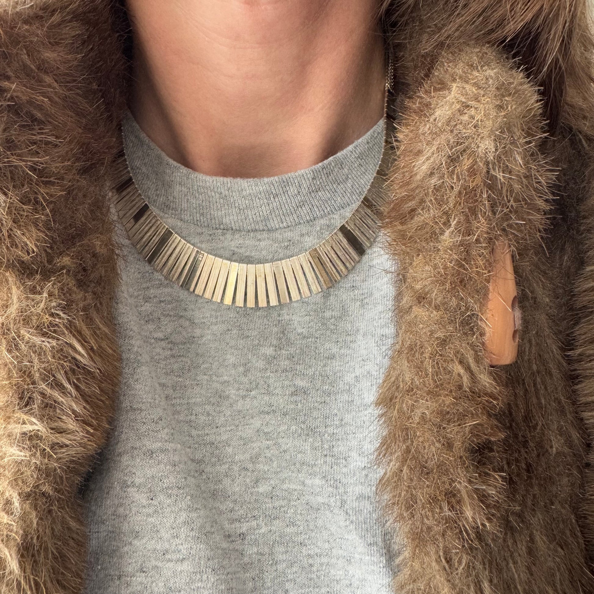 a timeless Cleopatra style paneled necklace. graduated panels finished with a very shimmery matte pattern and one mirror like panel that repeats every 5th panel adding visual intrigue and contrast