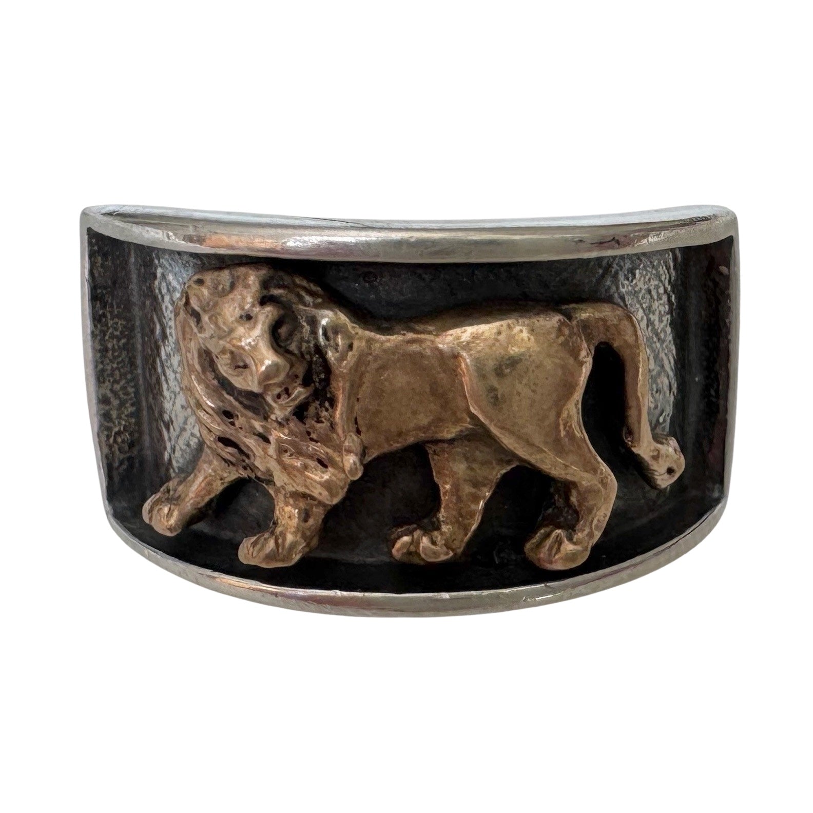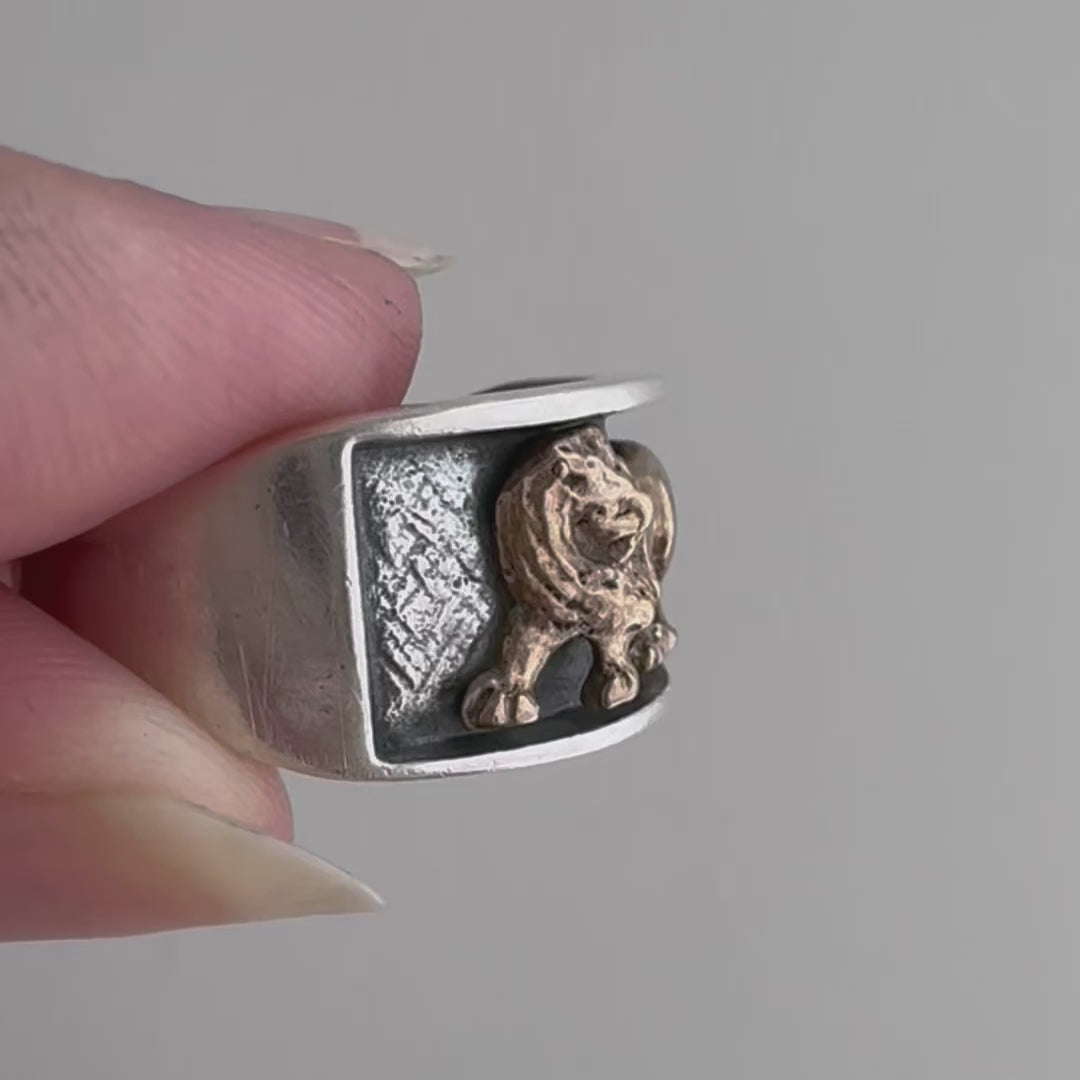 a gold toned lion is framed by a shadowbox frame in a wide, tapered band reminiscent of a signet