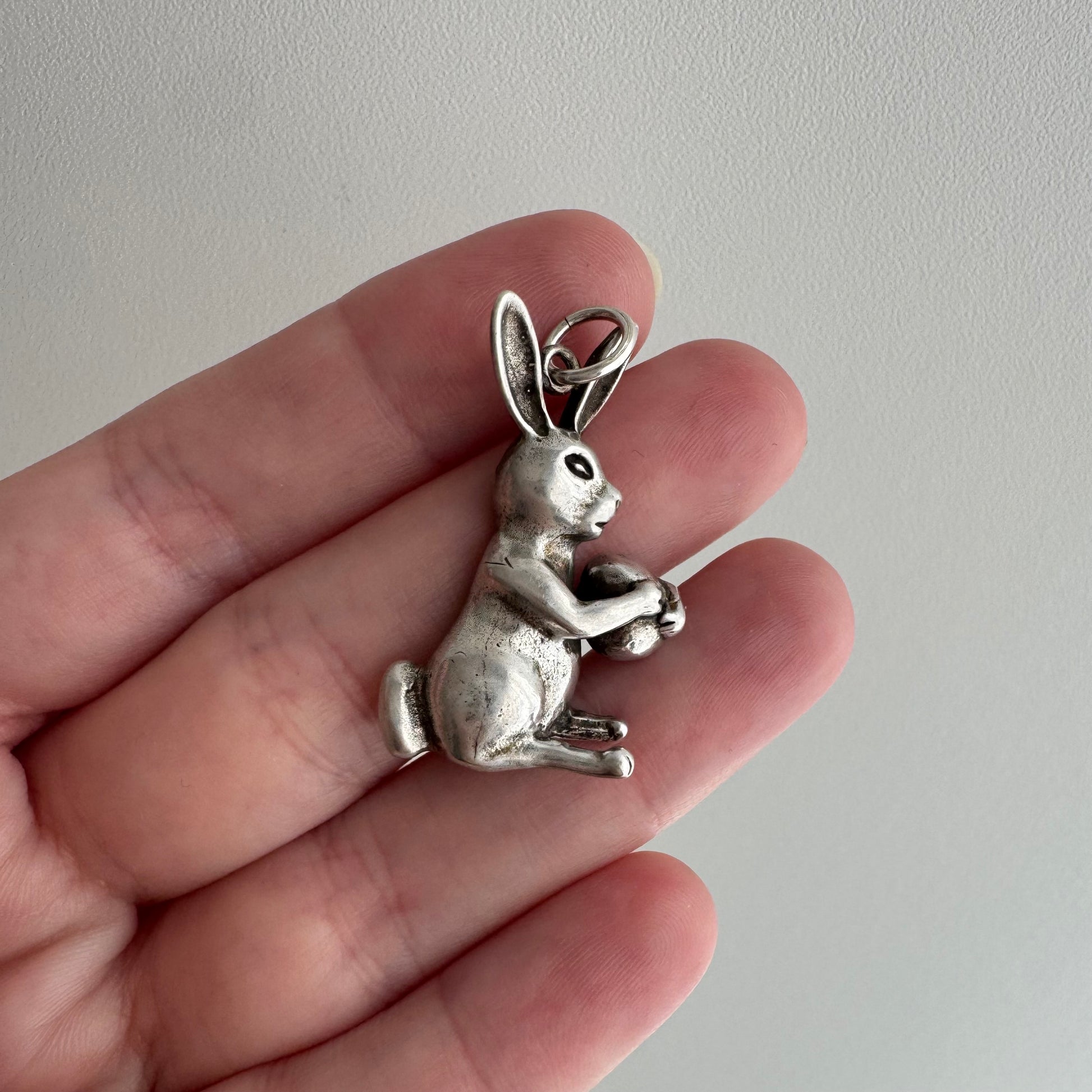 not all bunny rabbit pendants are created equal — many have sneaky, almost sinister or scary demeanor — so comparison that makes this sweet bunny even more delightful. is it holding an egg? another lucky find?