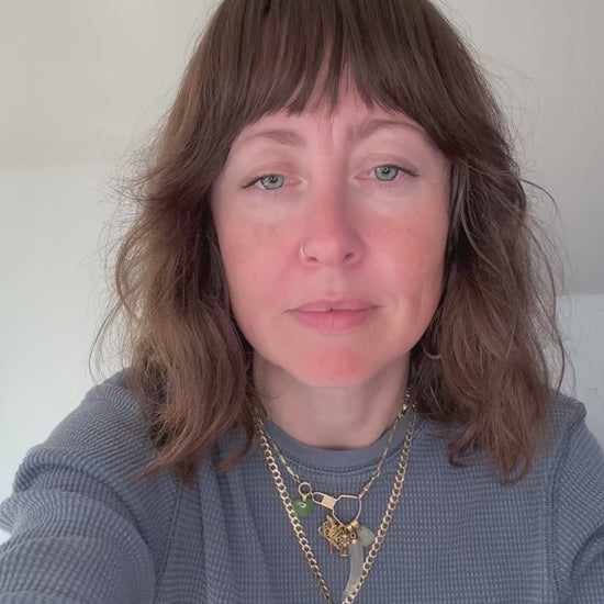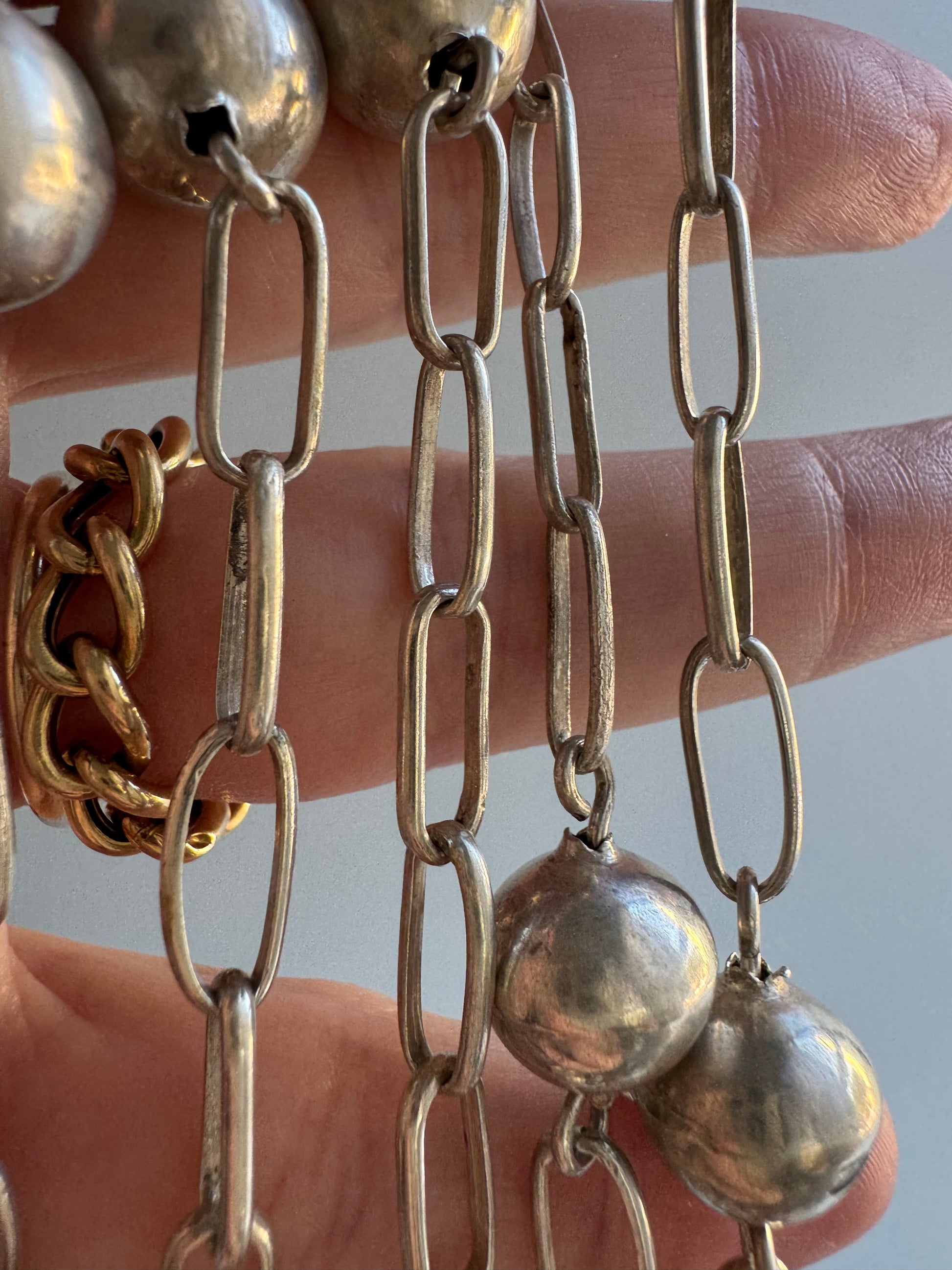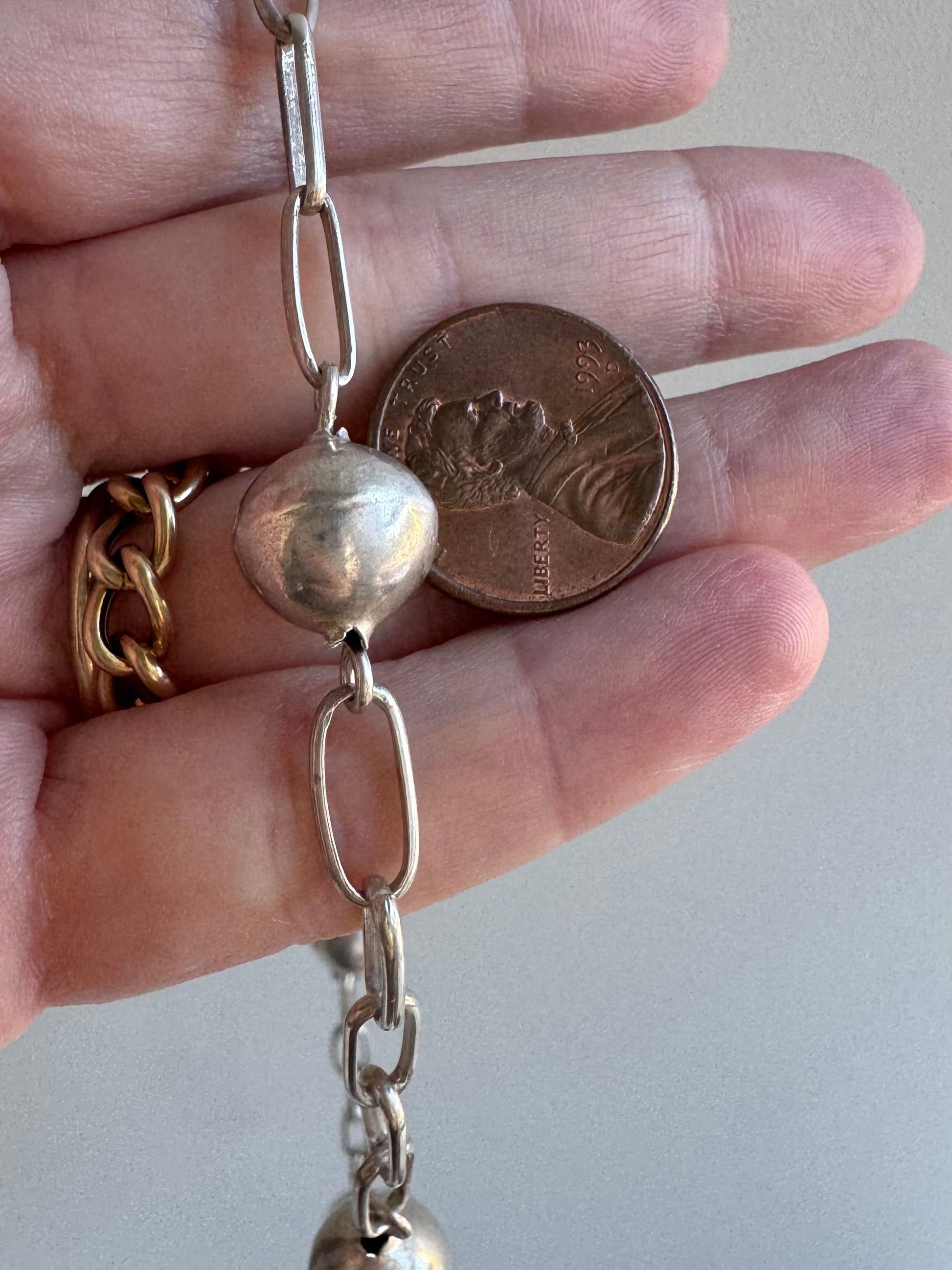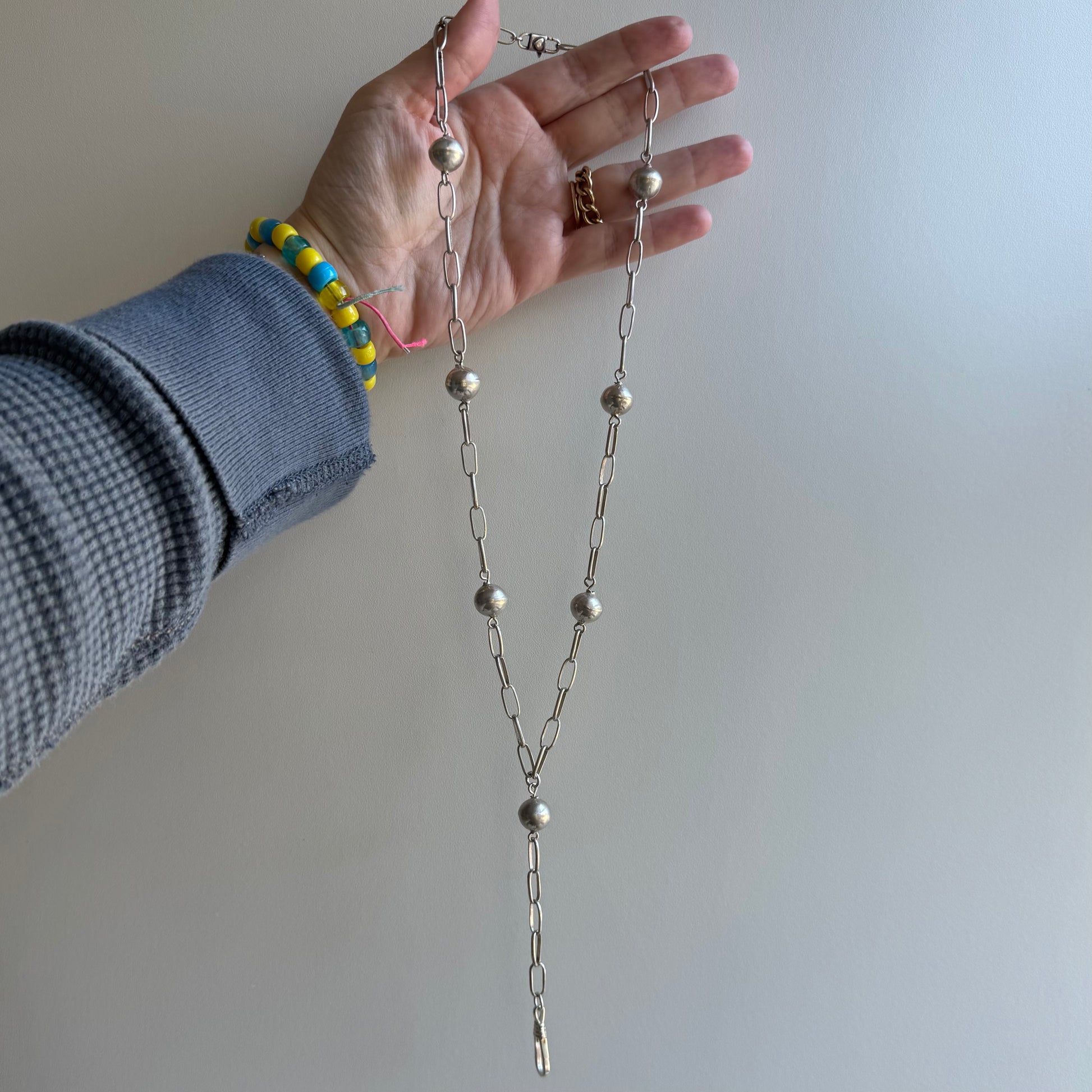 a vintage handmade Mexican sterling silver paperclip and bench bead station chain has been reworked and reconfigured into a rosary-style chain with a modern dog clip style clasp as a pendant holder