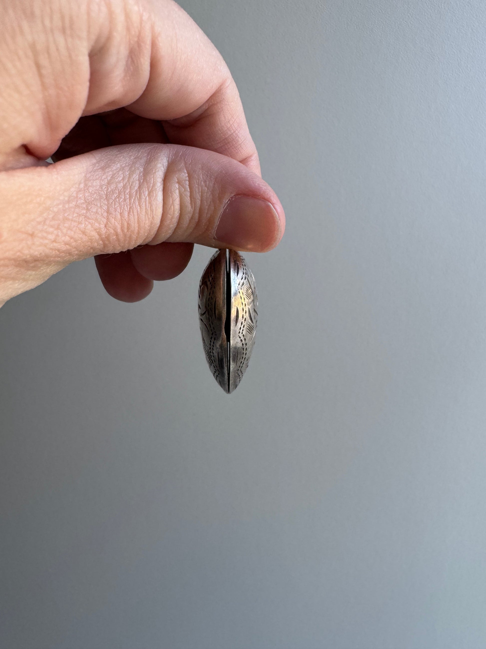 a vintage larger heart locket with engraving on both sides and the bail. it has a sizable compartment, so you could carry vitamins, spells, and more.