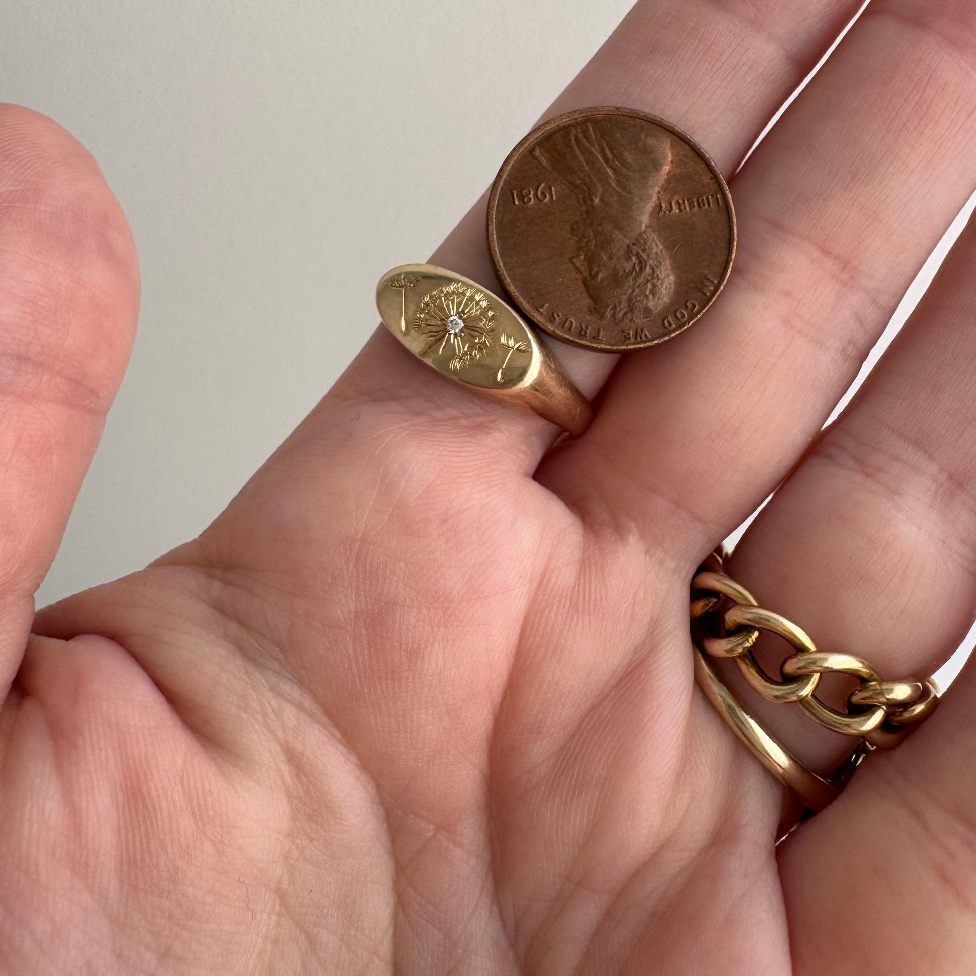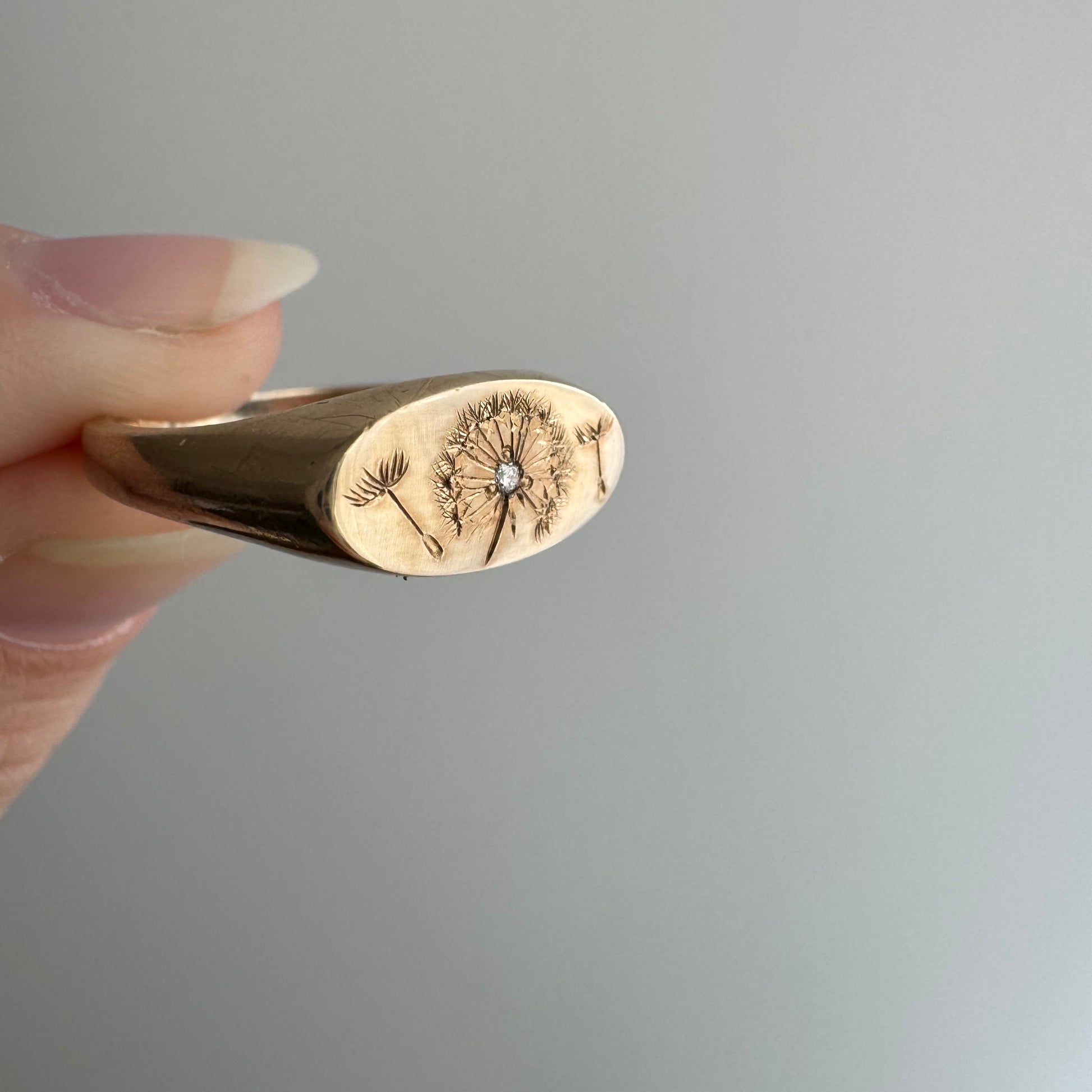 a vintage 10k yellow gold signet has been newly adorned with hand engraved a diamond-adorned dandelion and her seeds dispersing in the wind — what are you surrendering to the winds of time?