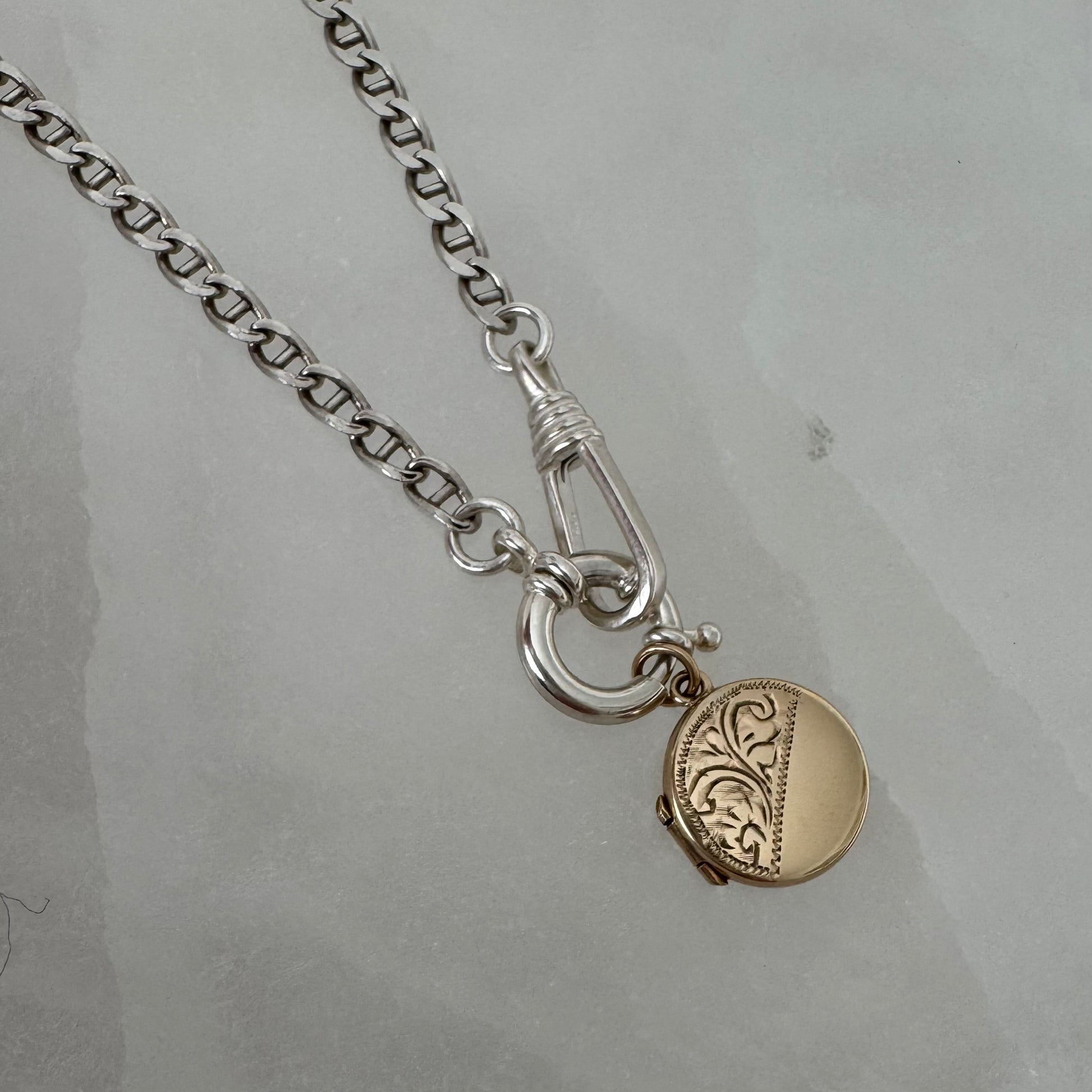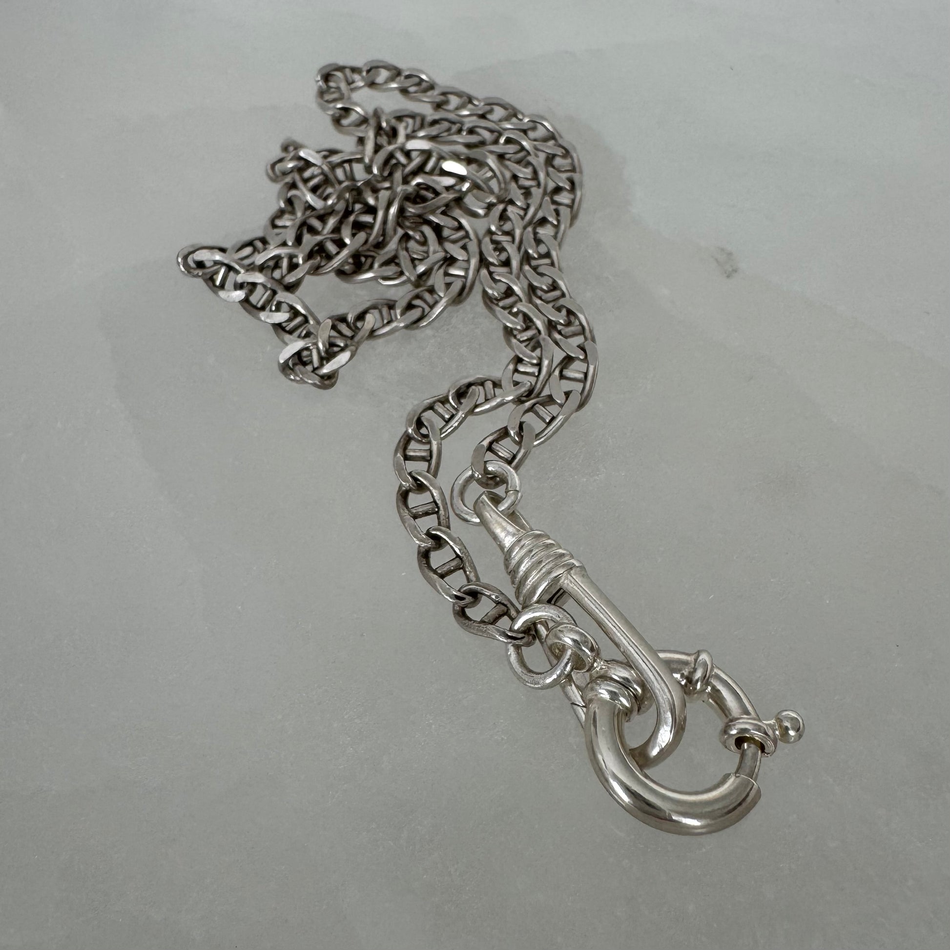 a flat mariner anchor link chain has been re-worked with new clasps reminiscent of a watch chain — a new clasp in the style of a dog clip clasp, but without the swivel feature, and a new sailor clasp.