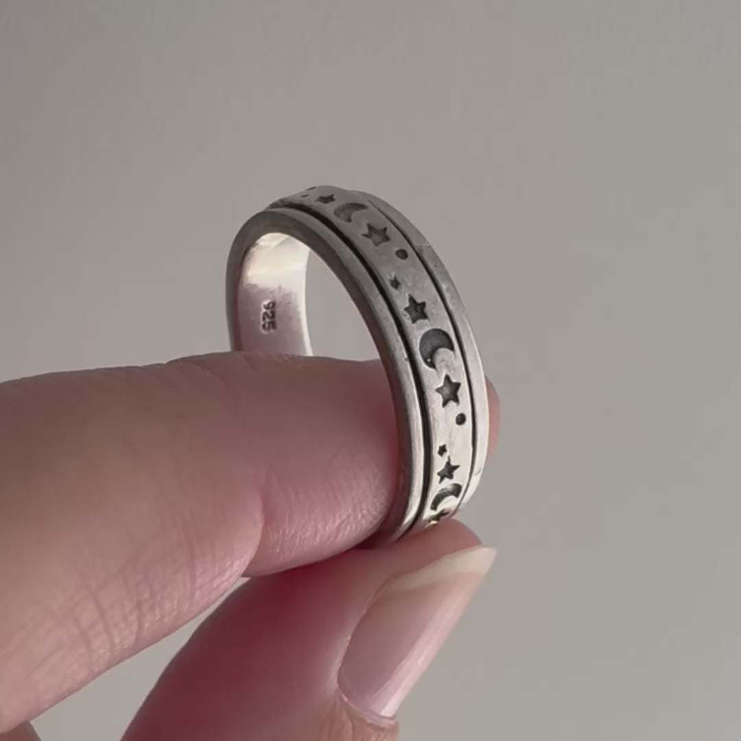 a sturdy wide sterling silver band with a spinning outer band adorned with star and moon stamped details