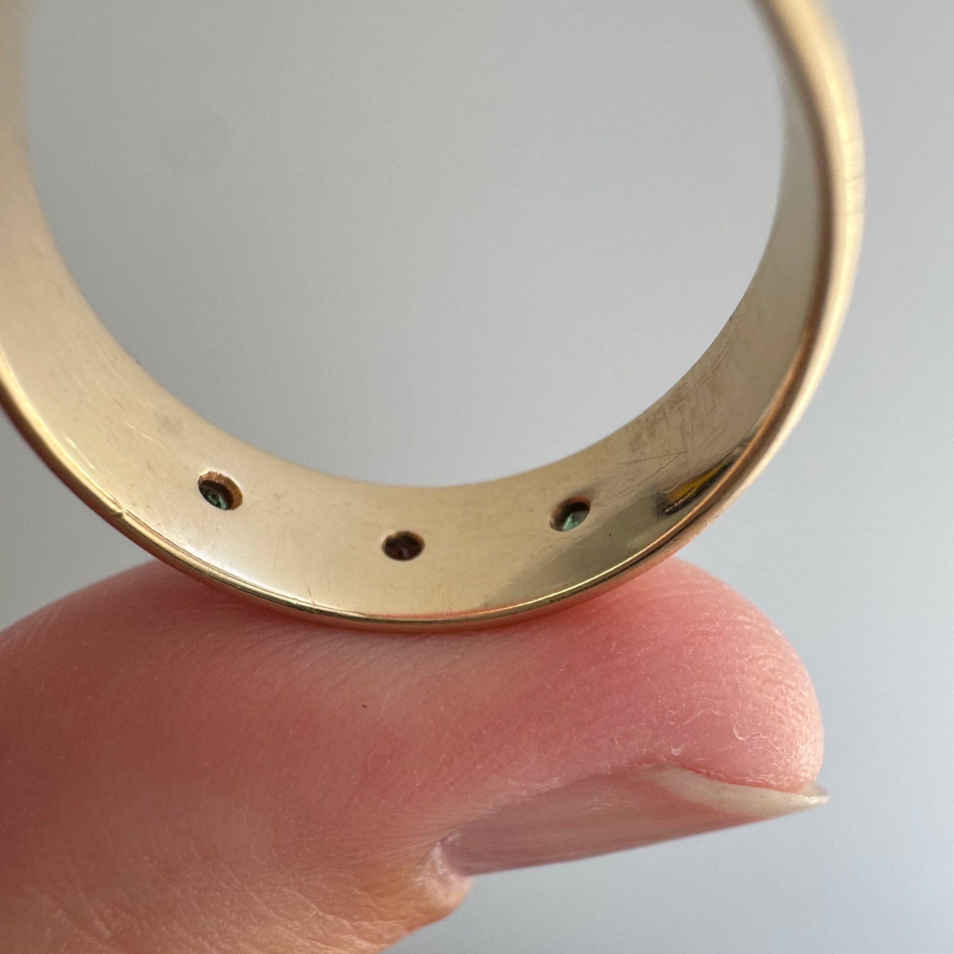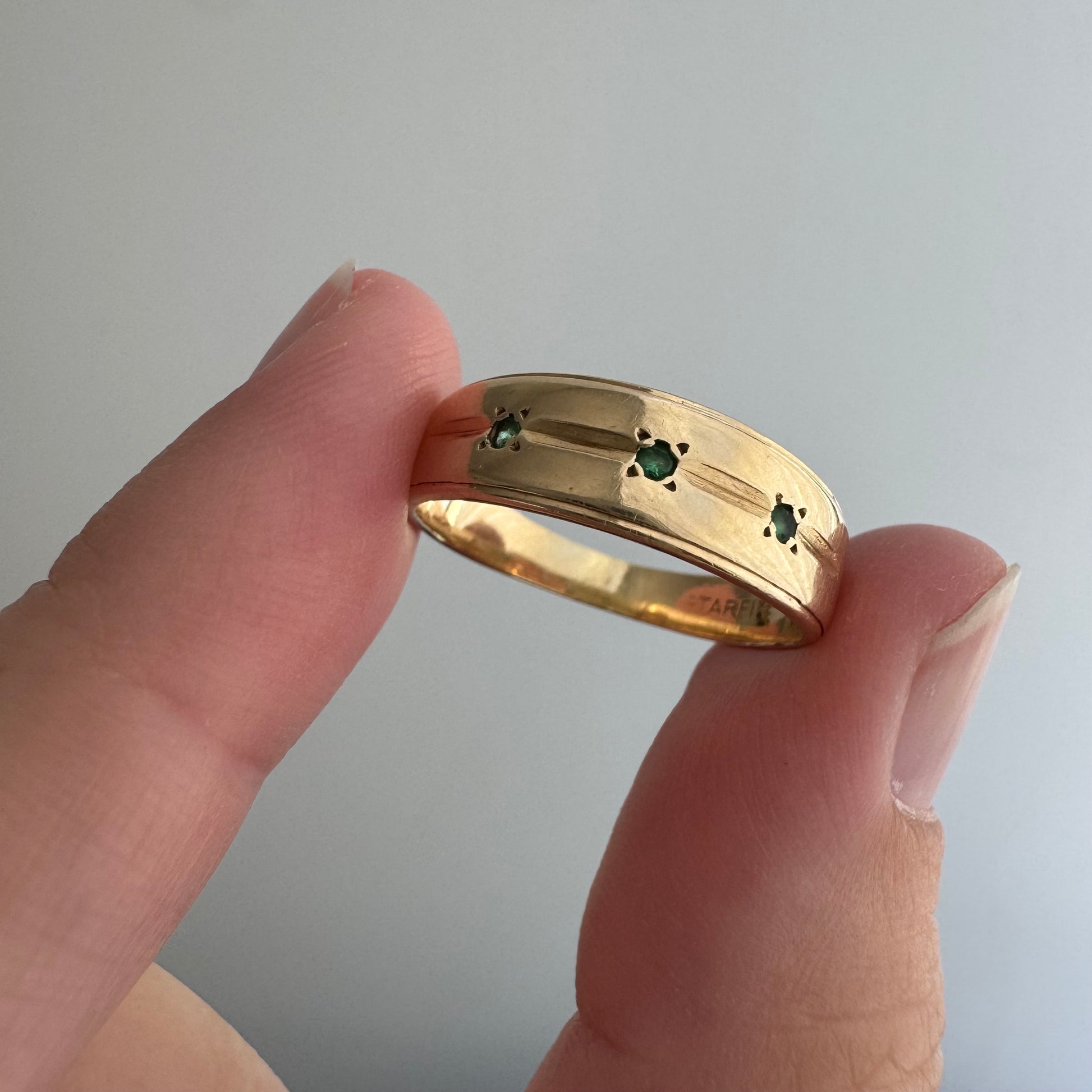 it's a rare treat to find a vintage band with its original emeralds and this one has three sweet, worn emeralds in flush-ish settings with setting details that are reminiscent of a four point star. the band is tapered, which offers the look of a wide band, but without as much finger coverage, which is a nice option for those of us with skin that doesn't like full contact with a flat surface.