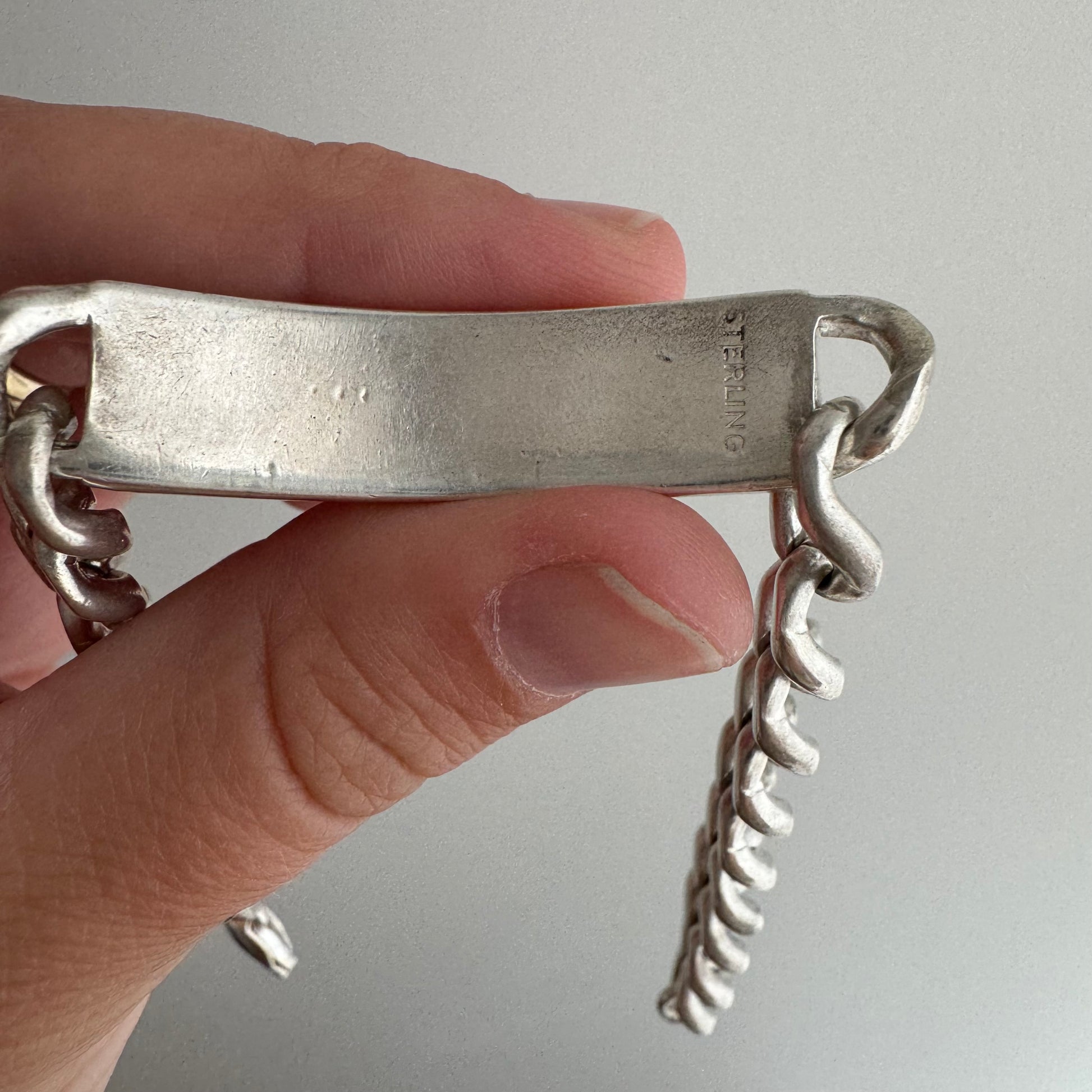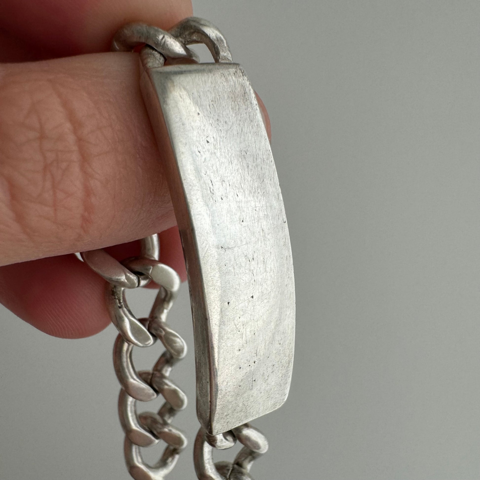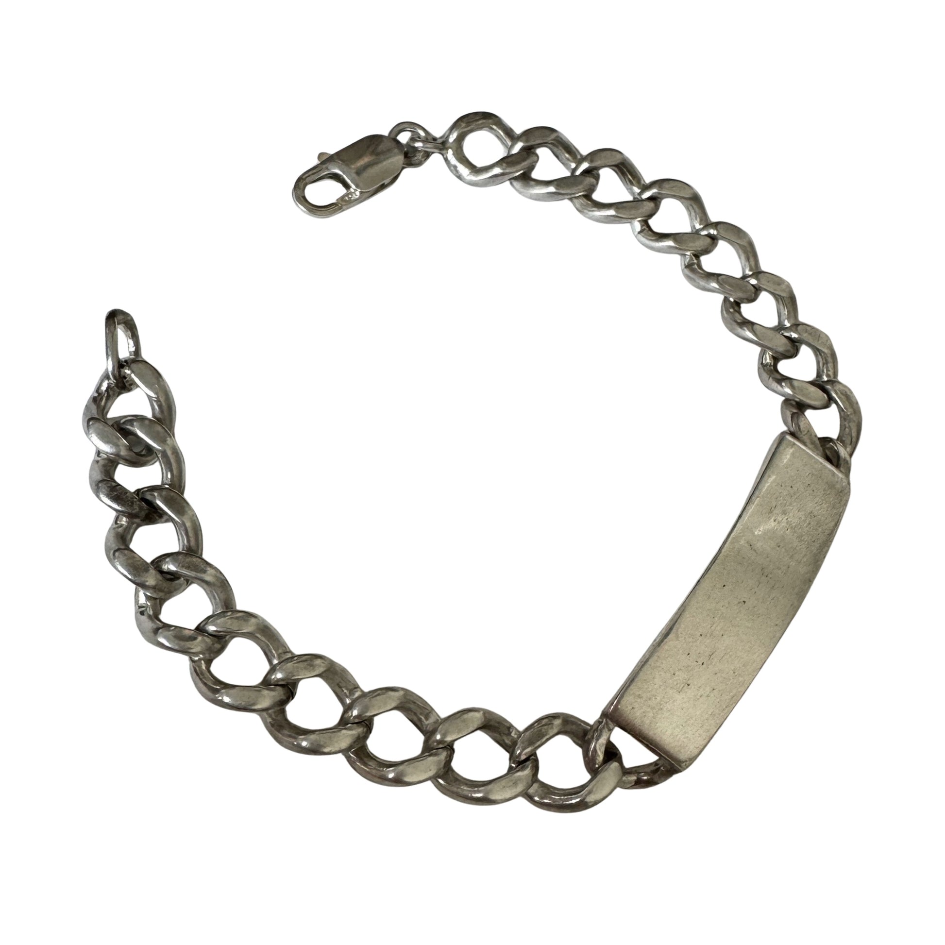 some designs are truly timeless and this is one of them. a sturdy, classic, sterling silver ID bracelet with curved, rectangular panel and timeless curb chain. it once had engraving, but that's been mostly buffed away by a jeweler. the curb links are slinky, chunky perfection and the ID panel is nice and thick.