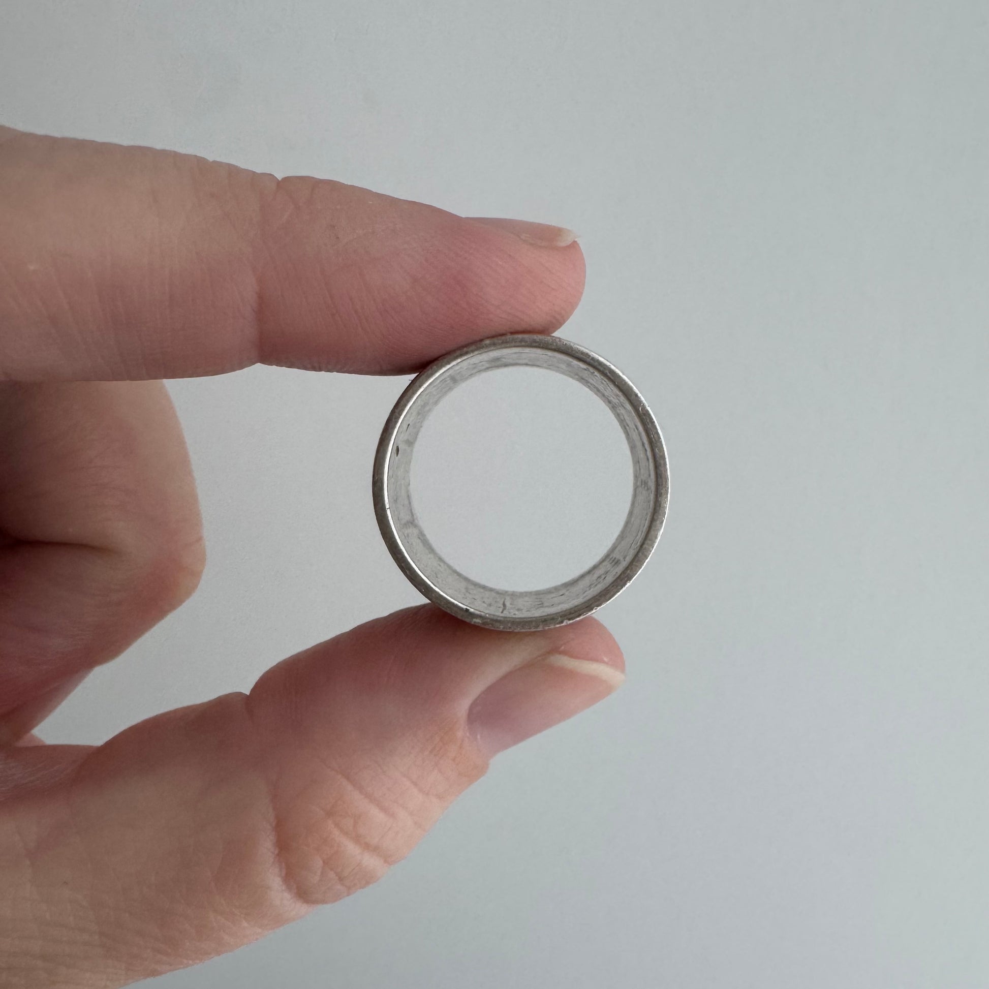 slides down to a size 7 on a sizing mandrel, but it will fit much smaller because of the width