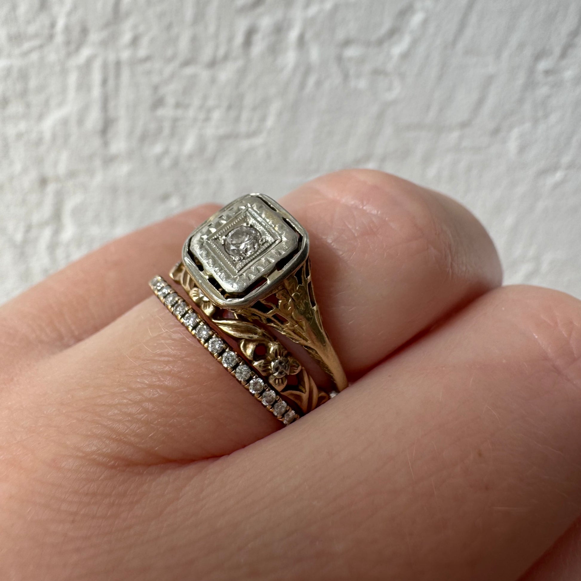what a treat to stumble upon a late art deco solitaire that carries design elements of edwardian, art deco, and art nouveau jewelry. the face's square setting is inspired by Edwardian era settings, while the asymmetric floral filigree nods toward art nouveau whimsy. the diamond is an older cut with fewer facets, but it sparkles beautifully in good lighting