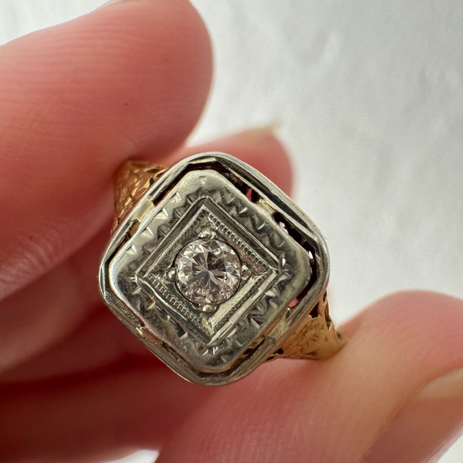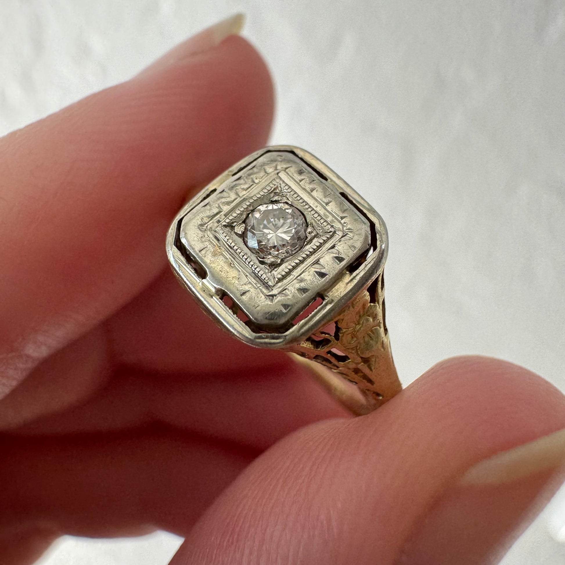 A N T I Q U E // floral geometry / 14k yellow and white gold late art deco diamond solitaire / size 4.5