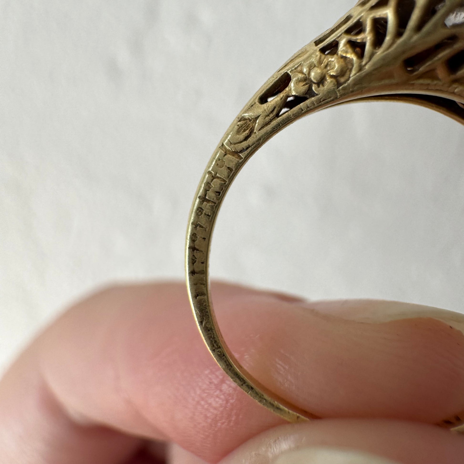 -the white gold setting would have featured crisp hand engraving, but it's faded significantly, as has the engraving that would have carried through on the edges of the band