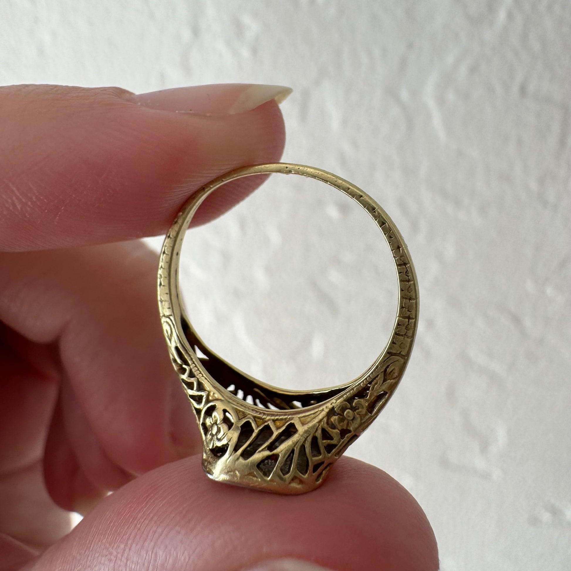 -there's a minor dent on the side wall of the filigree close to where the shoulder meets the band, which is very hard to notice and doesn't seem to be impacting structural integrity