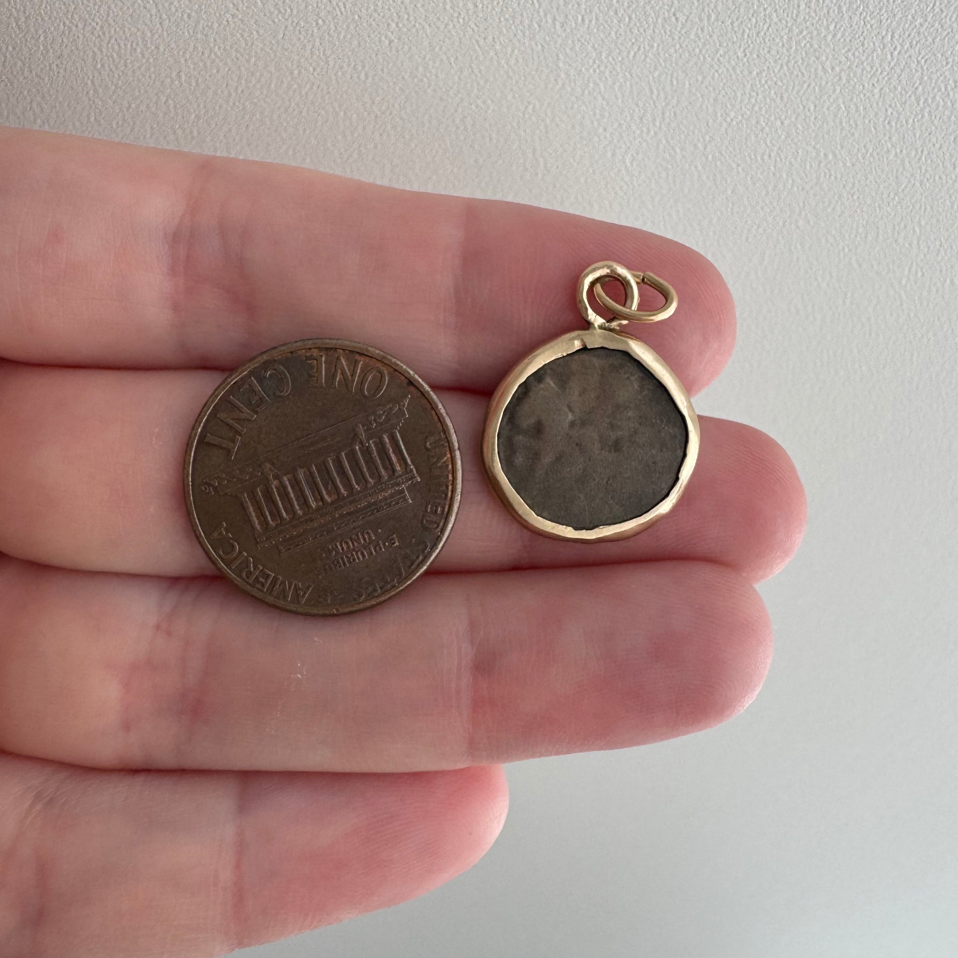 looking for something old, full of presence and character? how about a Roman bronze coin set in a 10k bezel? the coin is very very worn, but seems to be a Kainon Sicily Alaisa coin, though this is based in internet sleuthing, not expert coin identification. it's hard to imagine a bezel this old holds a coin that isn't authentic, but who knows!