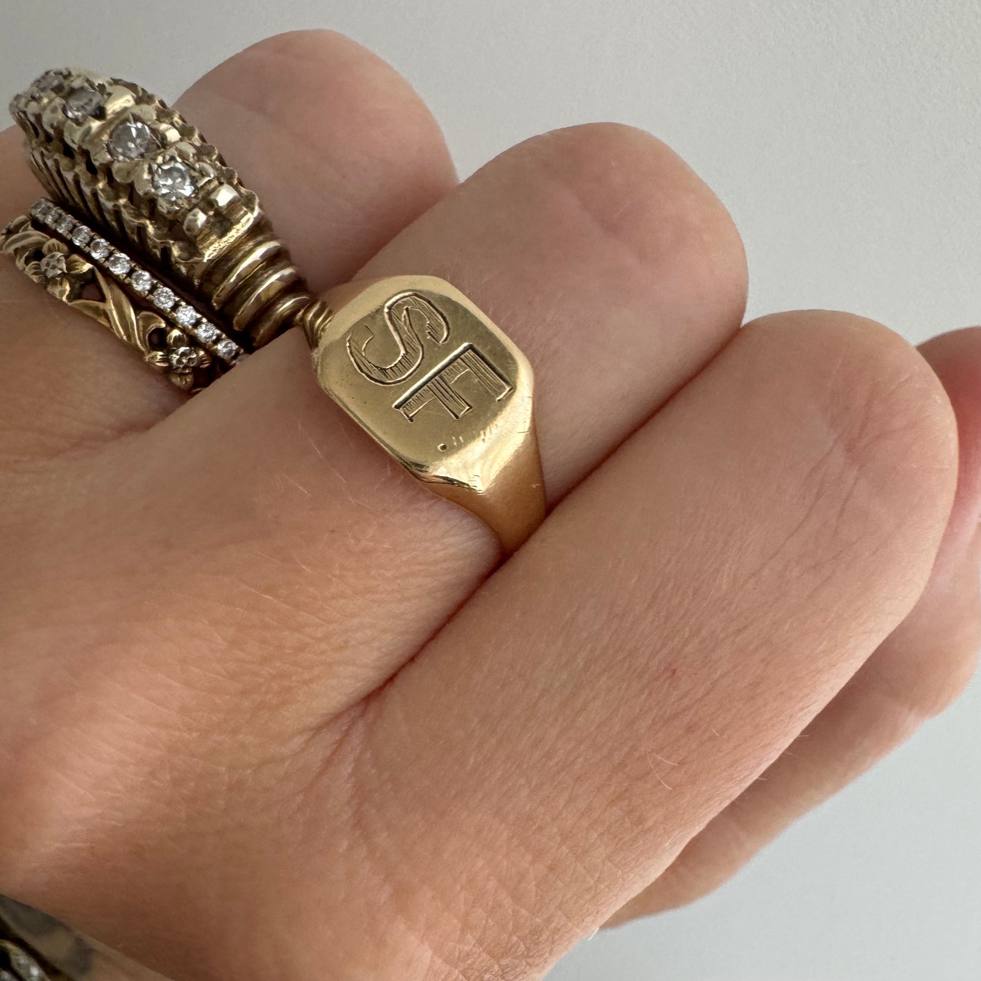 this dream is a wonder. it's a true antique, yet it's yellow gold, which is a rare treat. the SF initials were hand engraved and have wonderful character.