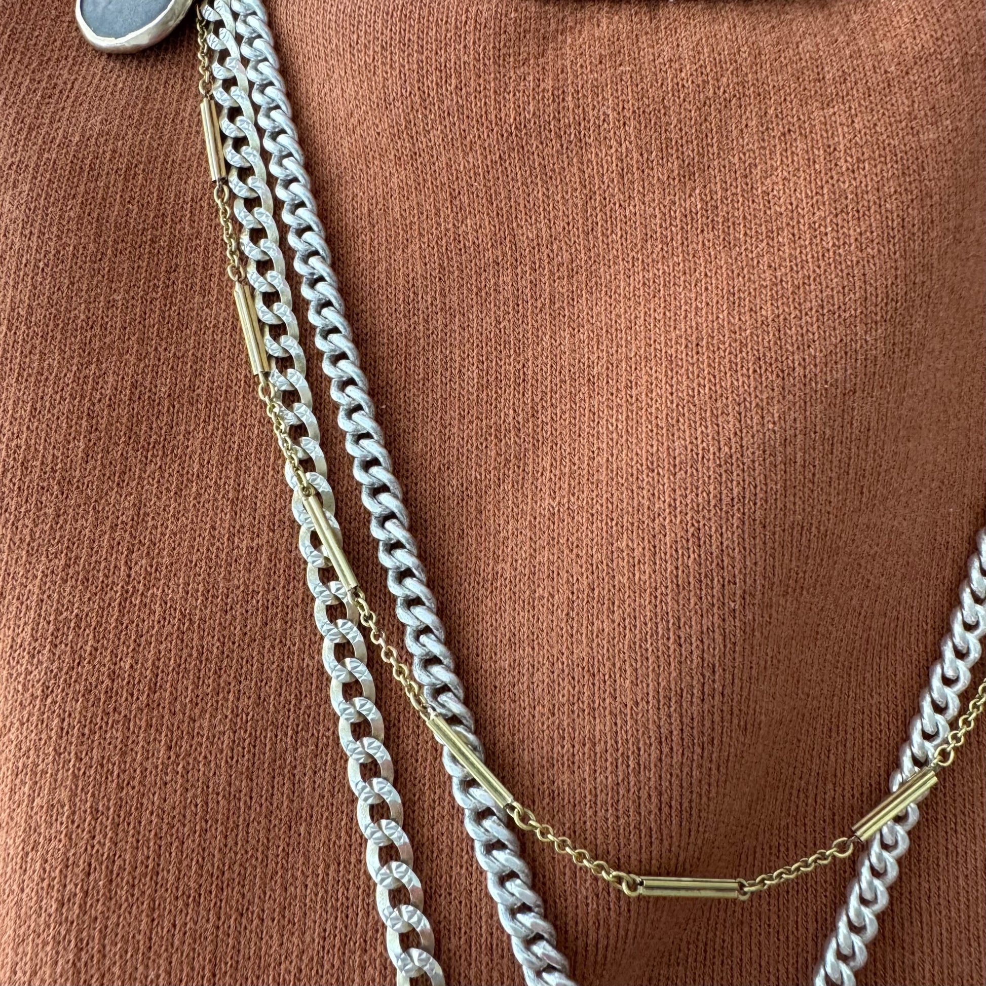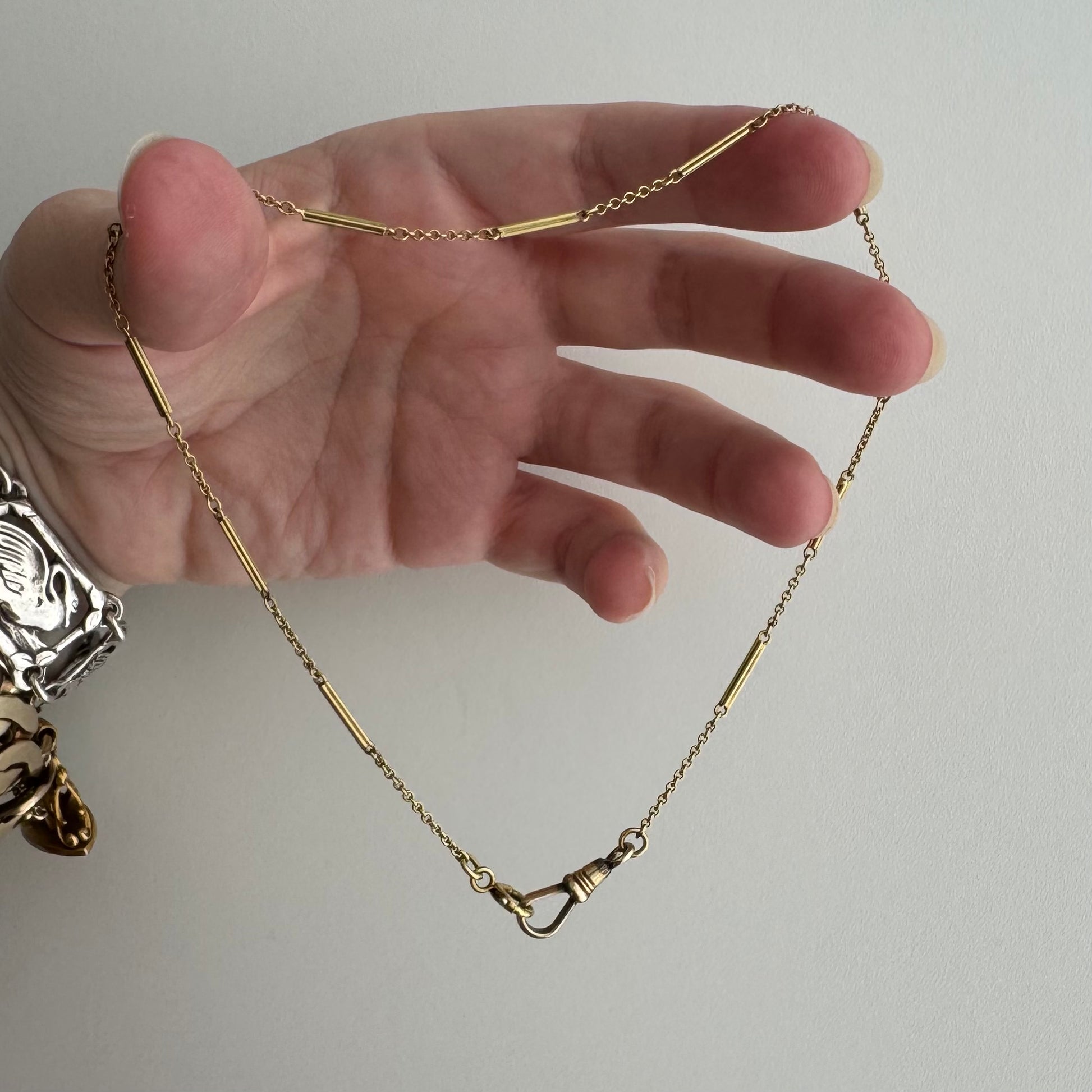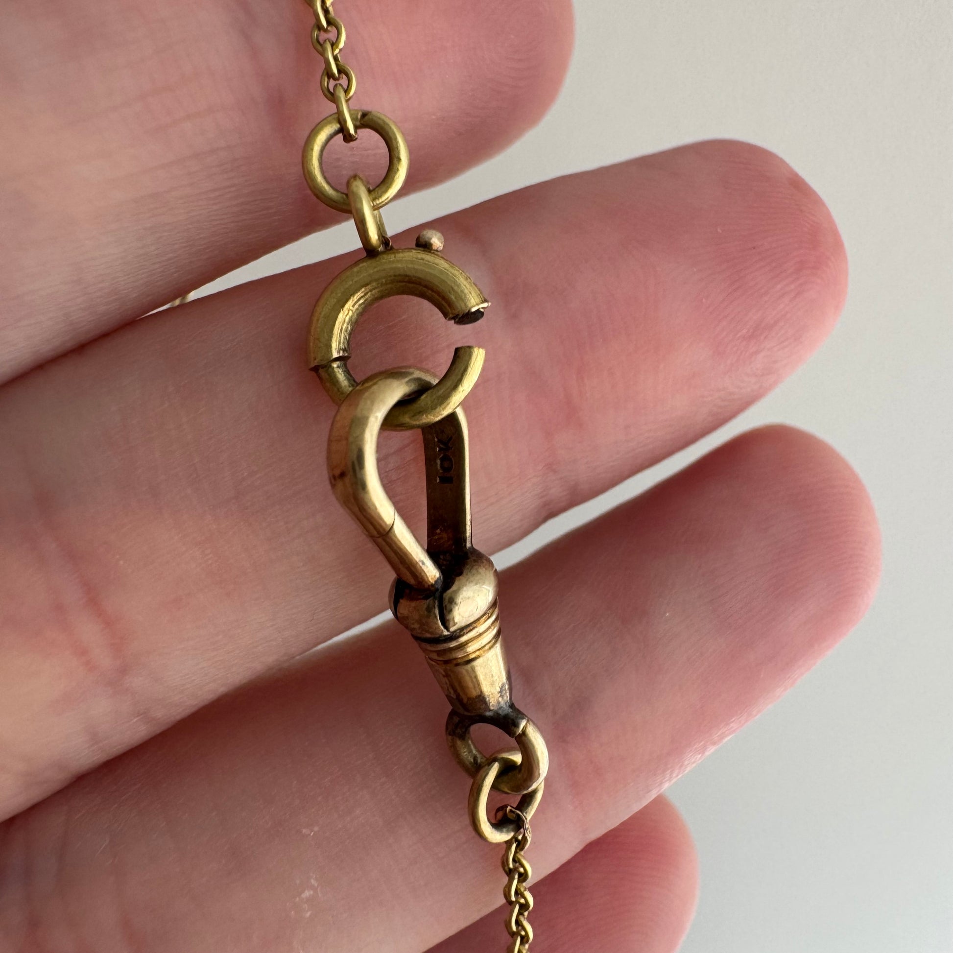 an increasingly hard-to-find antique watch chain in true yellow gold, with original dog clip and a smaller spring ring clasp (both are marked 10k). It's a shorter length, making it a great candidate for a chain extender, combining with another short watch chain, or if you have a smaller wrist it could be doubled up as a wonderful bracelet.