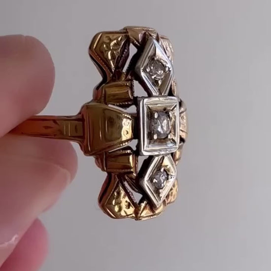 almost Antique 14k yellow and white gold shield ring with three diamonds