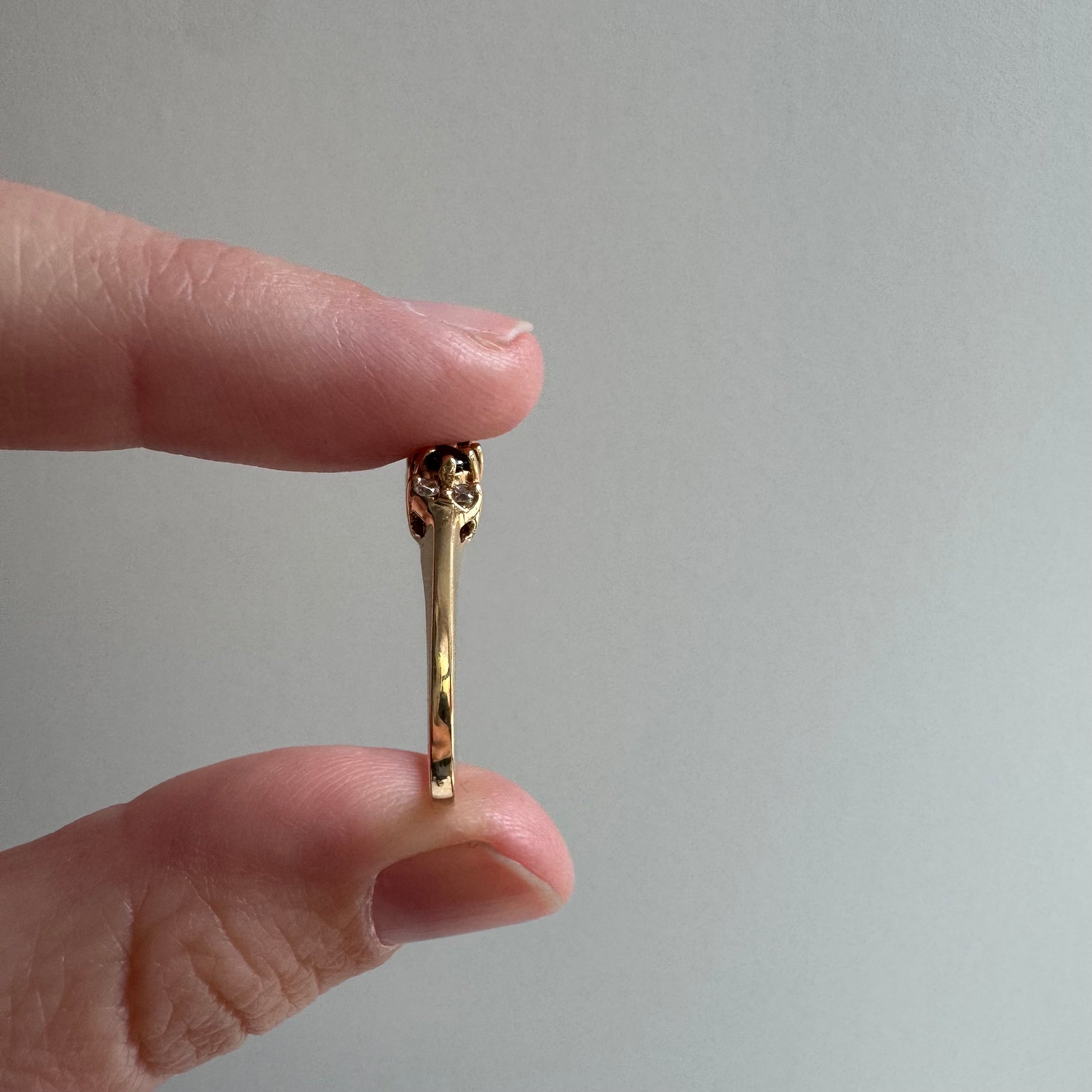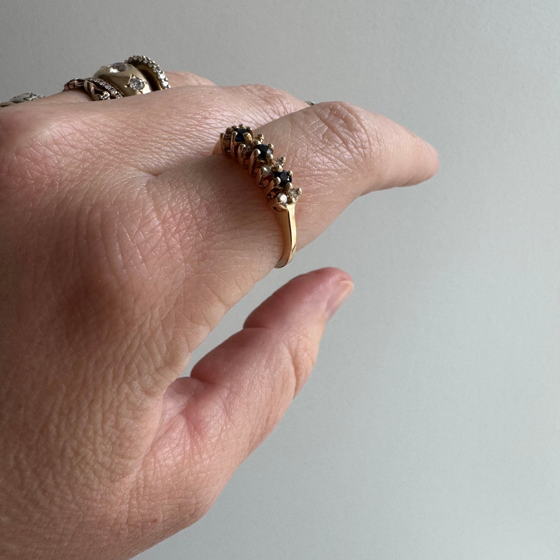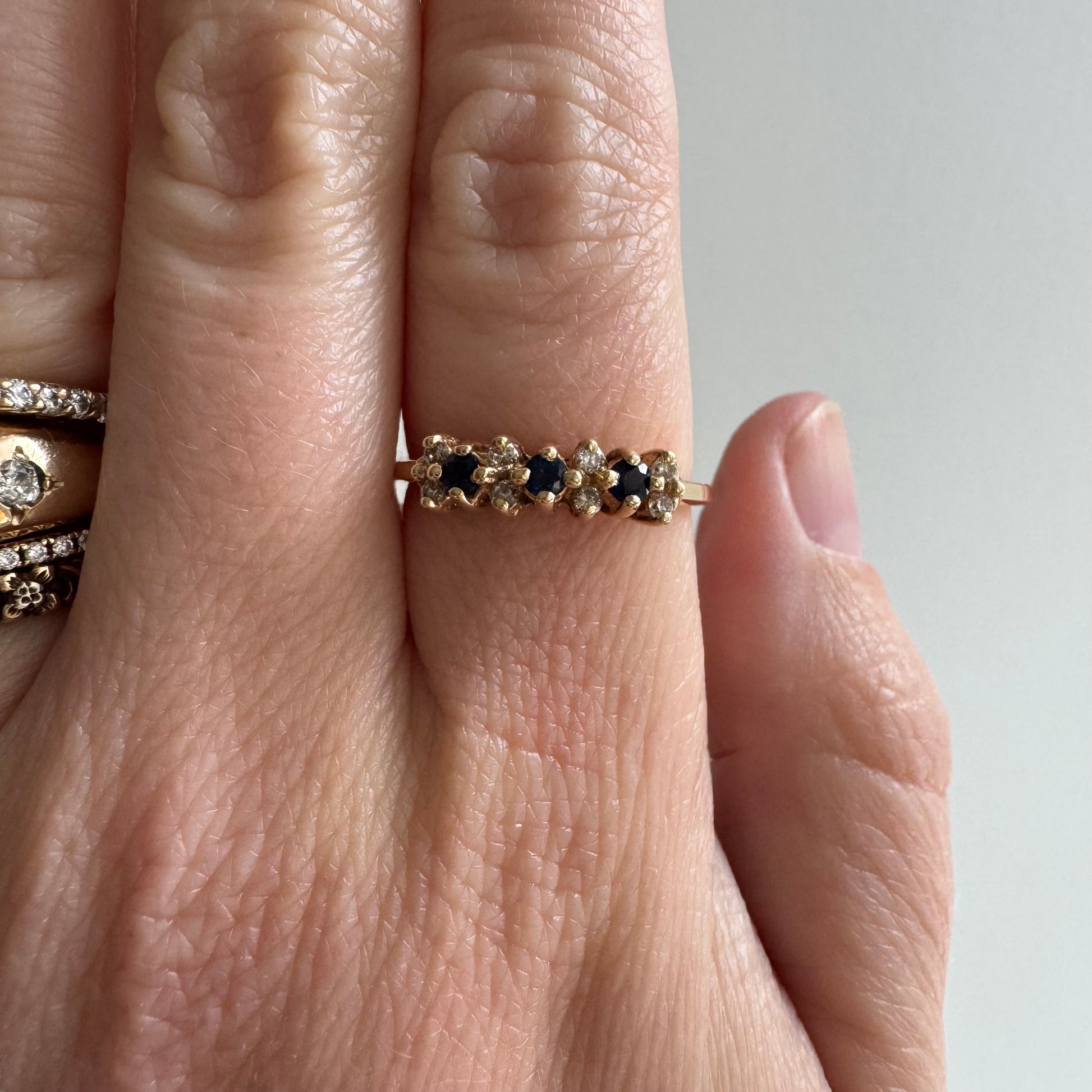 is this beauty vintage? hard to tell, but it's a great raised stackable cluster band featuring a trilogy of sapphires and an assortment of diamonds.