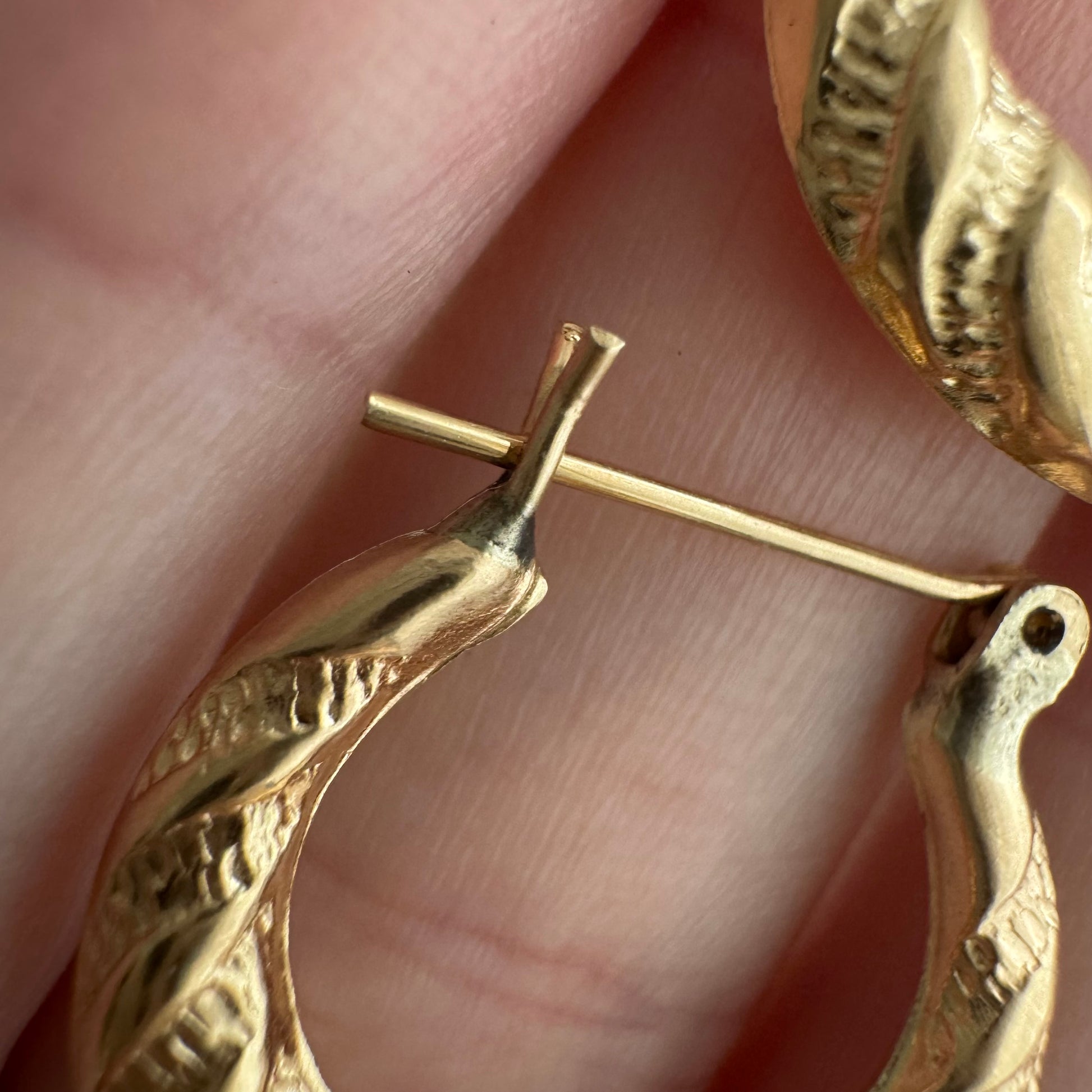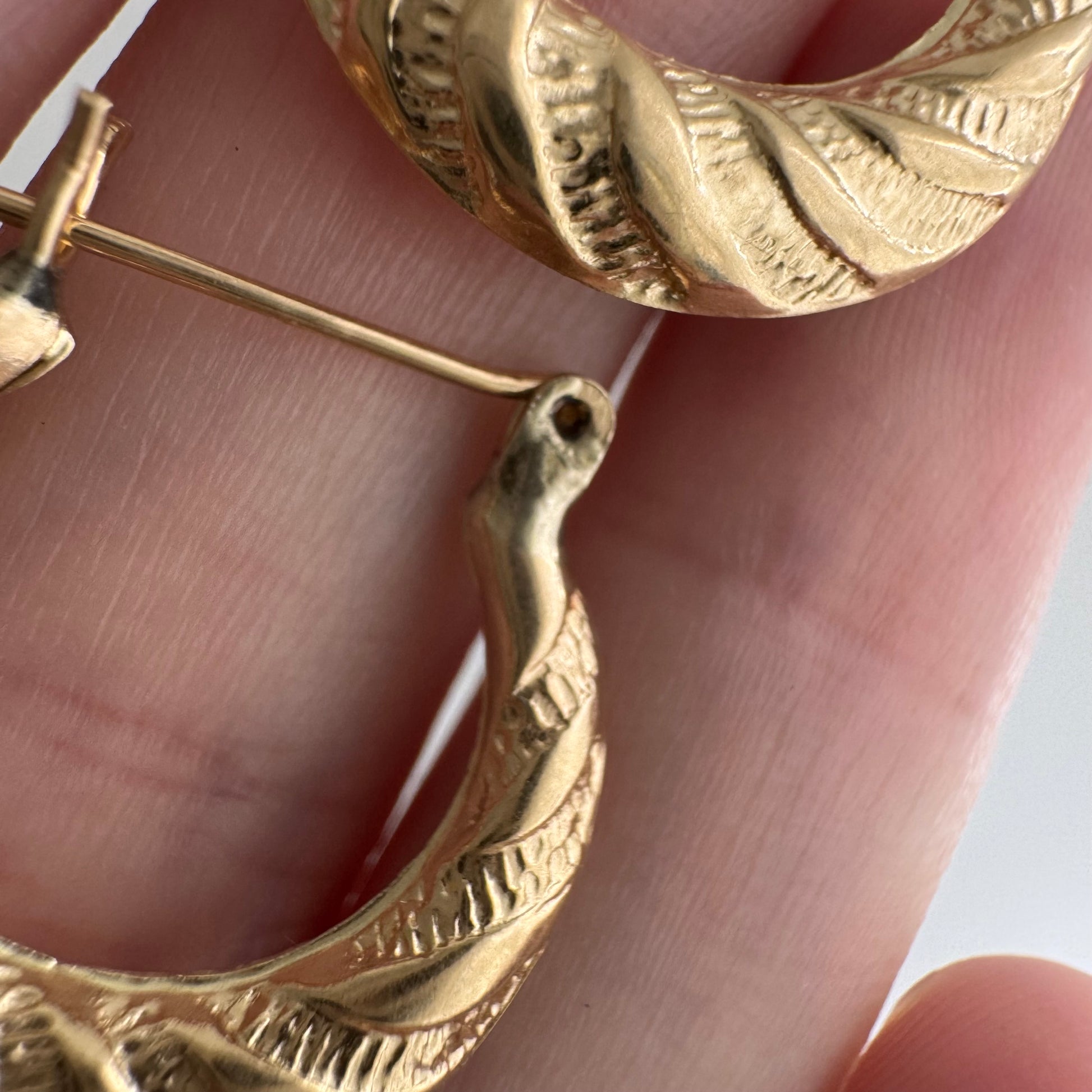 -one of the hoops has a slight angle between the two sides of the ear wire, which means the croissant's ends aren't perfectly level. this doesn't impact functionality or appearance when worn, but it's an original quirk worth noting