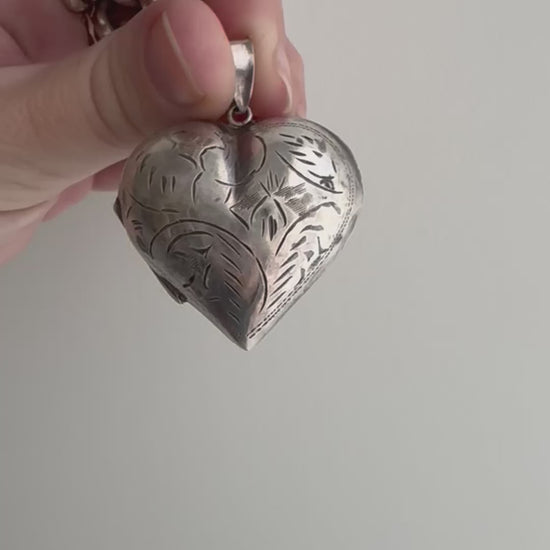 a sassy sterling silver extra plump/puffy heart locket pendant with engraving on both sides and some larger dents that are holding onto extra patina