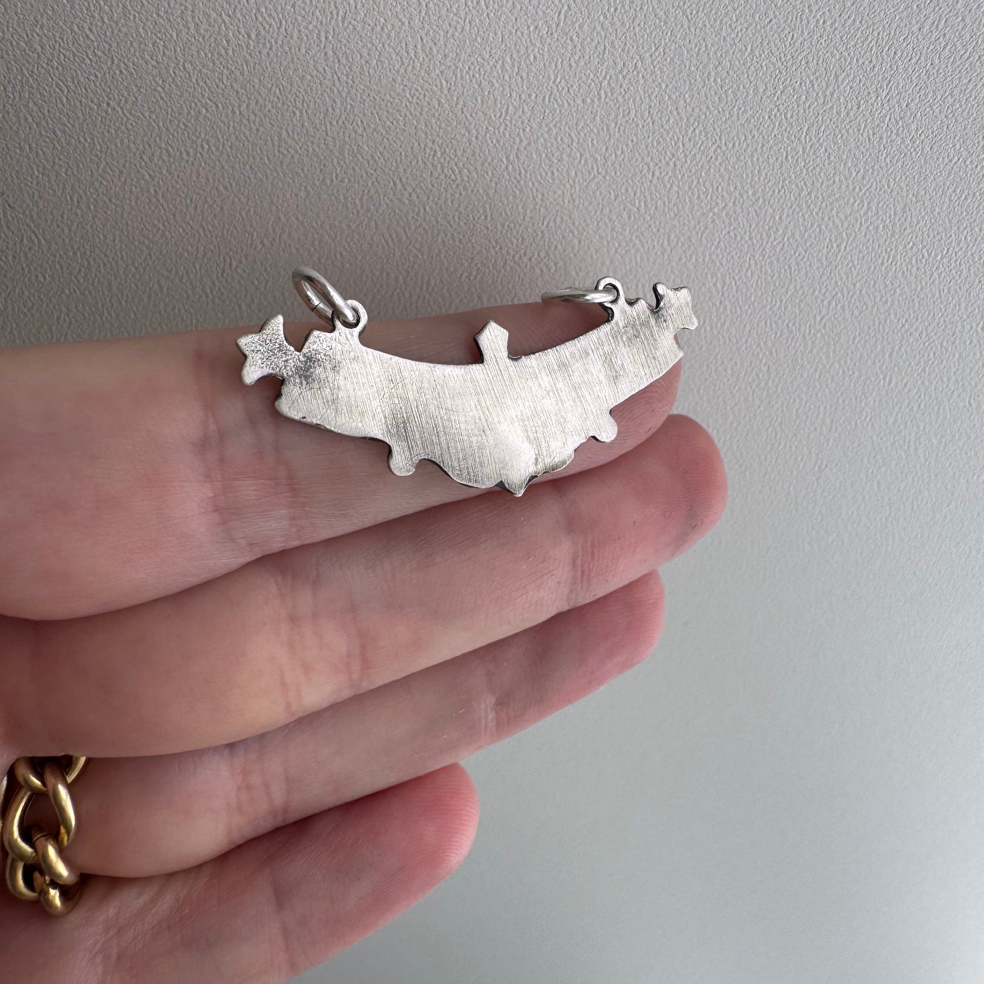 this pendant has two bails, neither of which are soldered shut, which offers plenty of styling possibilities: wear it on a chain as-is, position other tiny charms between the two bails on a chain, wear it with a clasp hooked into either end like a chain extender, and more!