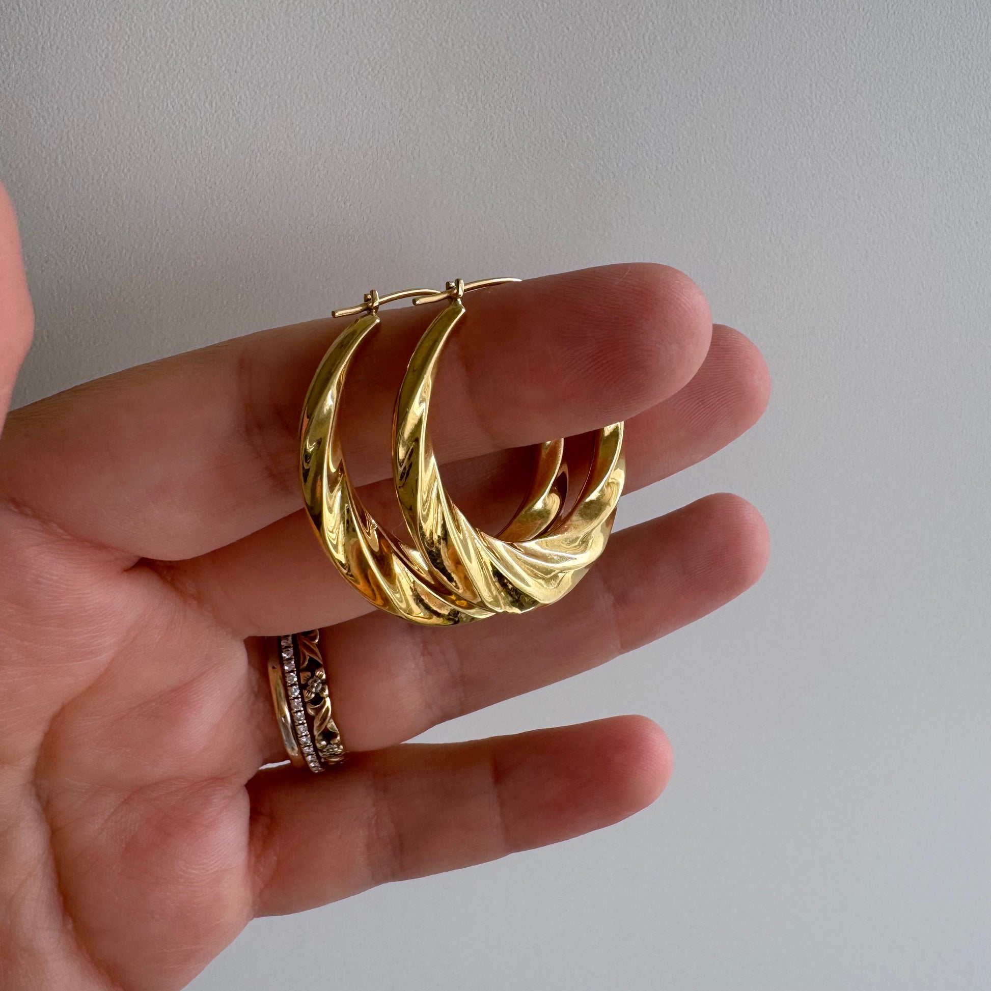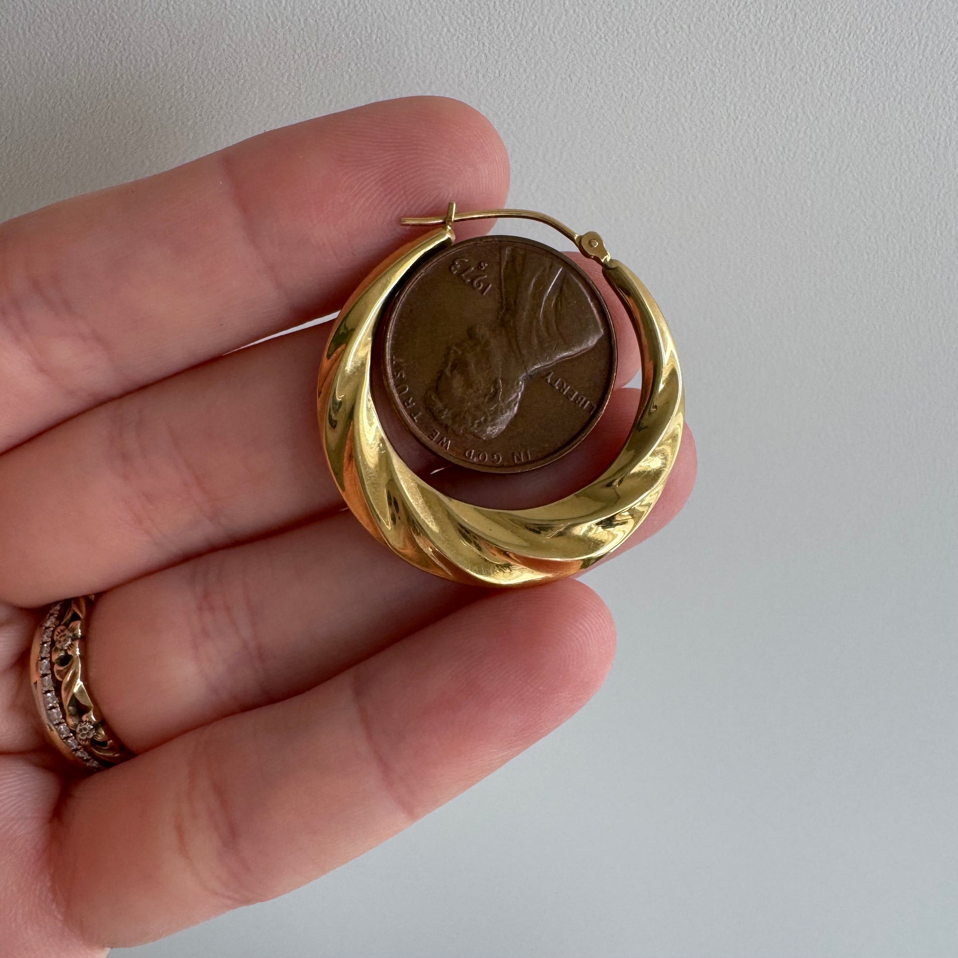 P R E - L O V E D // bright and shrimpy / 18k yellow gold hoops / over 1"