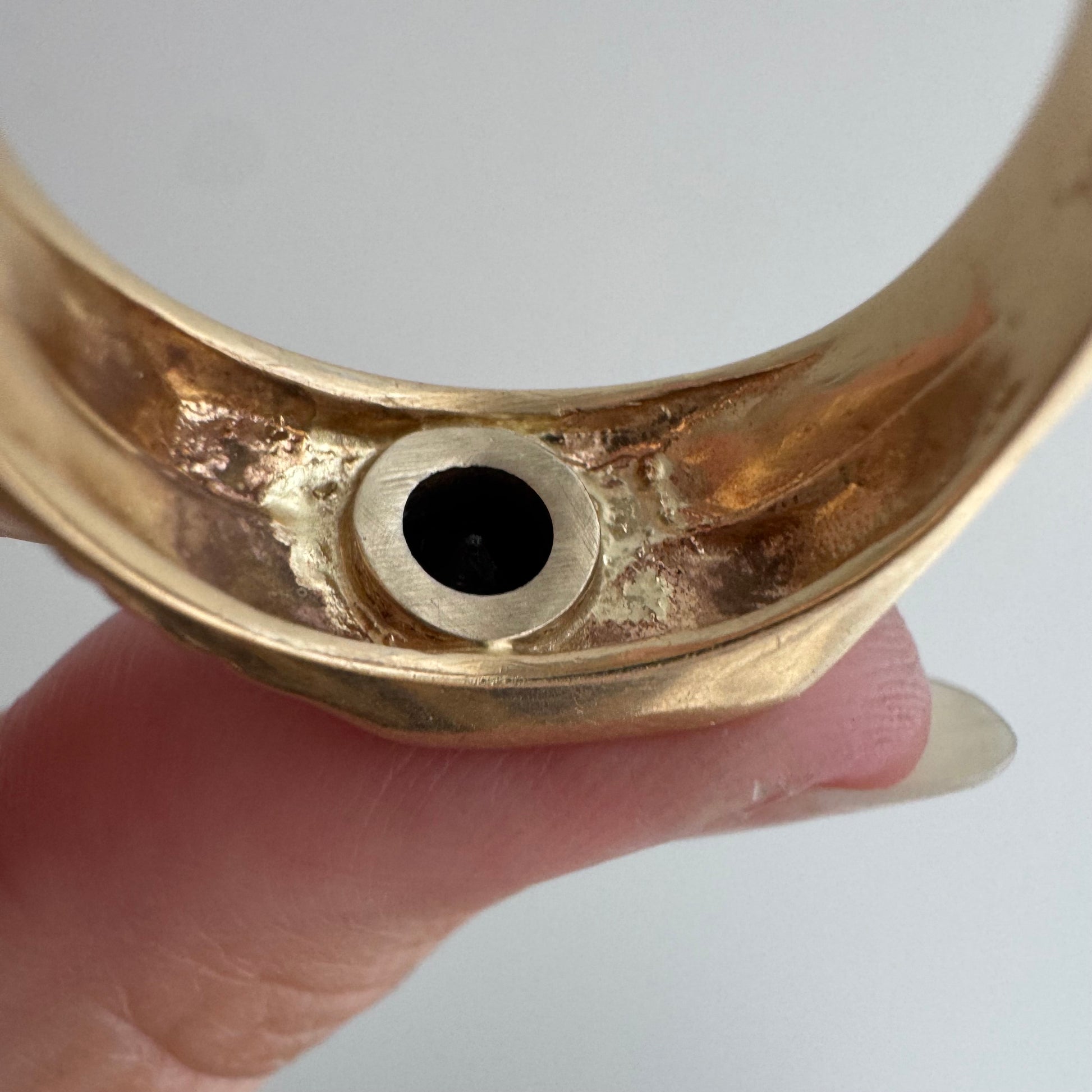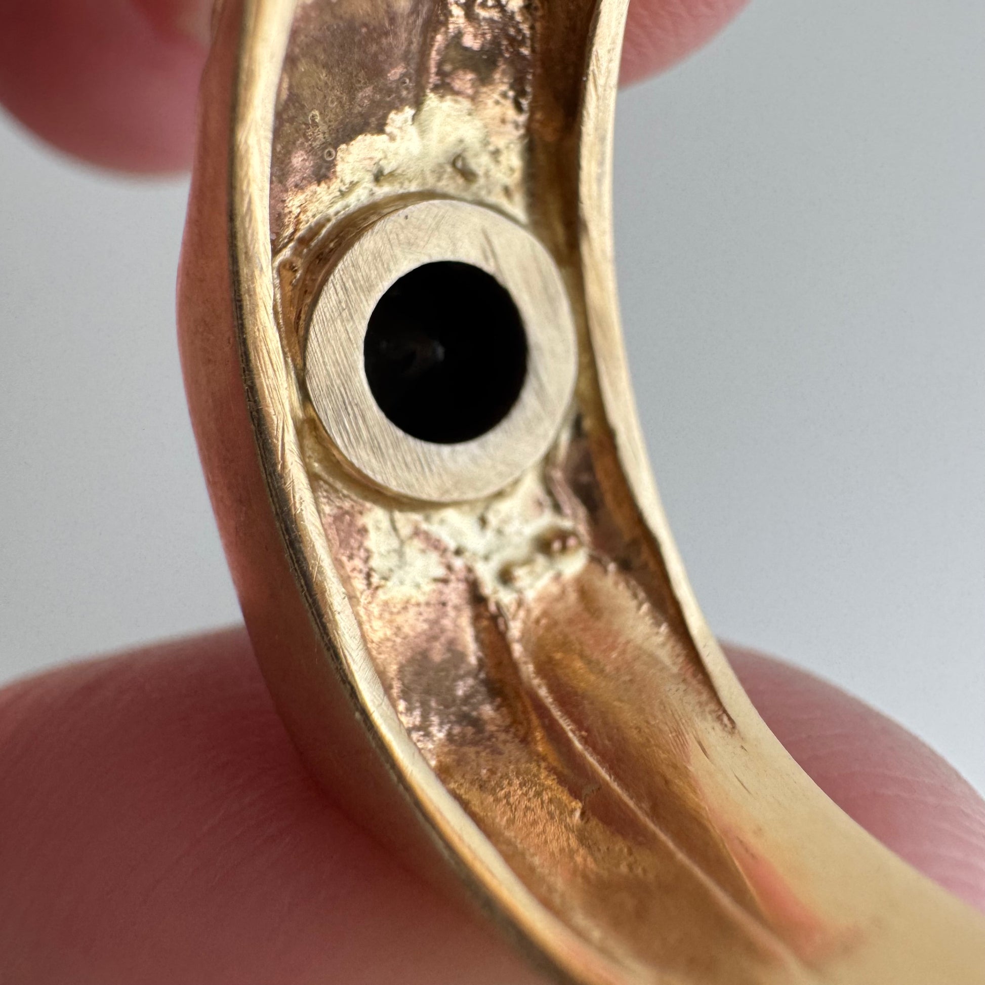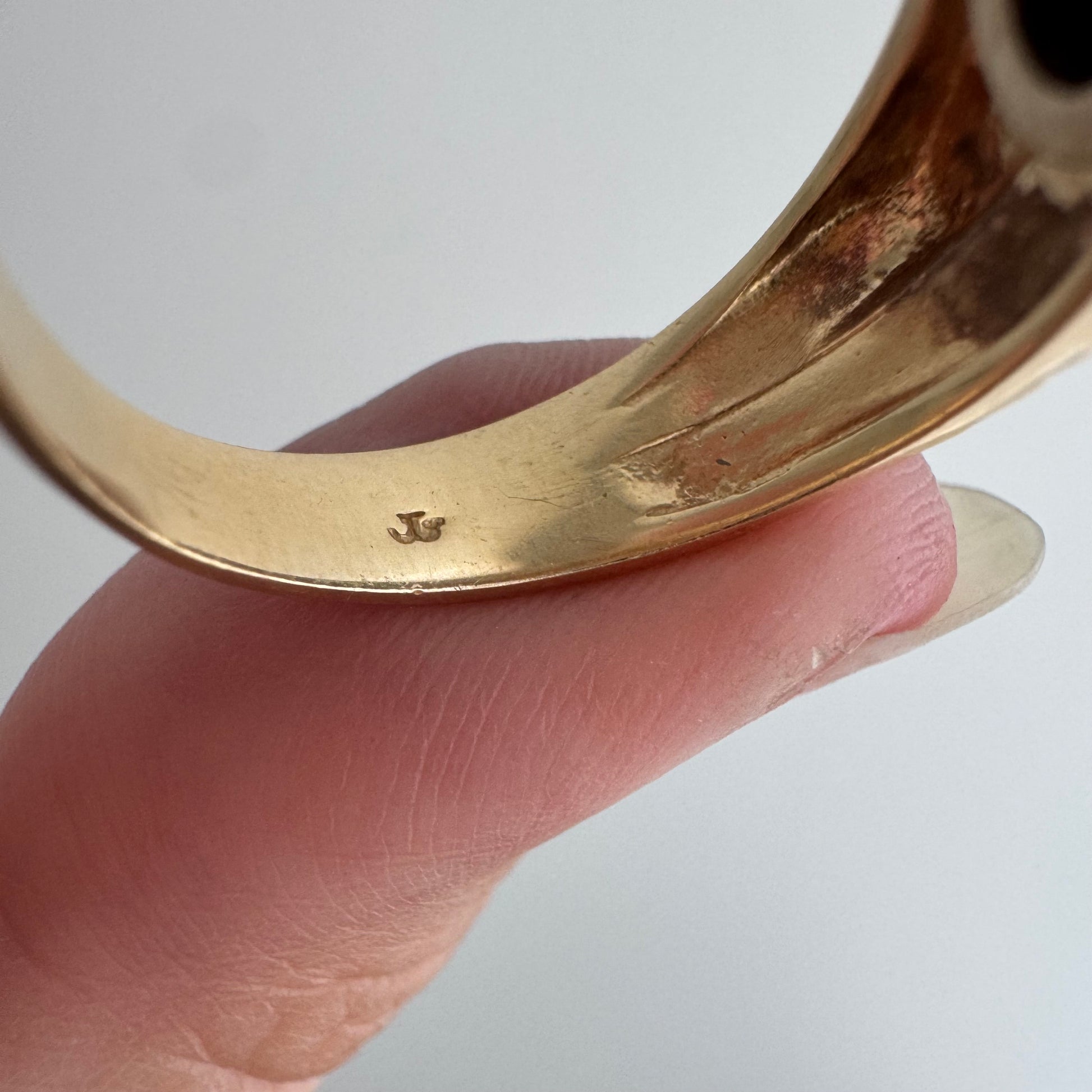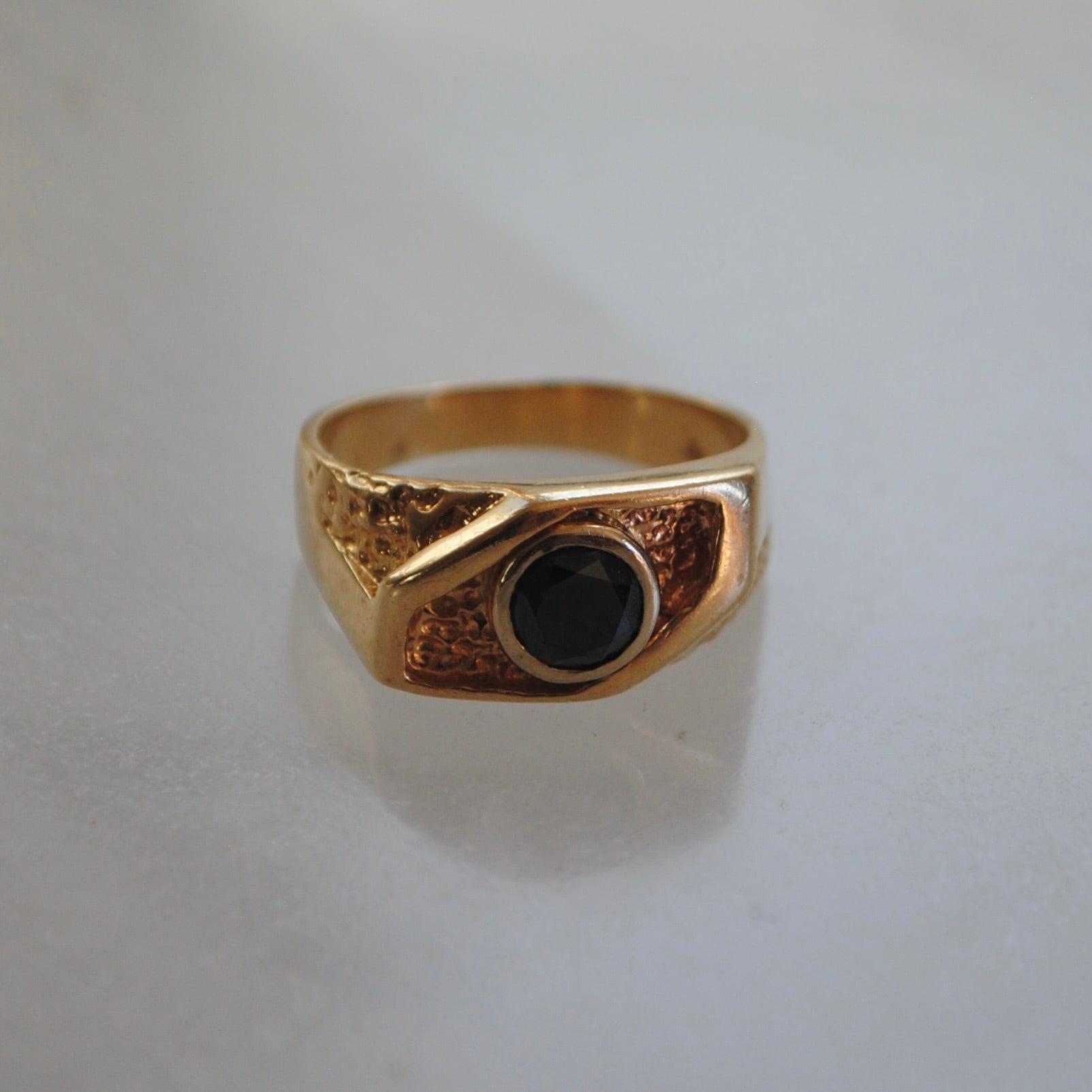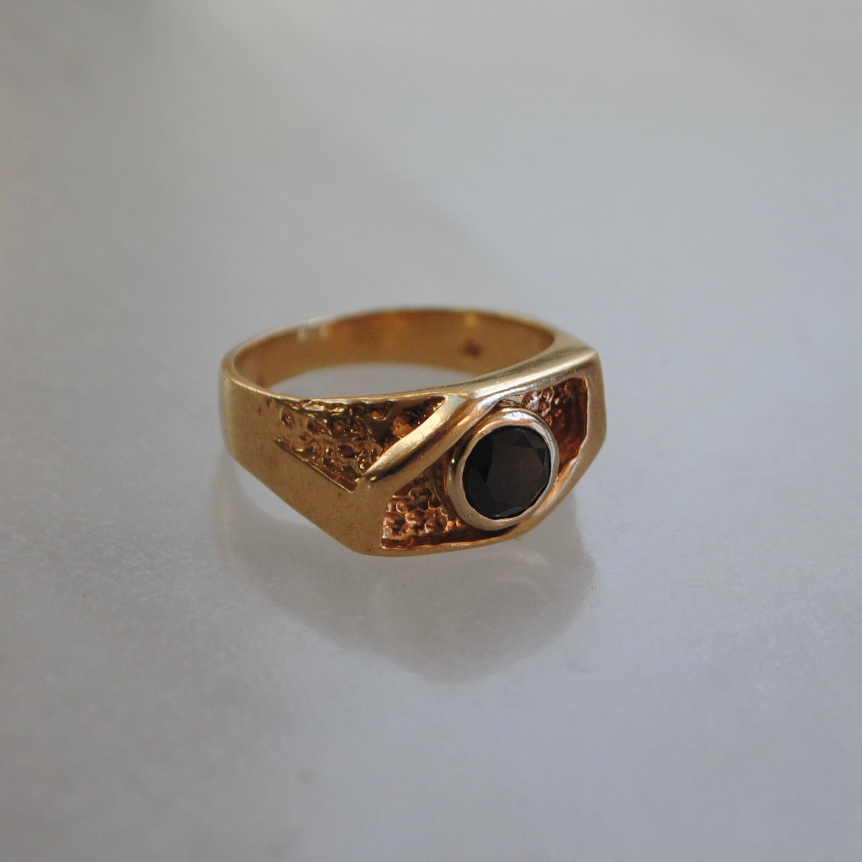 ugh, if only rings could tell us their tales. the provenance on this piece was lost to time, but it has a customized maker's mark that didn't turn up any hits via some internet sleuthing, which may mean the maker was likely smaller scale and less present on the internet. does it hint to a 1980s origin as the design would hint? maybe! is it more recent? possibly!