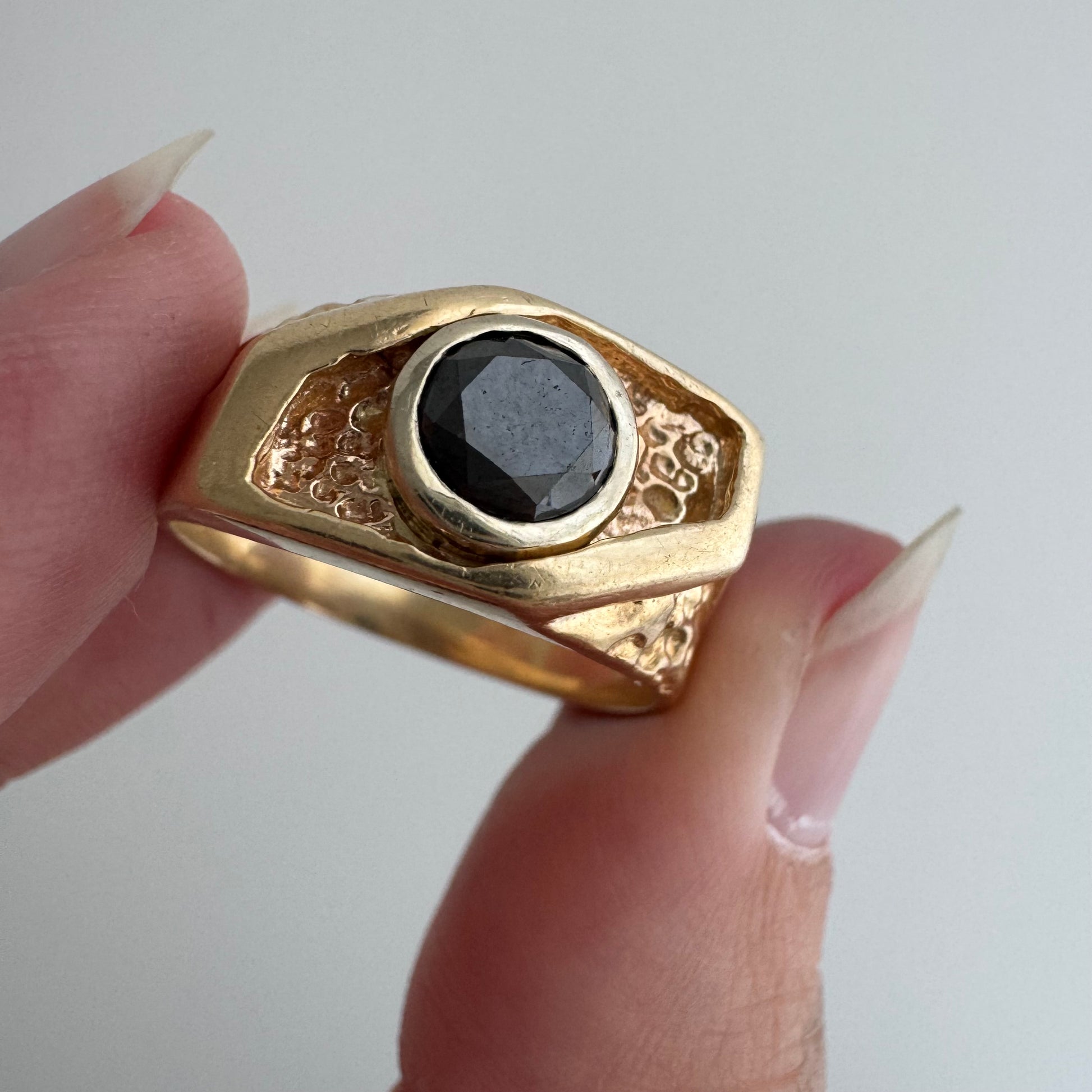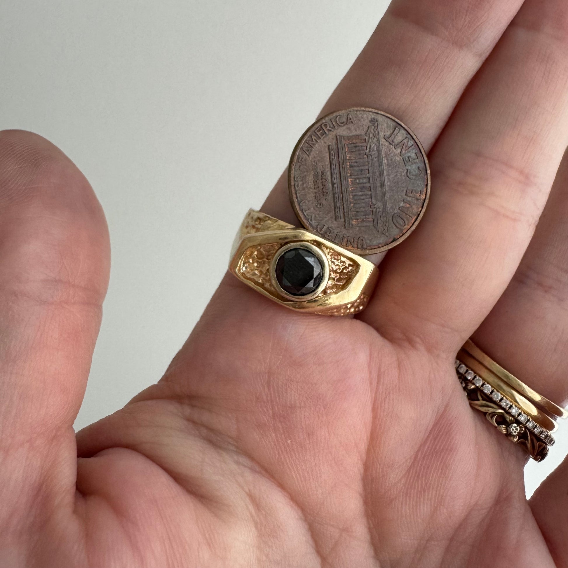 it's a dynamic design that's simultaneously an eye, a signet, a solitaire, a wide band, and a shadowbox setting and it features a sparkly statement-sized black diamond. yep, that's a diamond.