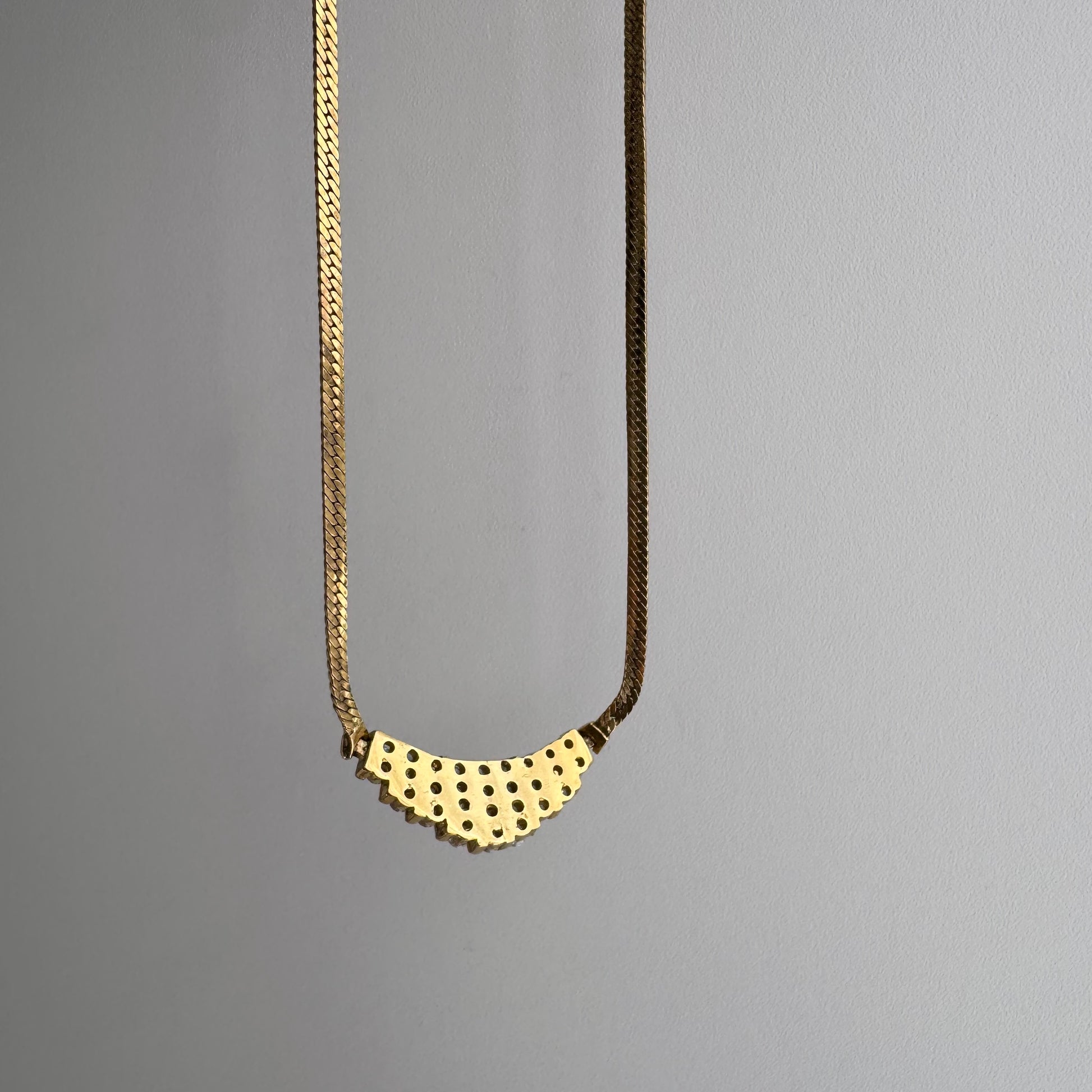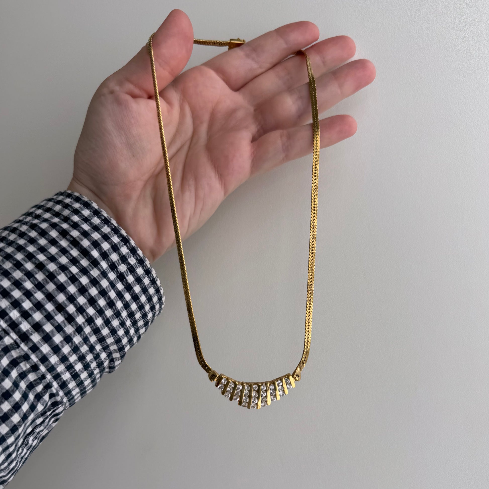 want to vibe of a $4k necklace, but for a tiny fraction of the price? Here's a pre-loved, likely vintage, chevron-esque version in gold plated sterling silver with CZ or glass 'stones' in channel settings with a herringbone chain that catches the light in all the right ways.
