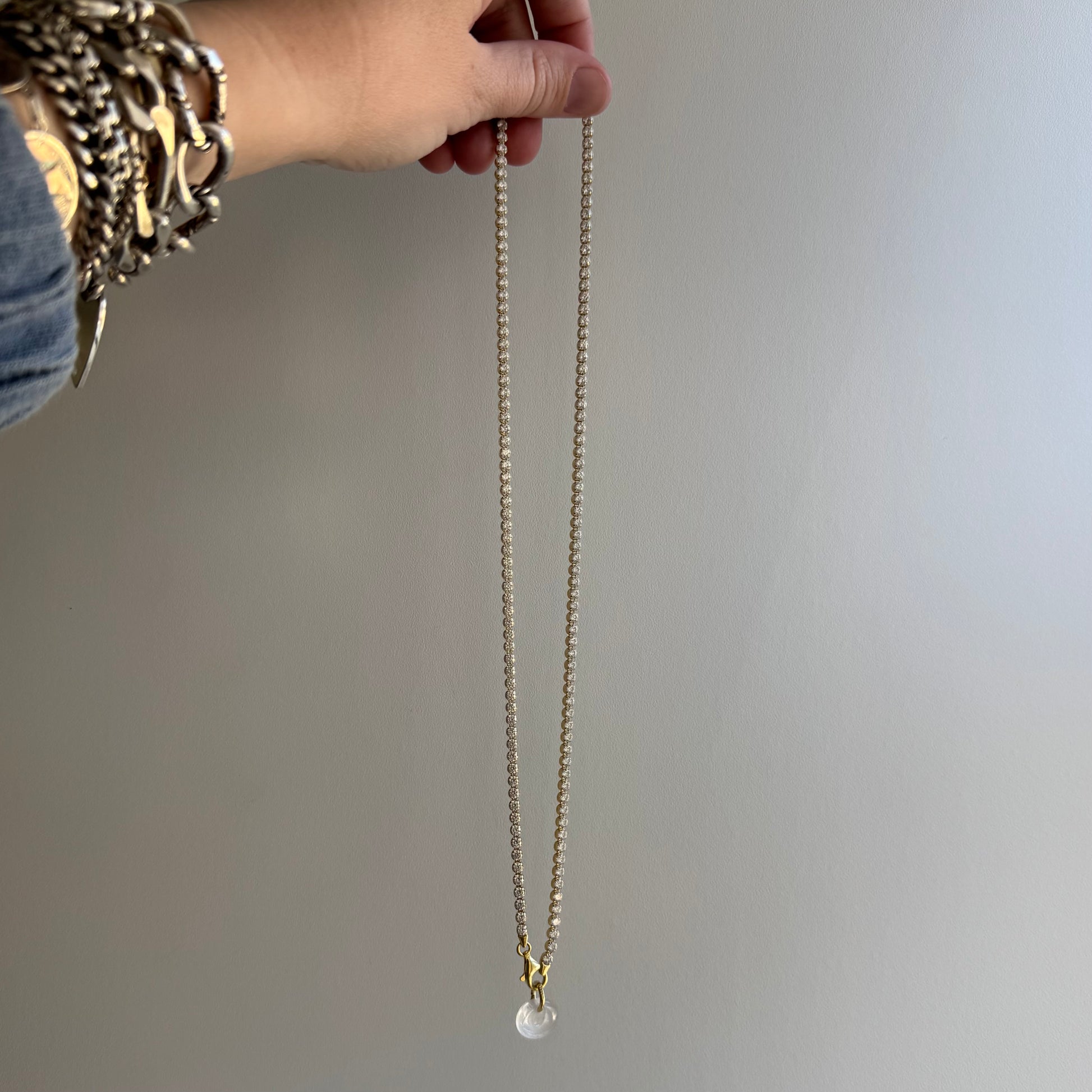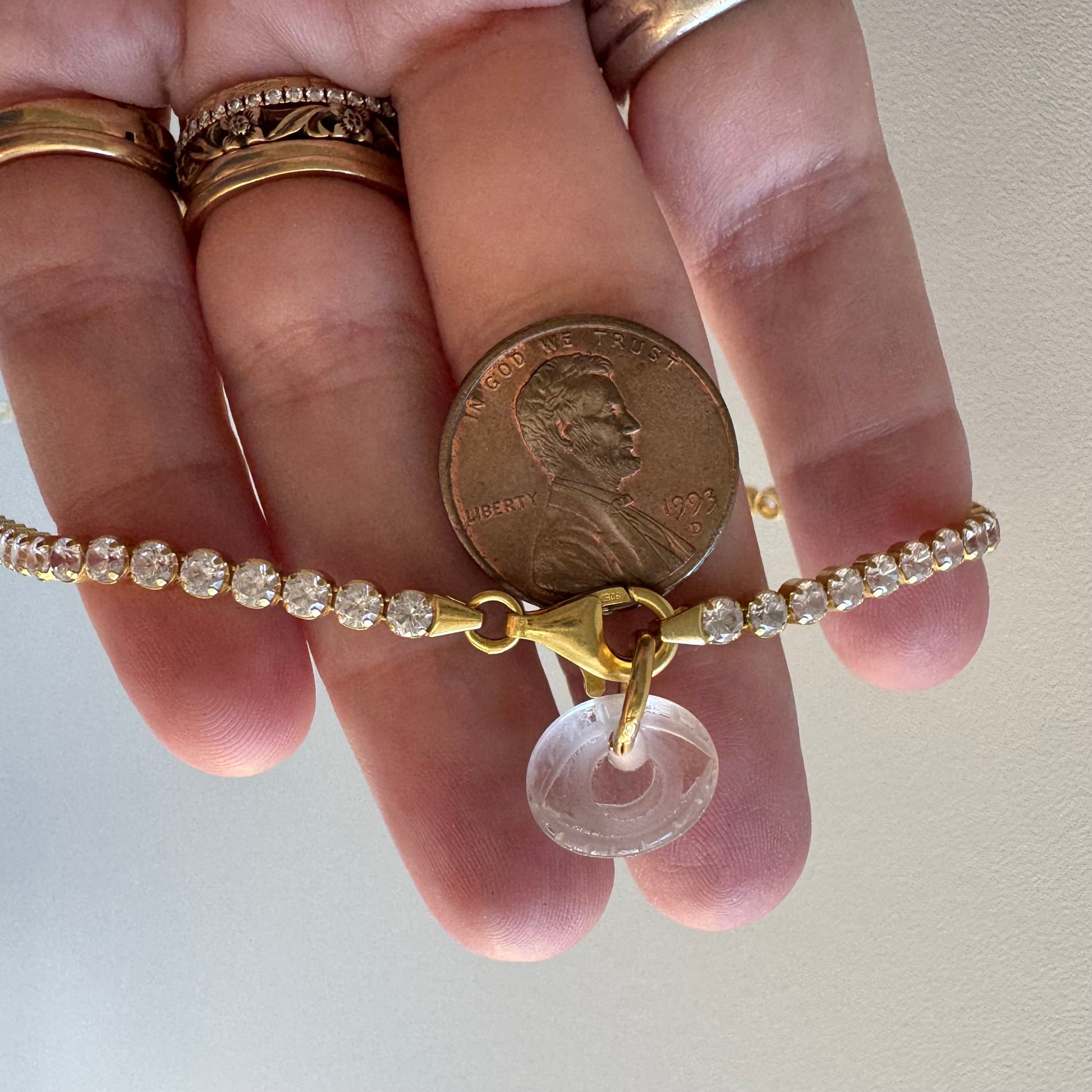 a riddle to solve: how is it possible that such a spectacularly sparkly CZ tennis necklace has almost no signs of wear? well, because the round settings are connected mid-stone, the necklace isn't weighted properly and if worn without a counter-weight the chain 'flips' exposing the under gallery of the settings. the easiest solve: using this carved quartz eye pendant as a counter weight on the clasp. honestly, when the eye is a counter weight on the clasp with the clasp at the back of the neck it still wants to flip slightly, but when worn with the clasp at the front of the neck as a pendant holder the stones stay right side up