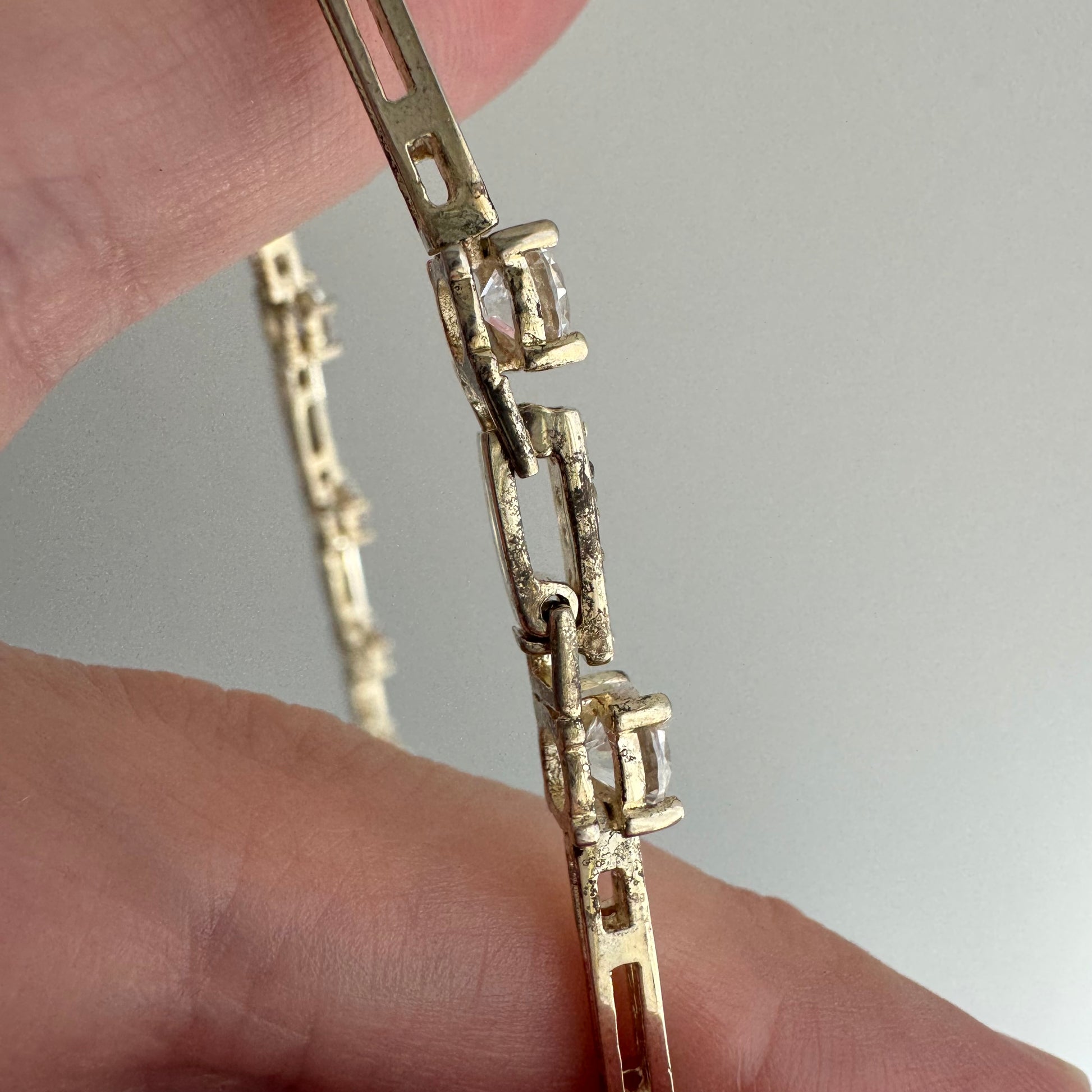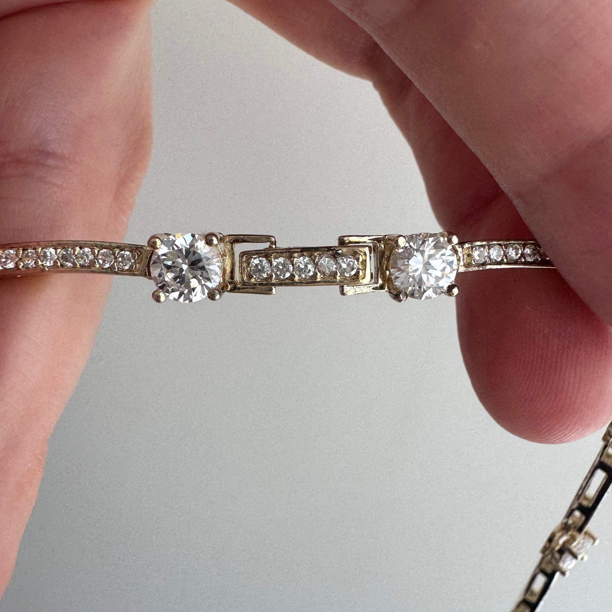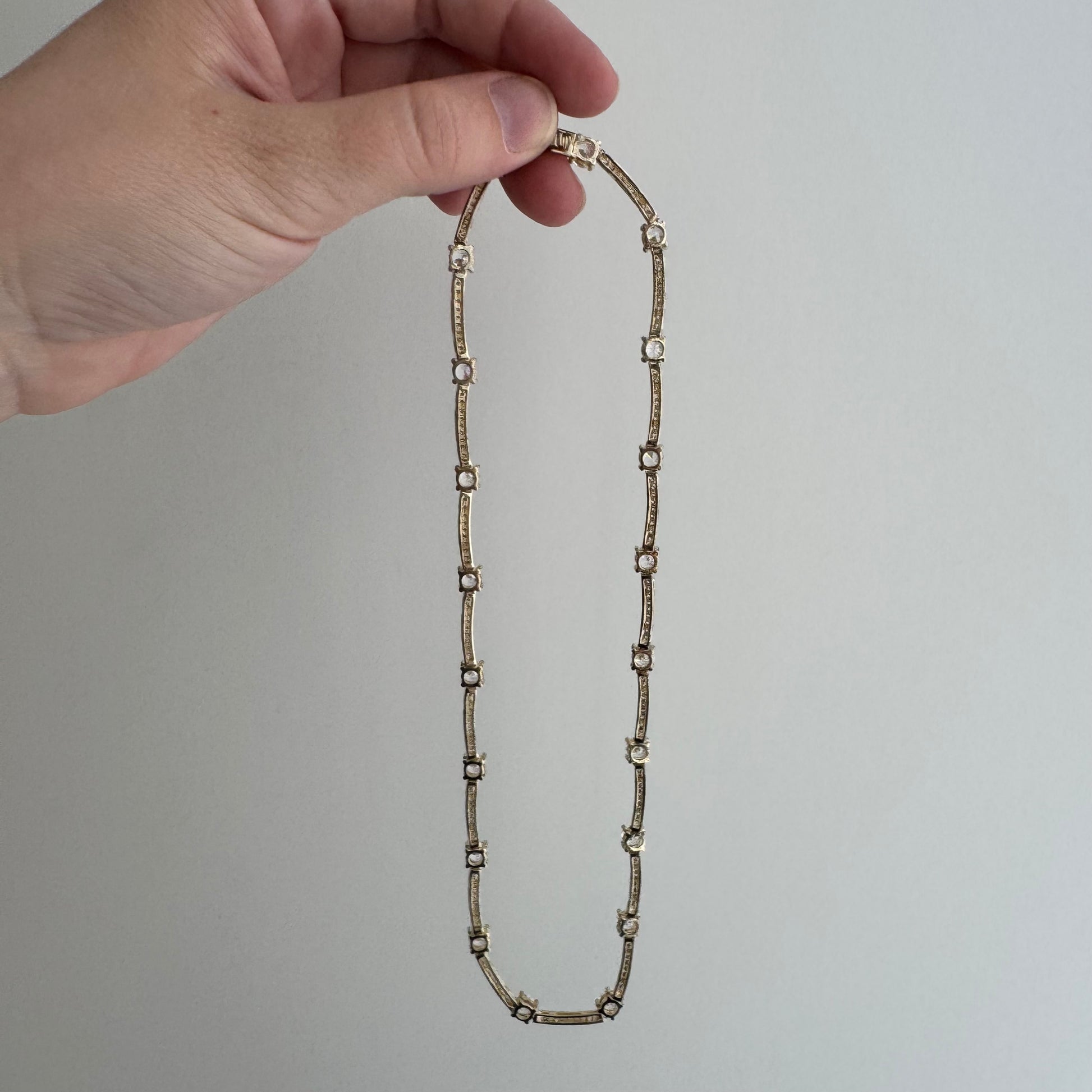 oh wow, this does a great job at fooling the eye — at first glance, or in a jumble of necklaces this presents like fine, fine jewelry, but in reality it's many sparkly CZ 'stones' set in sterling silver with an almost-gone faded yellow gold plating, finished with a hidden clasp