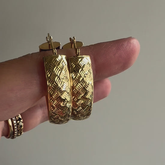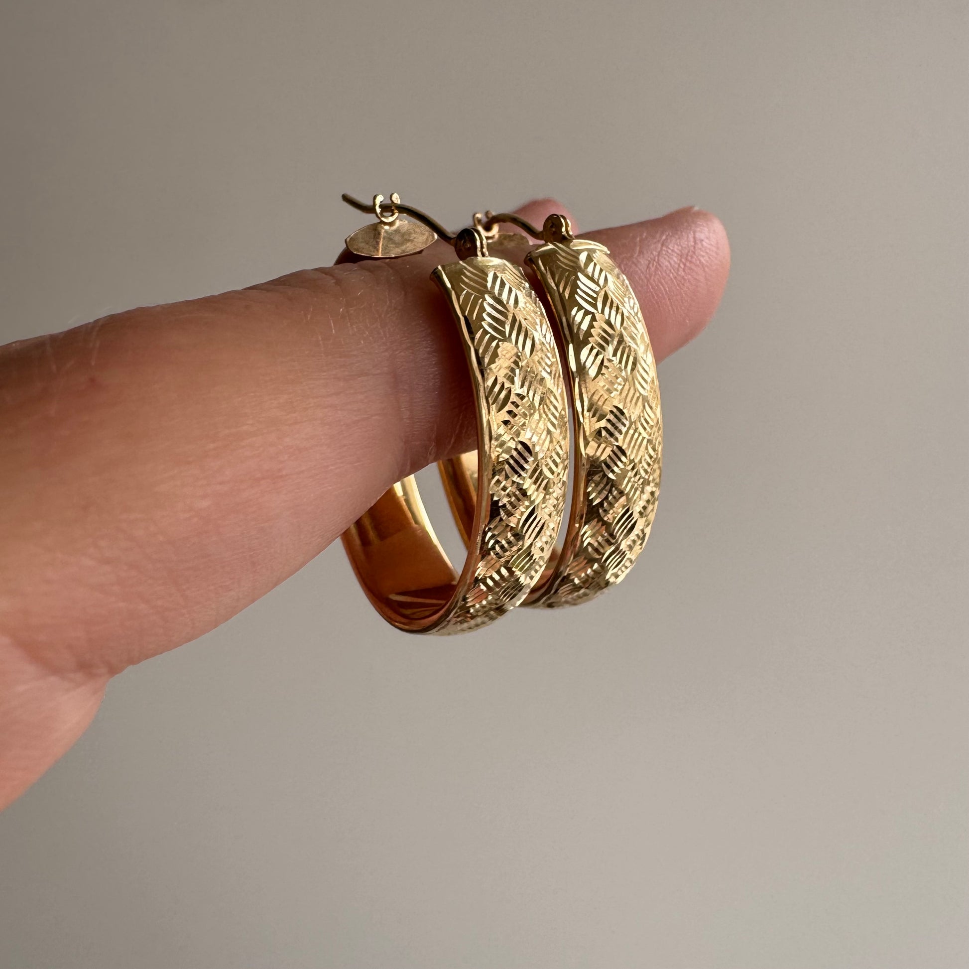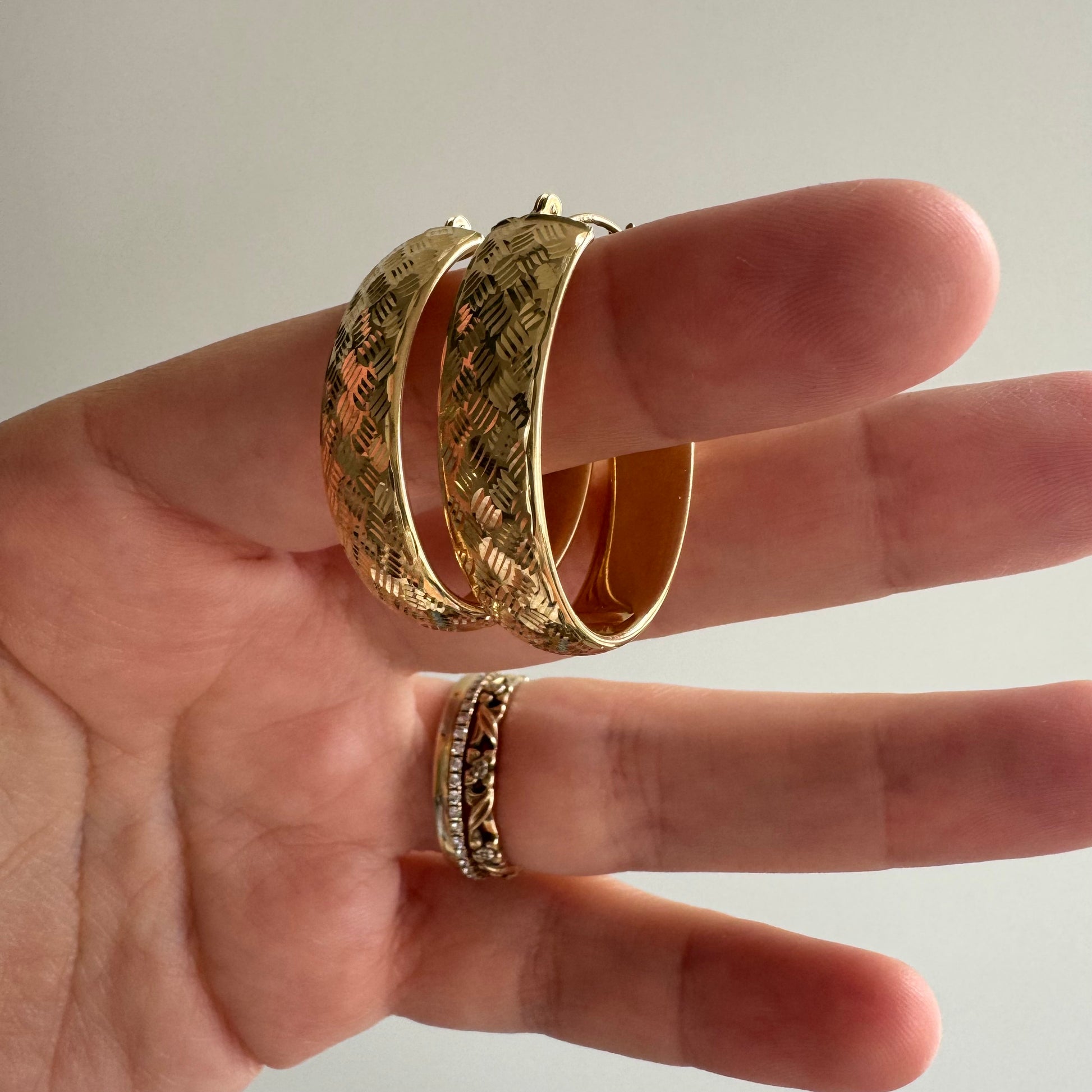 P R E - L O V E D // terrific texture / 14k yellow gold wide oval hoops / over 1"