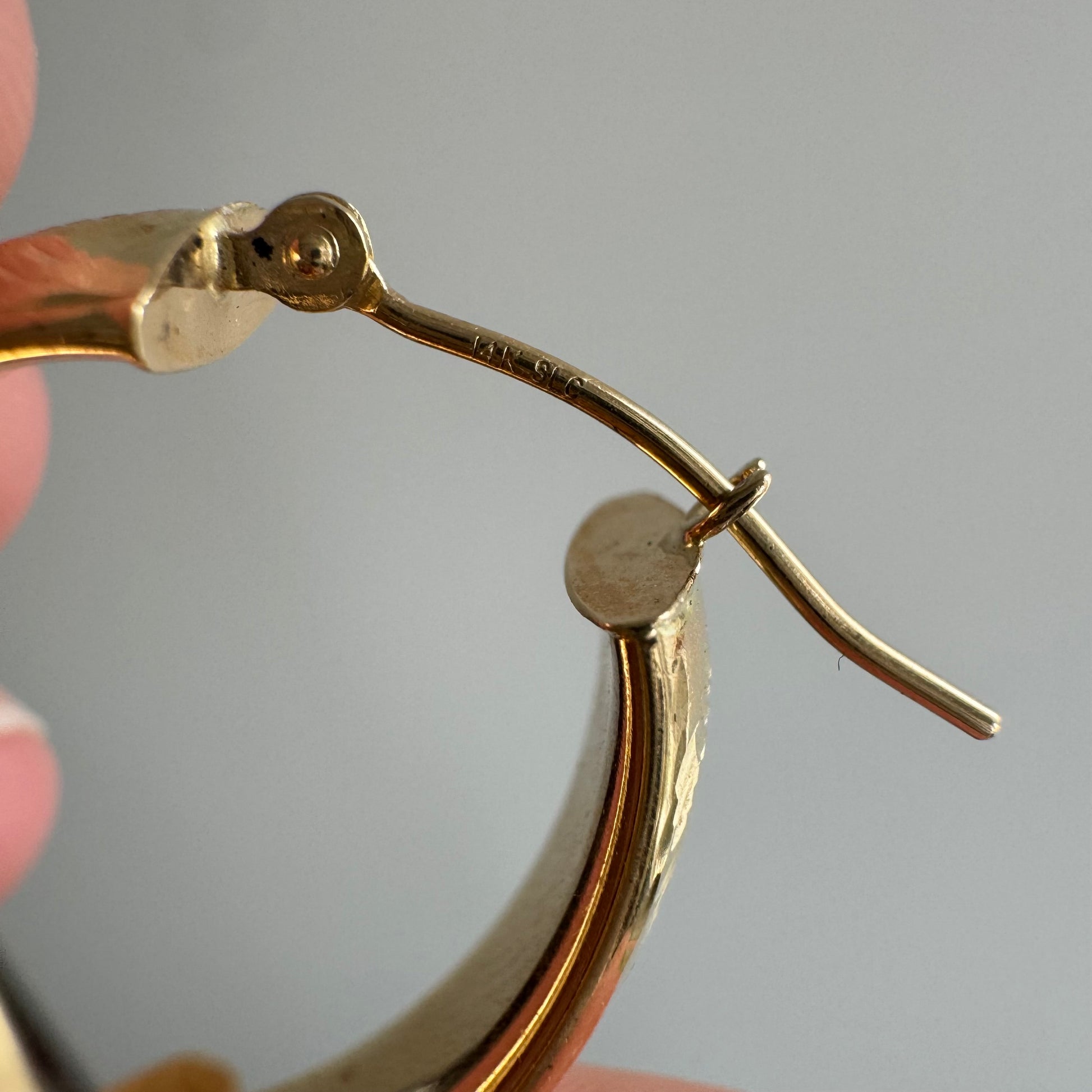 surface scratches and patina consistent with pre-loved hoops with a few tiny tiny dents that are hidden by the design, but visible with careful inspection