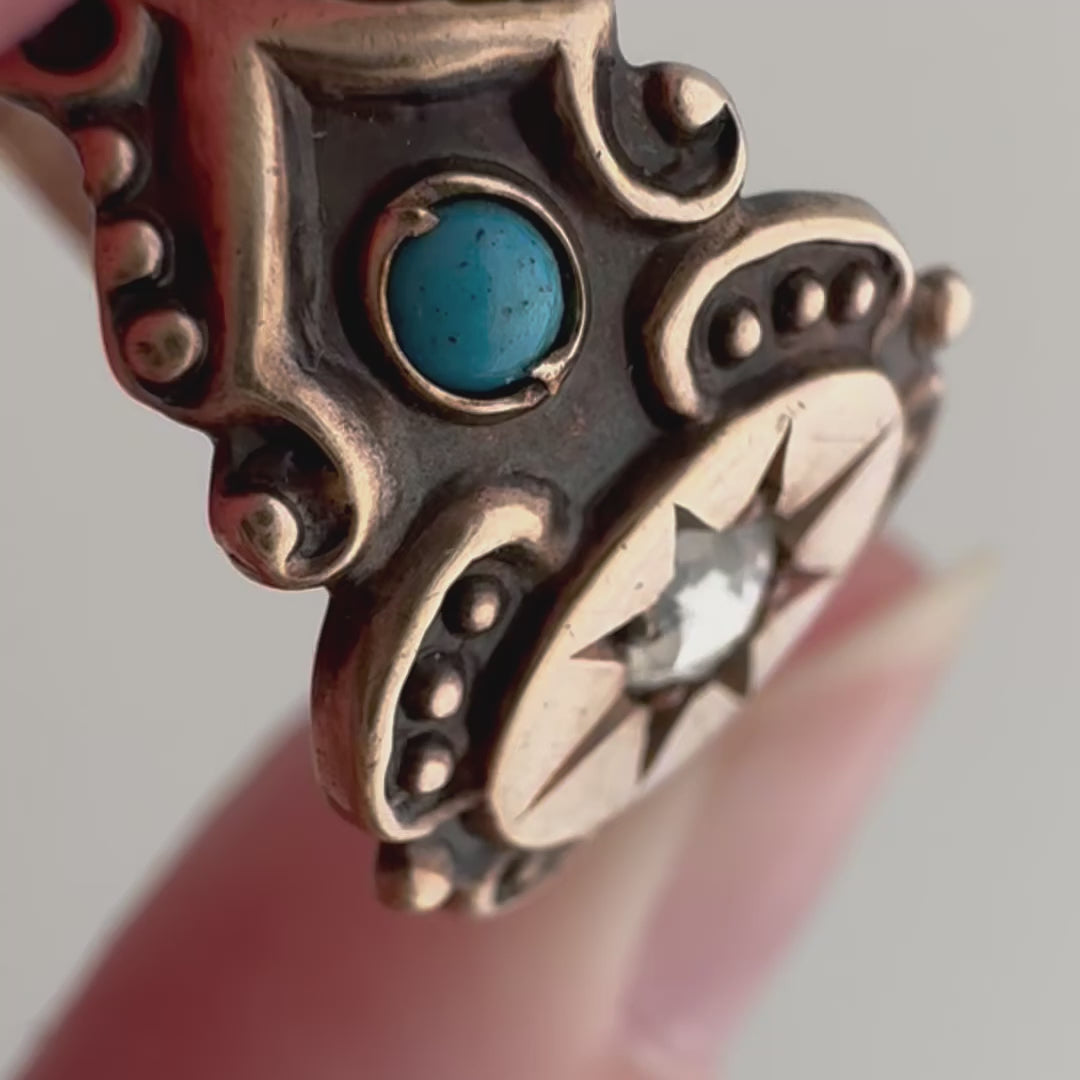 unbelievably, it was recently rescued from a scrap pile, but because of its time in the scrap pile and its design it has lost all of its original stones. a new faceted rose cut diamond and new turquoise cabochons moved in to replace the stones of yesteryear.