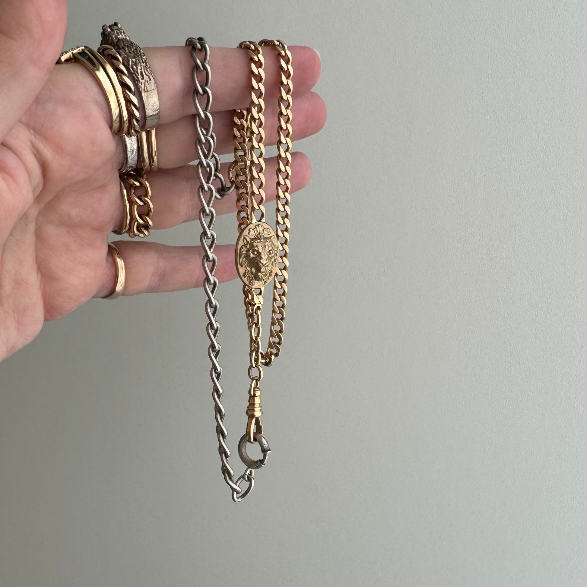 a rosy yellow gold watch chain with flat, tight curb chain links has a new antique style art nouveau lion added in for a bit of extra length and has been paired with a plump, sturdy vintage sterling silver oval curb chain bracelet