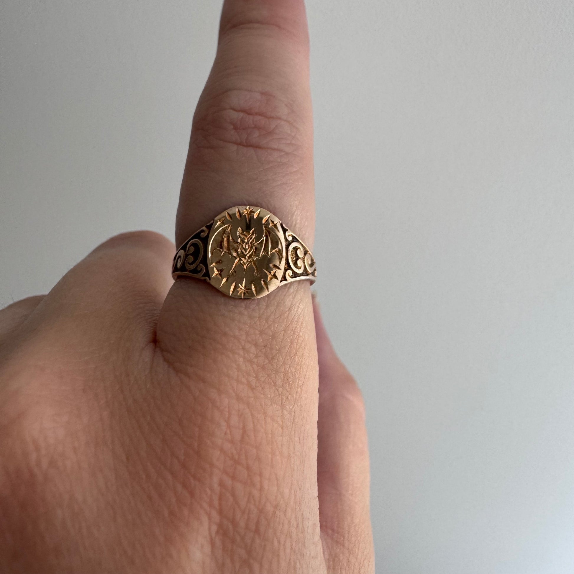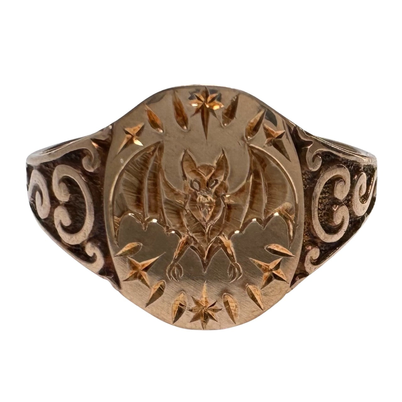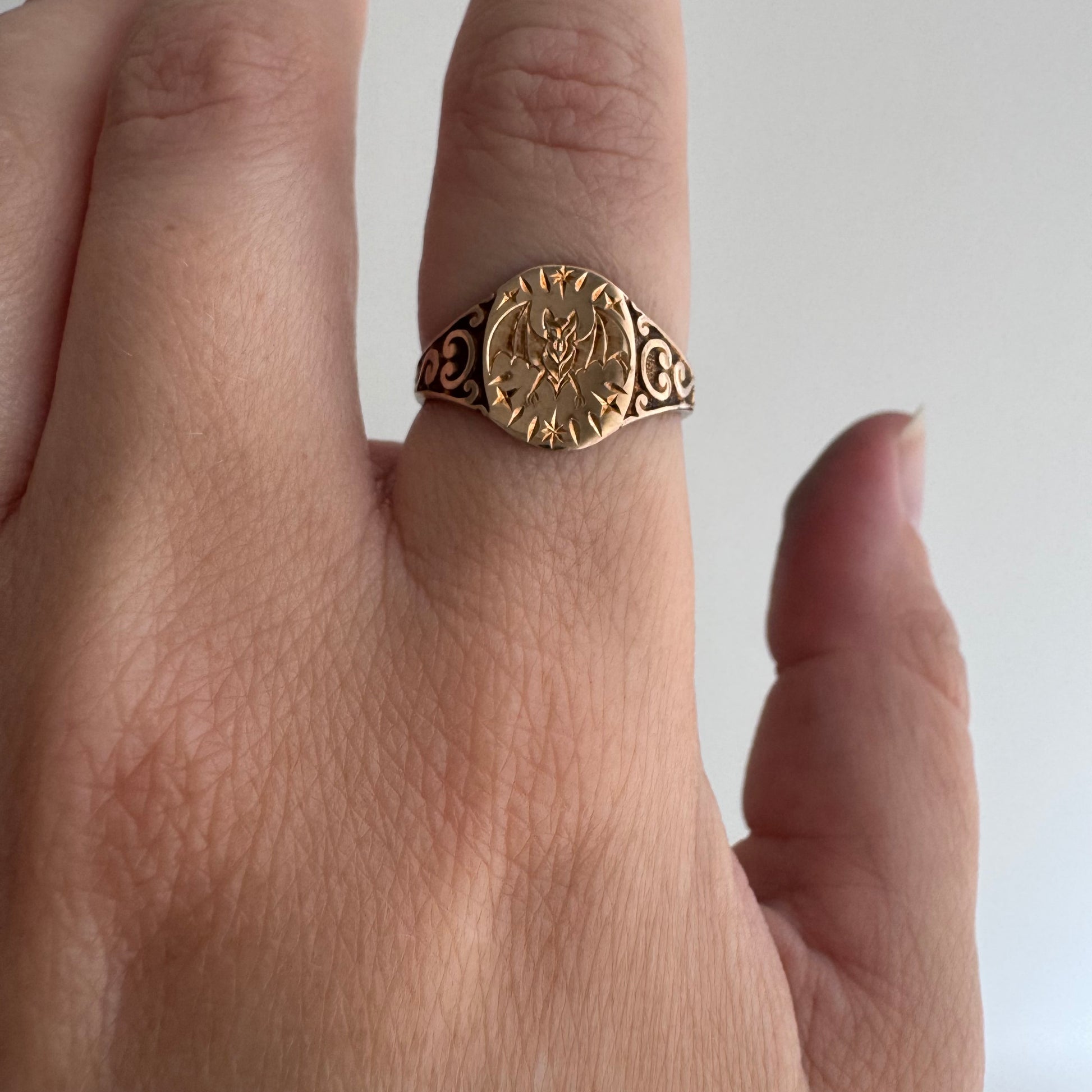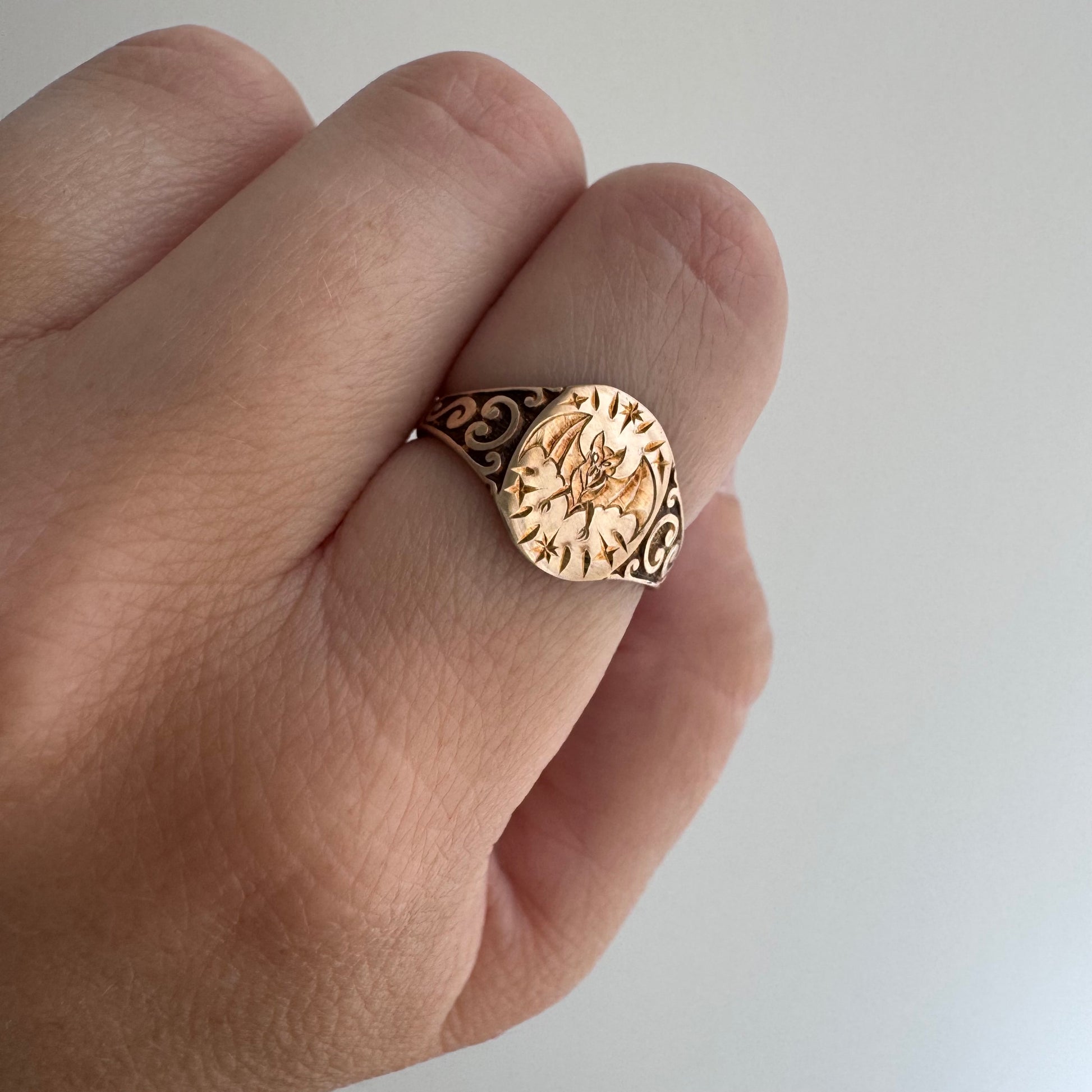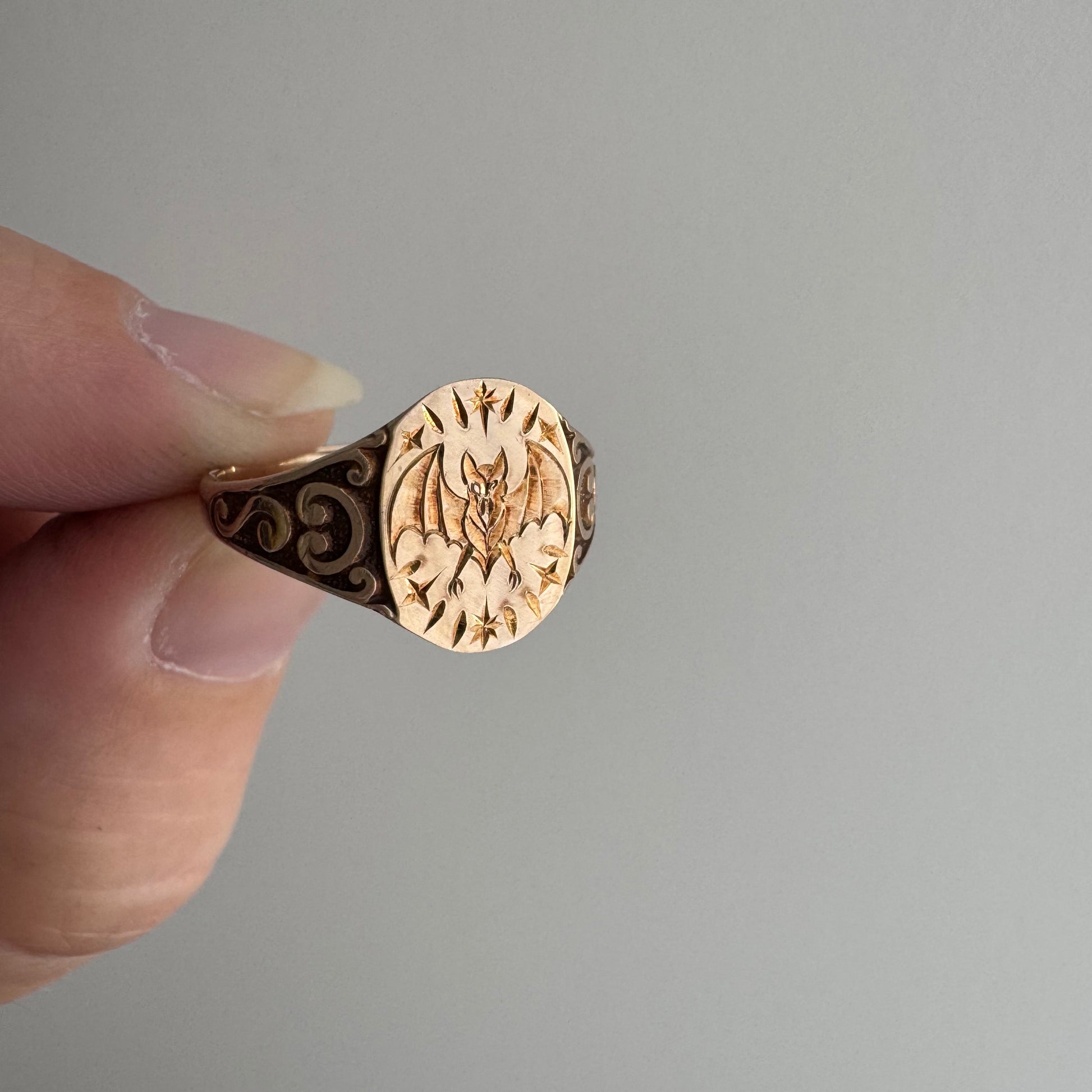 reimagined A N T I Q U E // intuitive guide / 10k rosy yellow signet with a newly engraved bat / size 5.75