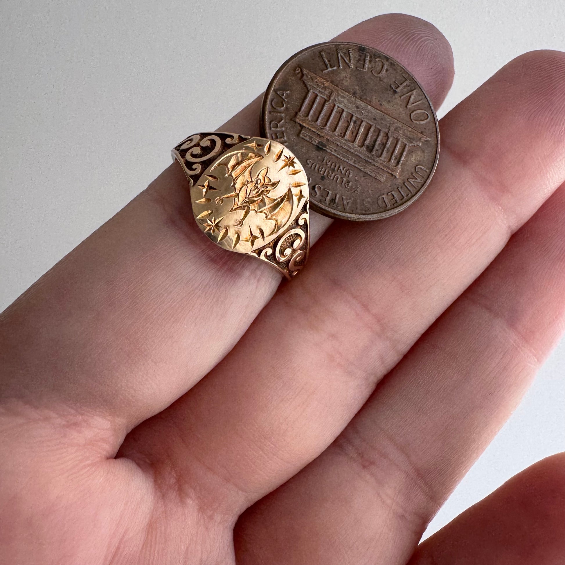need a little reminder to trust your intuition? perhaps an antique 10k rosy yellow Ostby Barton signet newly adorned with a hand-engraved bat framed by starburst-esque engraved details to remind us of the signals they're sending and receiving to understand their surroundings is the right figural friend for the intention