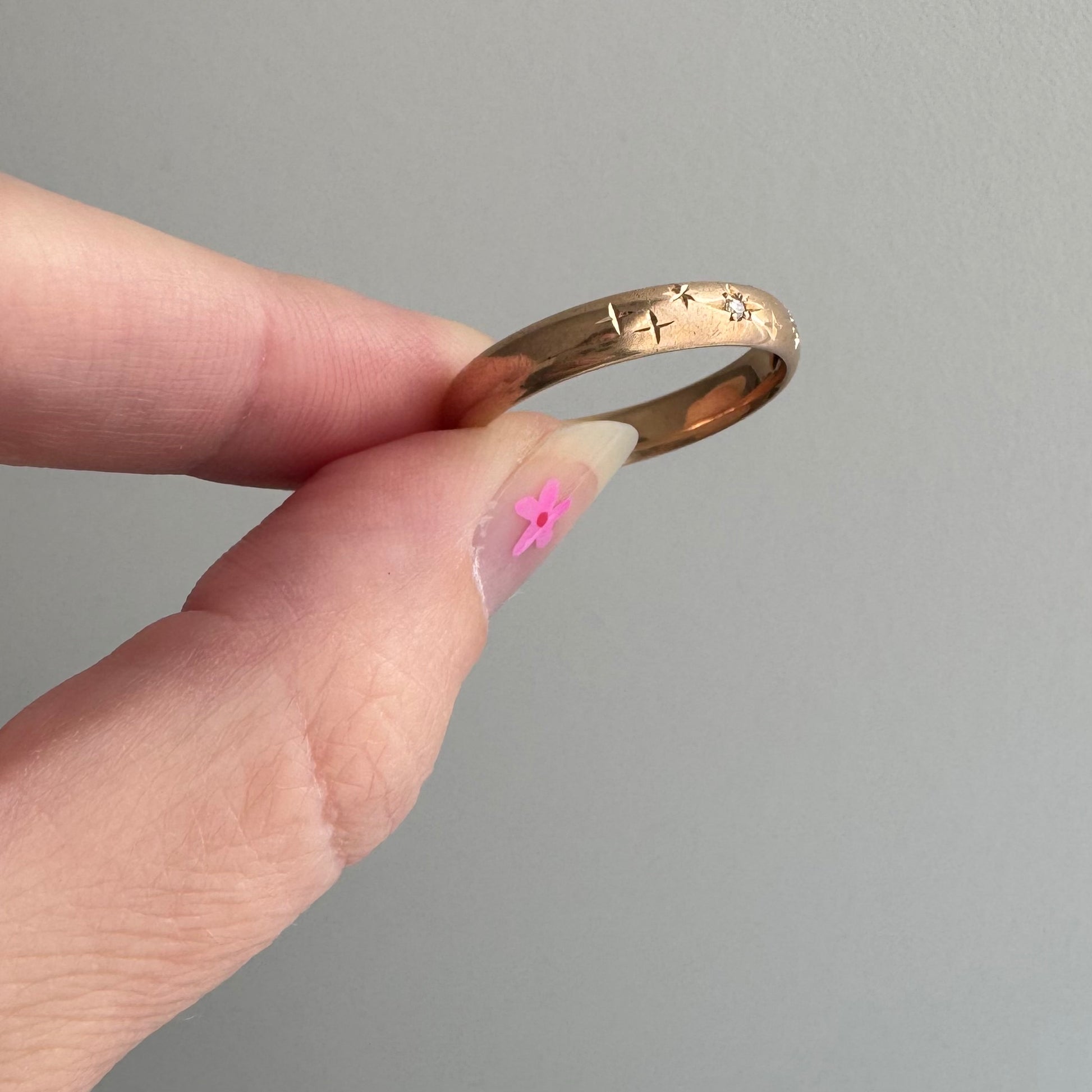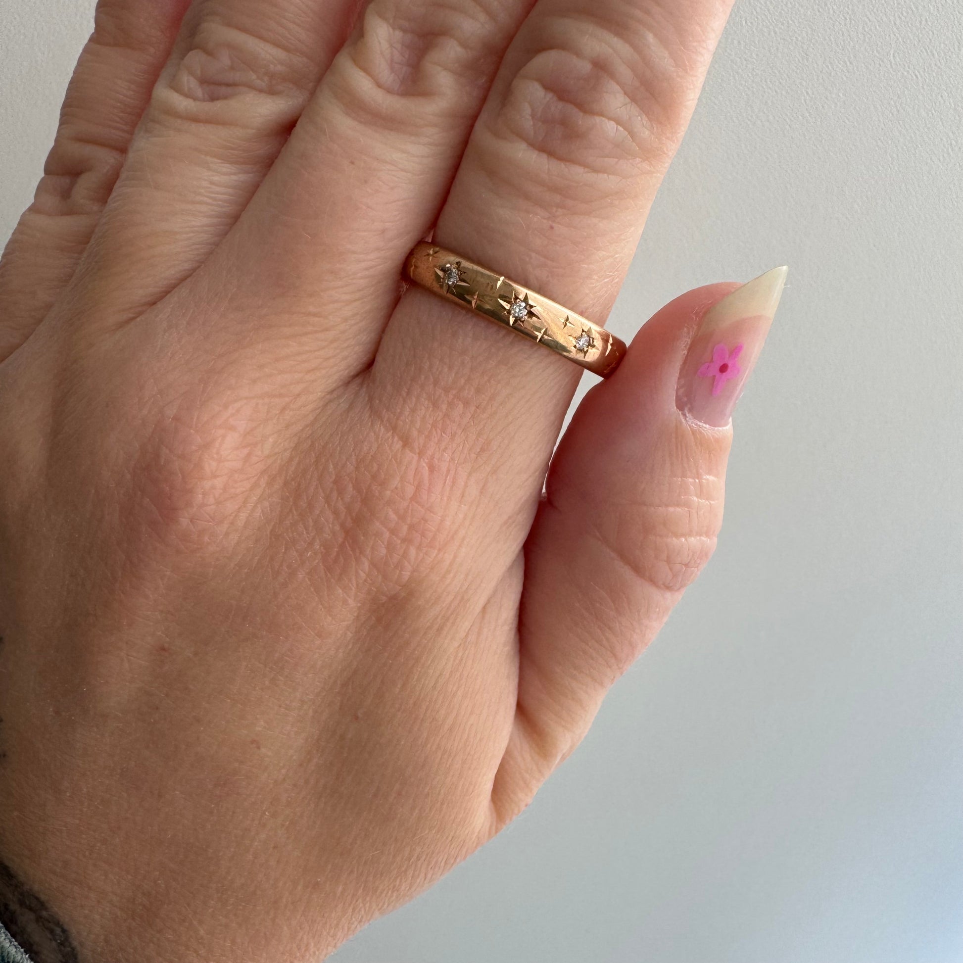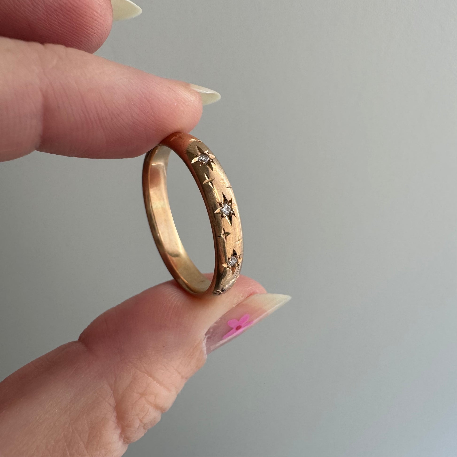 reimagined A N T I Q U E // star story / 14k donut band with three new star-set diamonds and engraved starbursts / size 10