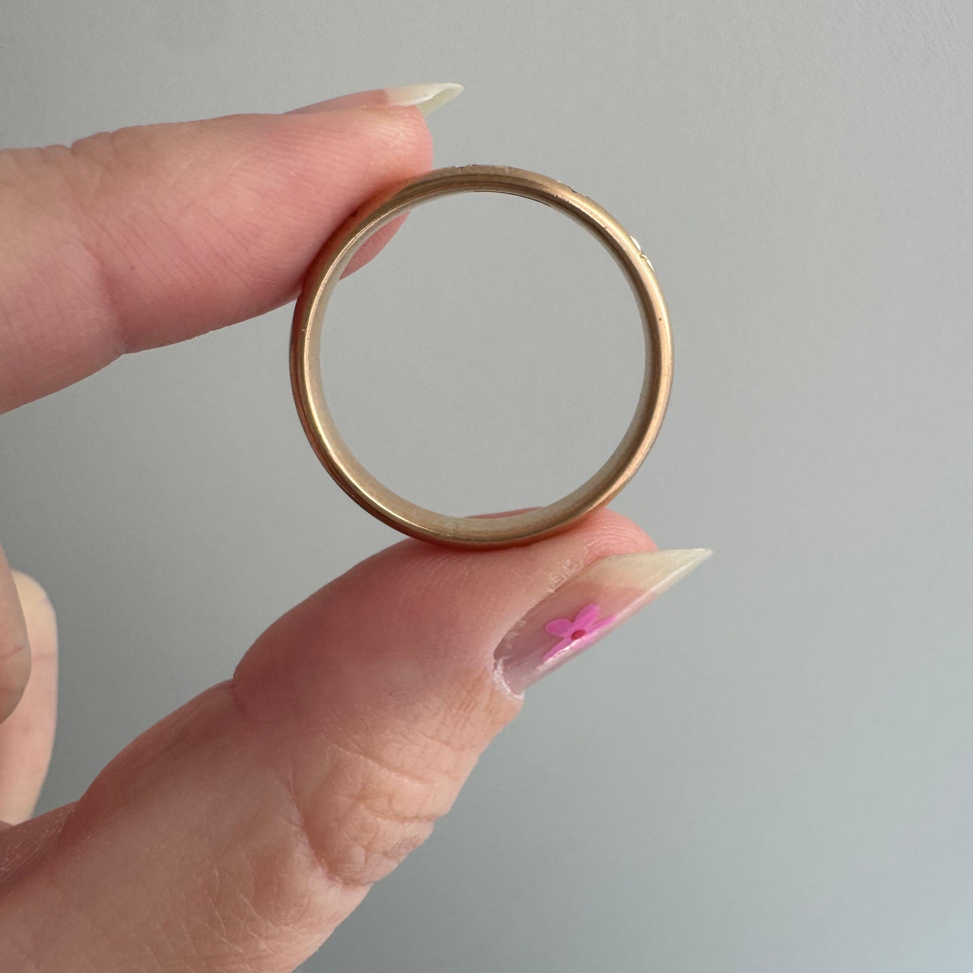 this particular band is a plump, donut-y, comfort-fit band in a coveted larger size. the band is circa ~1920s and is a rich, rosy hue of solid 14k yellow gold. the diamonds are new round brilliant cuts. the star set diamonds and engraved starbursts are done by hand, so you'll notice they aren't perfectly equidistant or level, and each one has its own little quirks in its eight point setting. it's a wearable prayer about our connection with each other, the universe, and the magic that is in the now, which is possible only because of what has come before and what is yet to unfold
