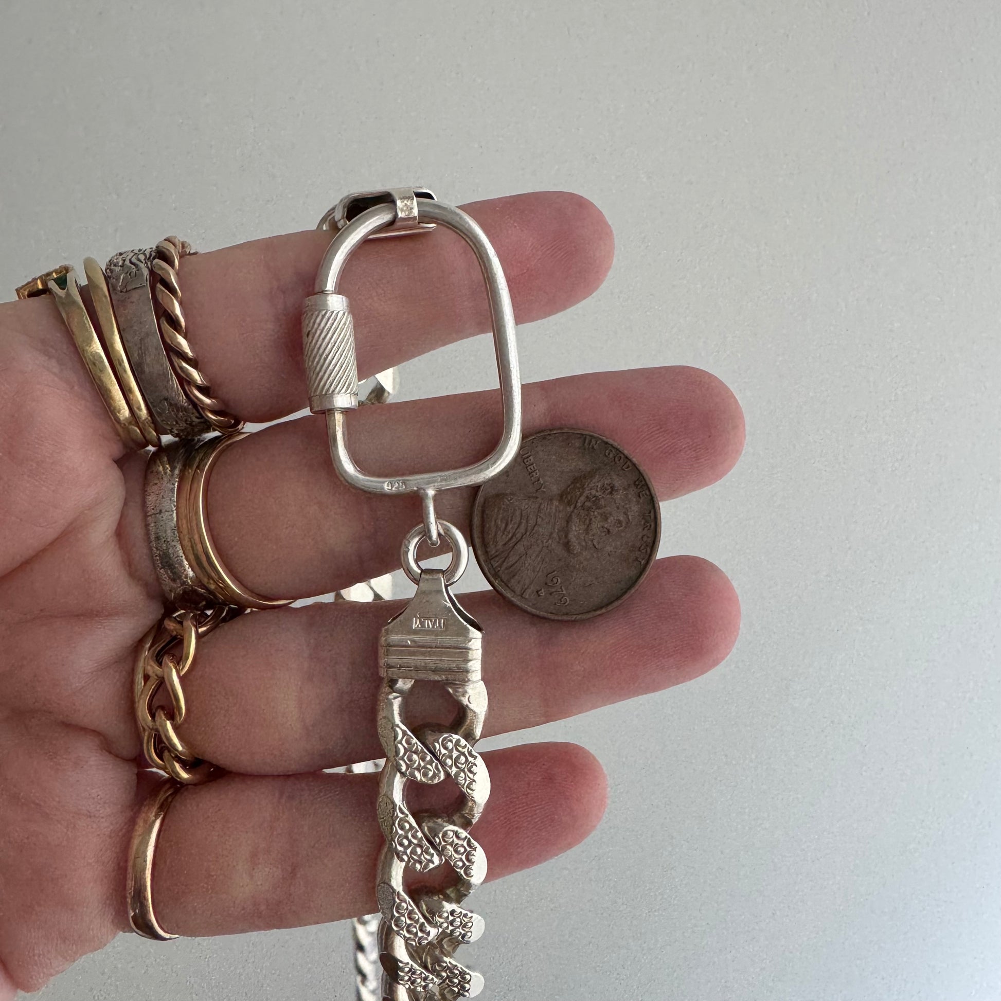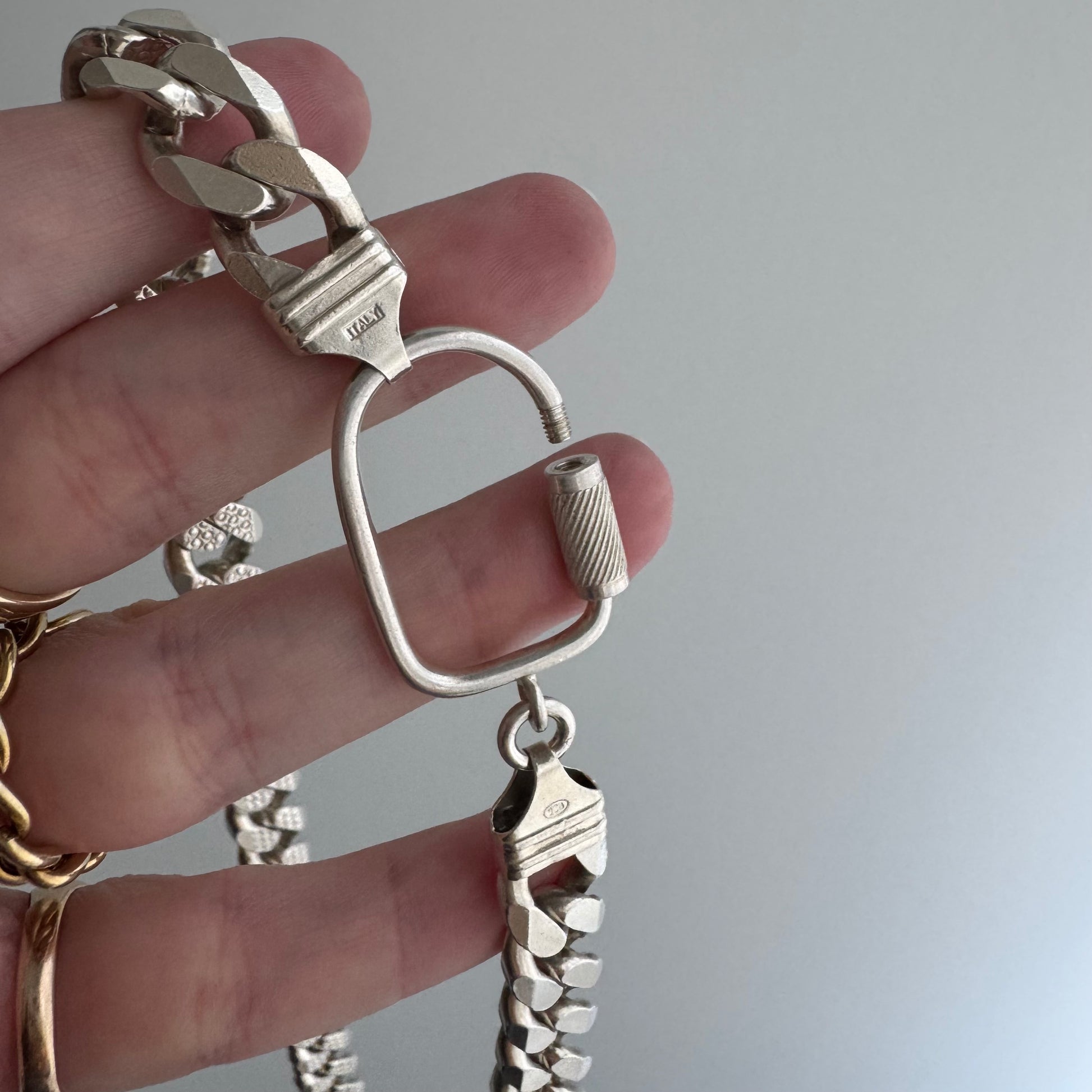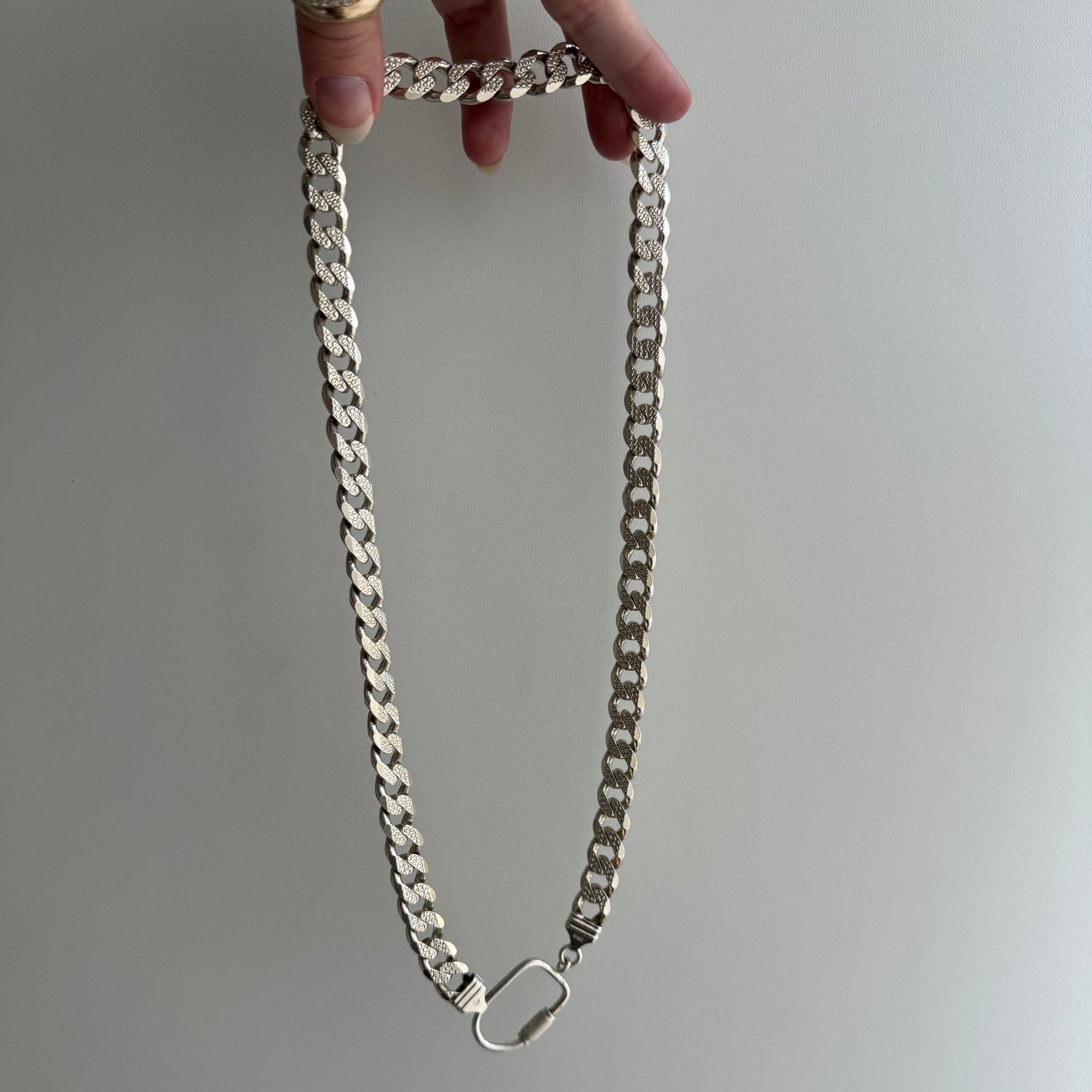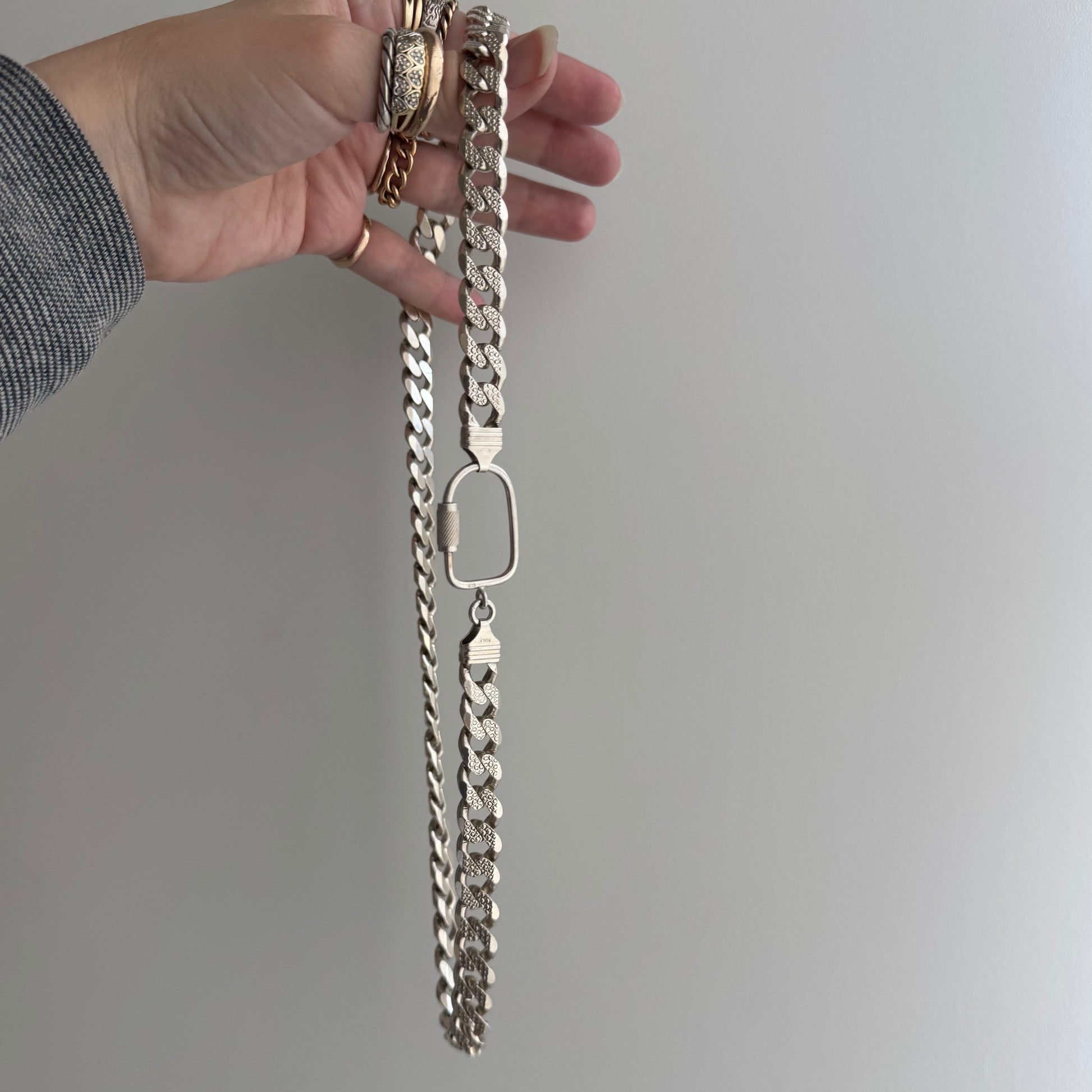 a vintage sterling silver classic, sturdy, heavy, double sided plump flat cuban curb link chain that has been modified to include a vintage large carabiner clasp with a screw closure. the clasp worn at the back of the neck like a traditional clasp, or worn in the front — it easily holds a jumble of charms and pendants