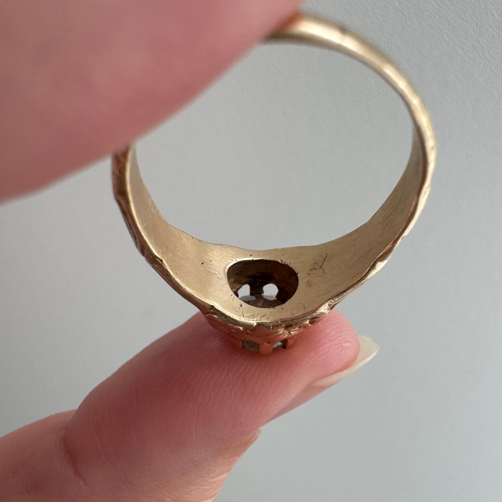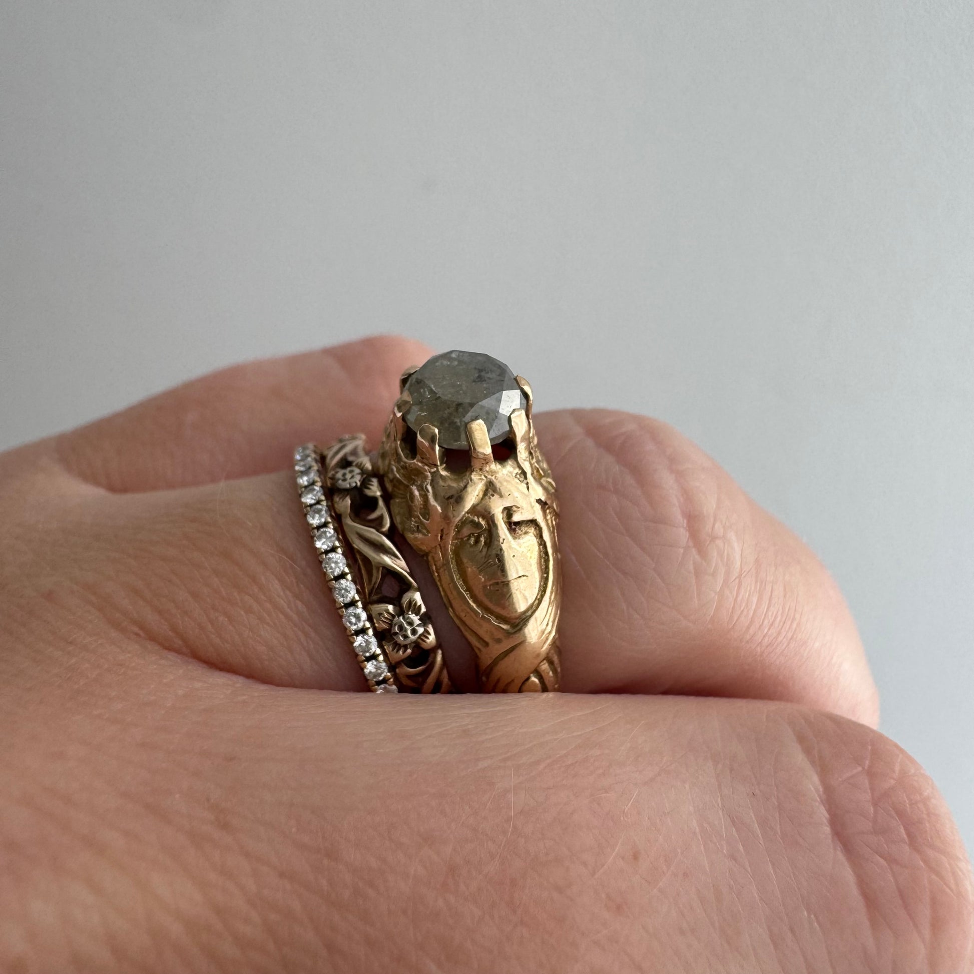 the setting is old—nearly antique—and the relief carved details of the femme faces and flowers in their hair beneath the diamond setting do show softening and wear