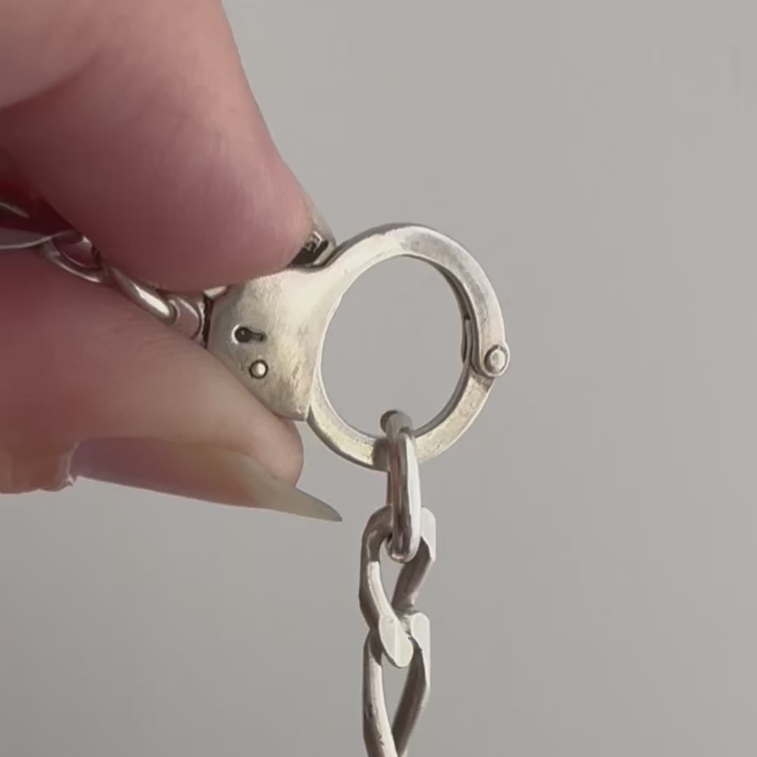 a vintage sterling silver classic, sturdy, plump, figaro link chain that has been modified to include a handcuff clasp that can be worn as-is or used to hold charms and pendants