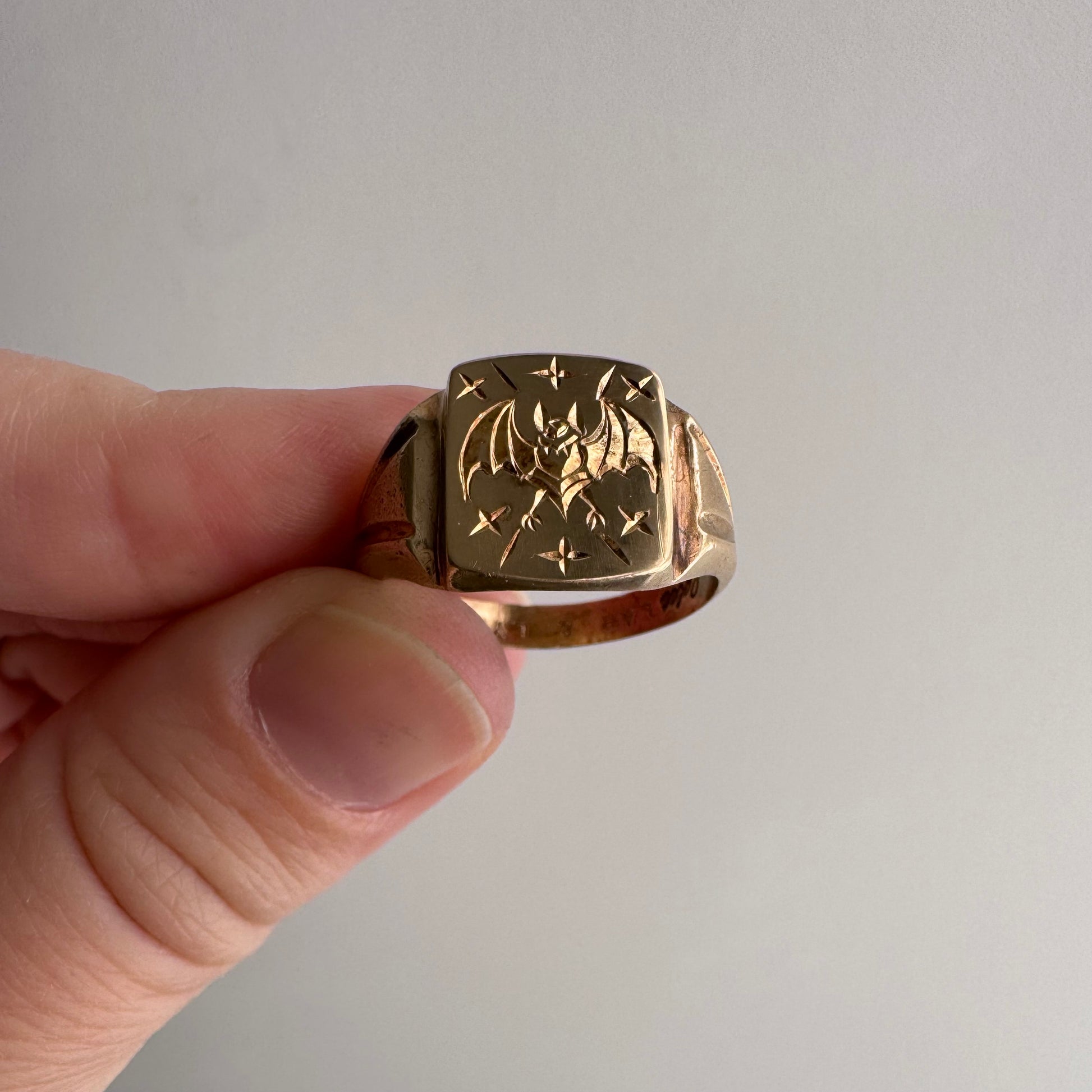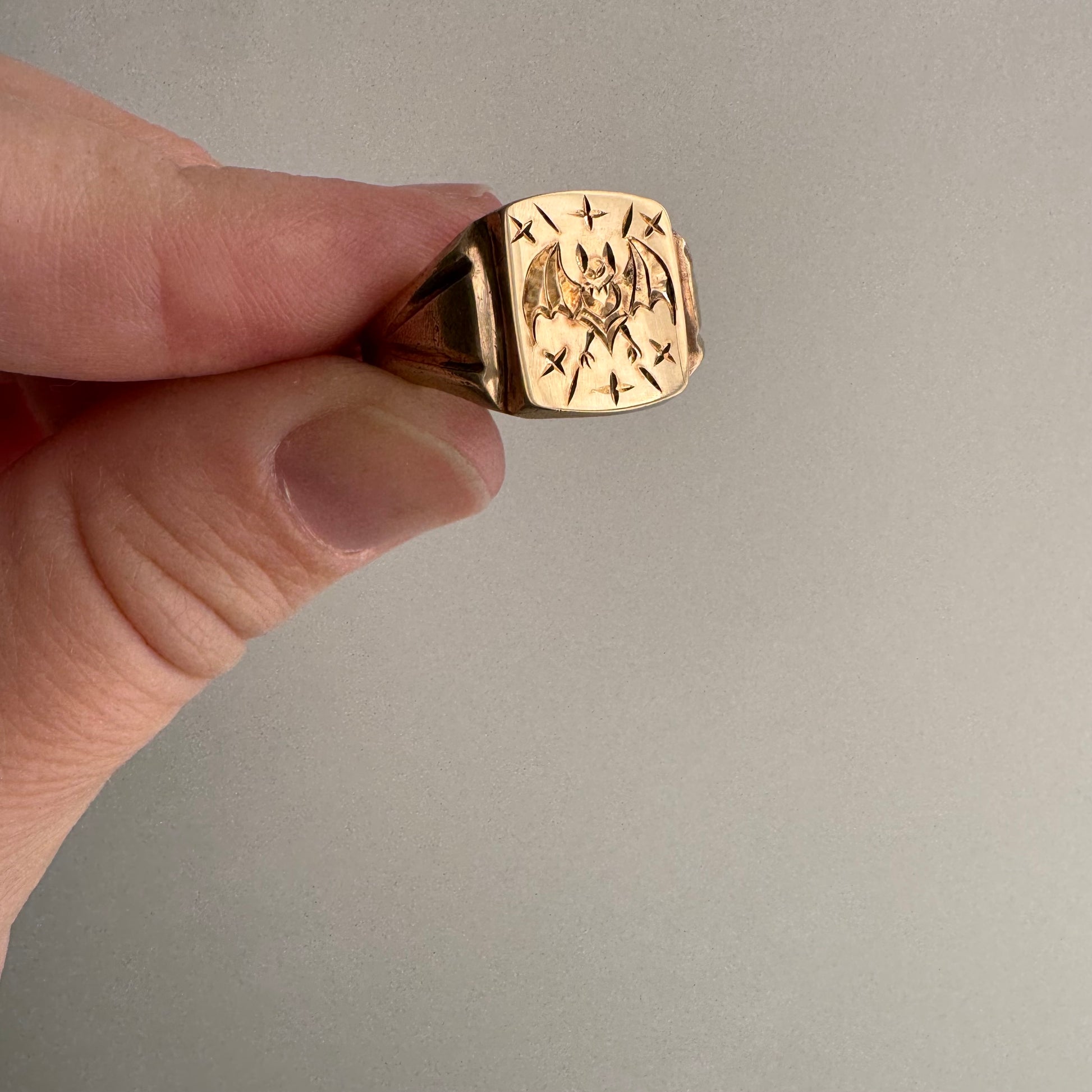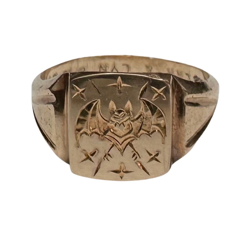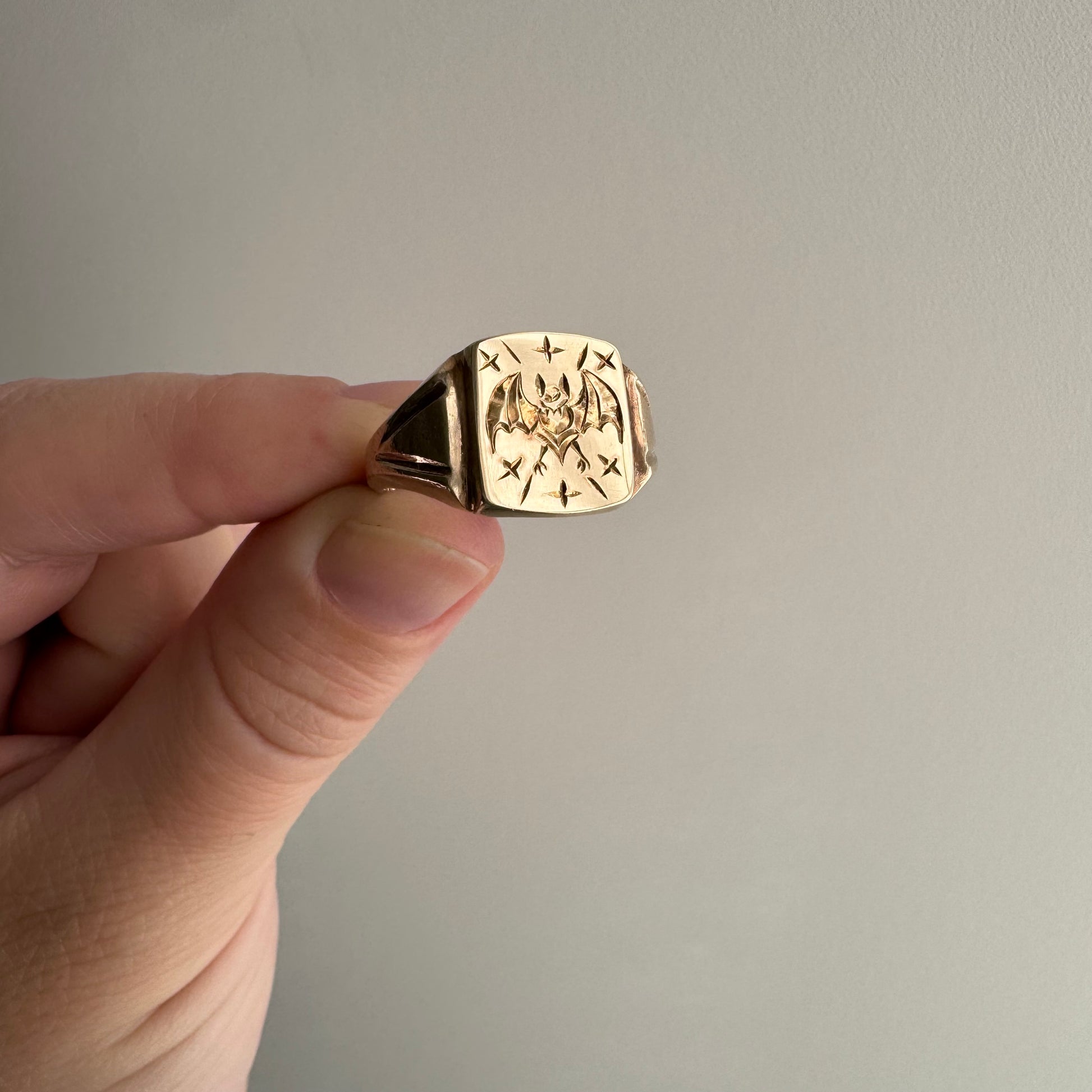 reimagined V I N T A G E // intuitive guide / 10k rosy yellow signet with a newly engraved bat / size 8.5