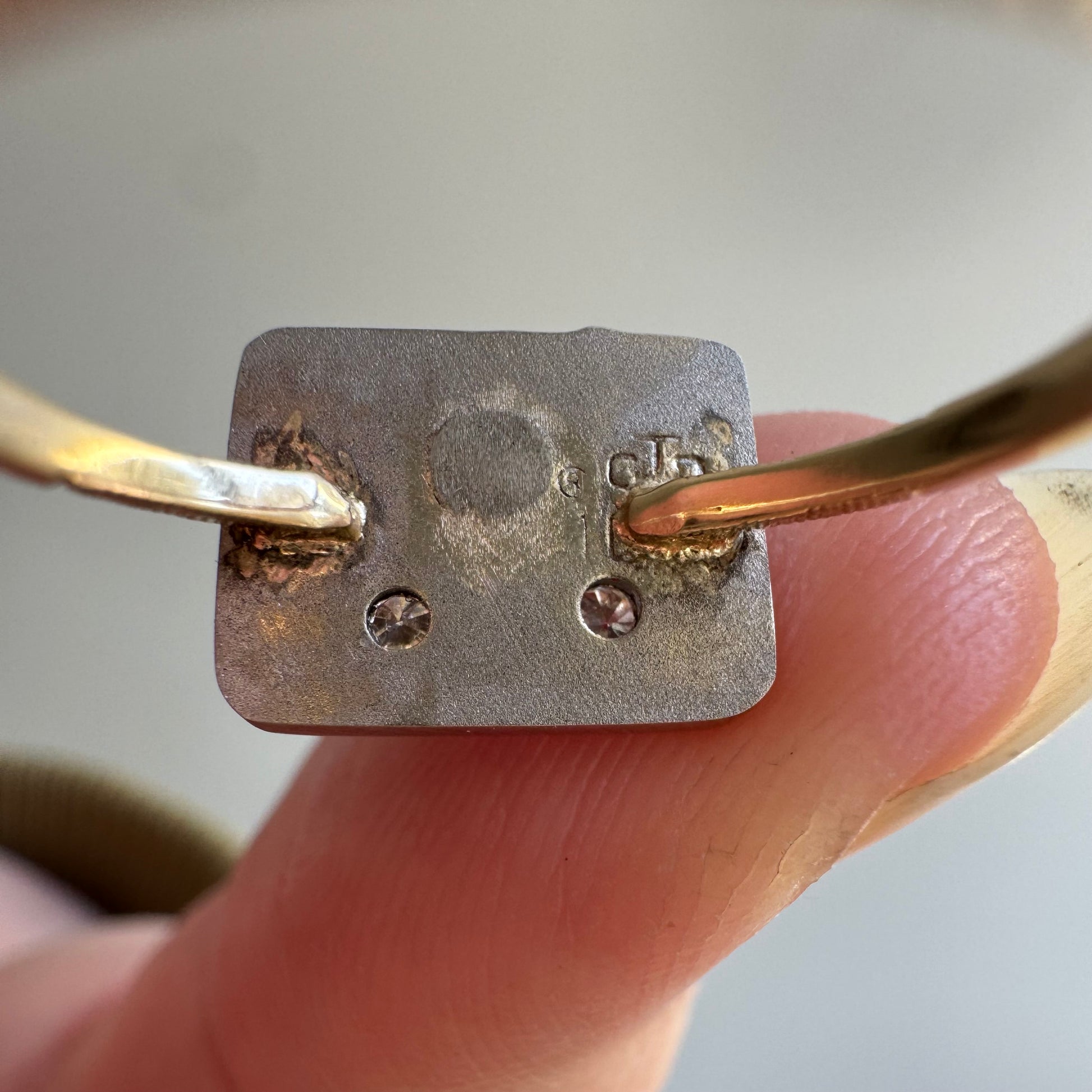 Originally a Lucky Supermarket employment service award pin for ten years of service, the pin hardware has been expertly removed and paired with a vintage wide band from the same era. In it's current era it's a signet-like ring and talisman for luck that hints that what feels like a lucky outcome may come from hard work and dedication with others around a shared goal.