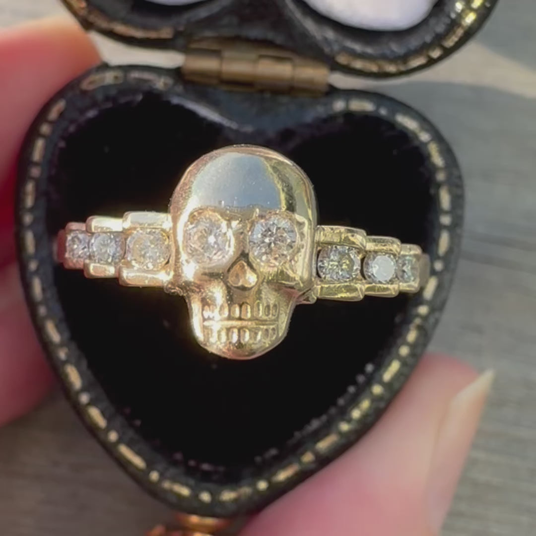 this is a true one of a kind. each one of the memento mori rings has its own personality, and per usual, this is crafted from a new 14k yellow gold original design skull modeled after skull pins of yesteryear paired with a 14k yellow gold staircase style channel set diamond band. yes, indeed, all of the stones you see are natural diamonds.