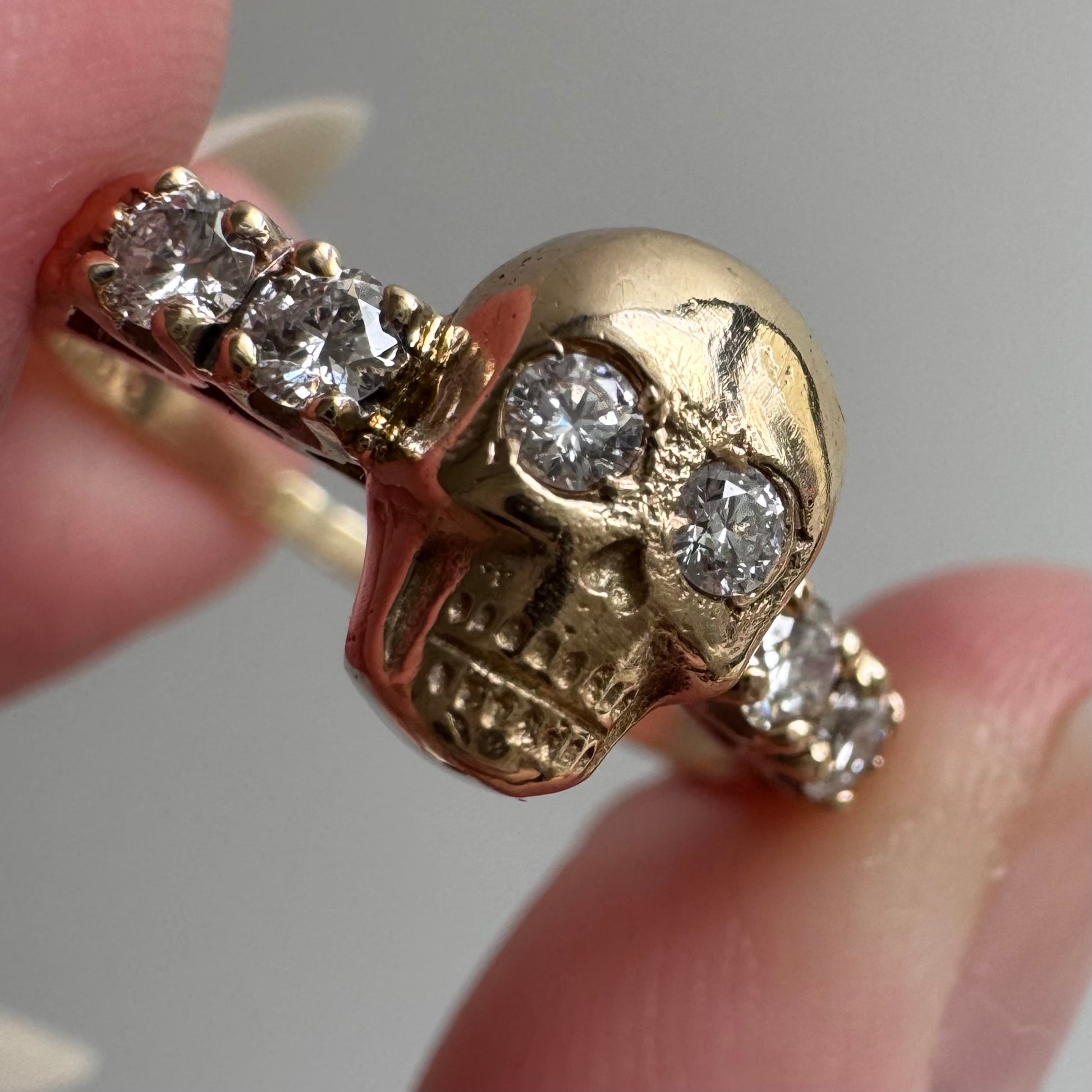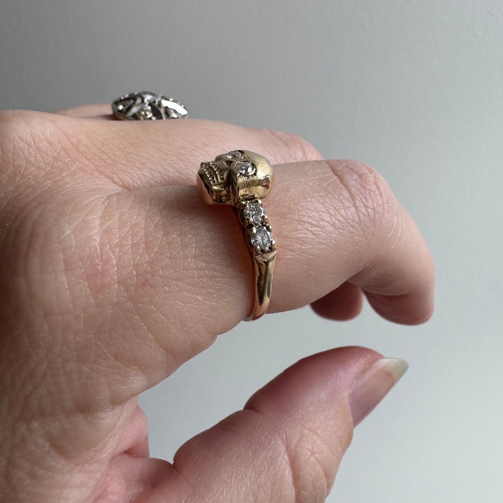 this is a true one of a kind. each one of the memento mori rings has its own personality, and per usual, this is crafted from a new 14k yellow gold original design skull modeled after skull pins of yesteryear paired with a 14k yellow gold classic half eternity band with larger-than-expected accent diamonds