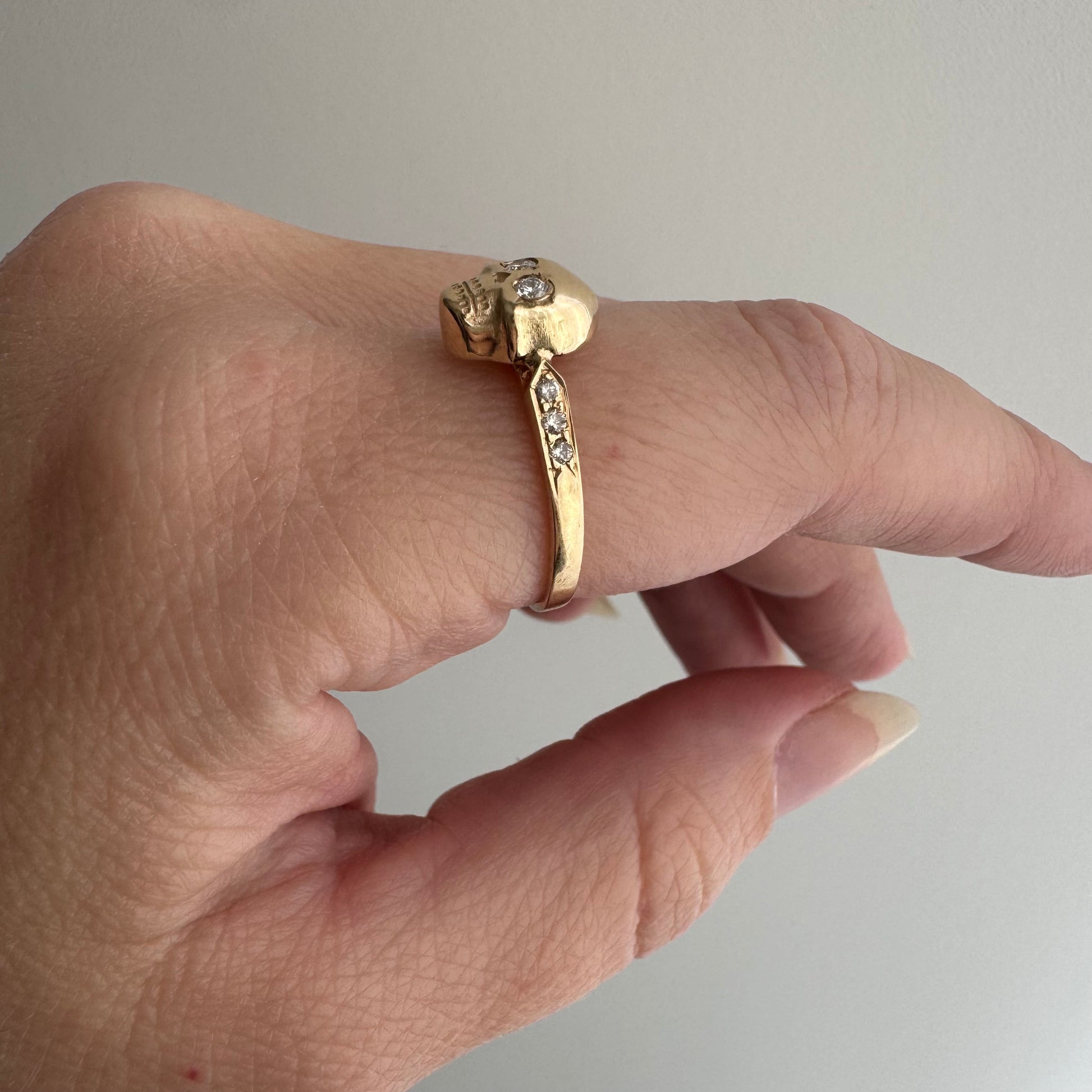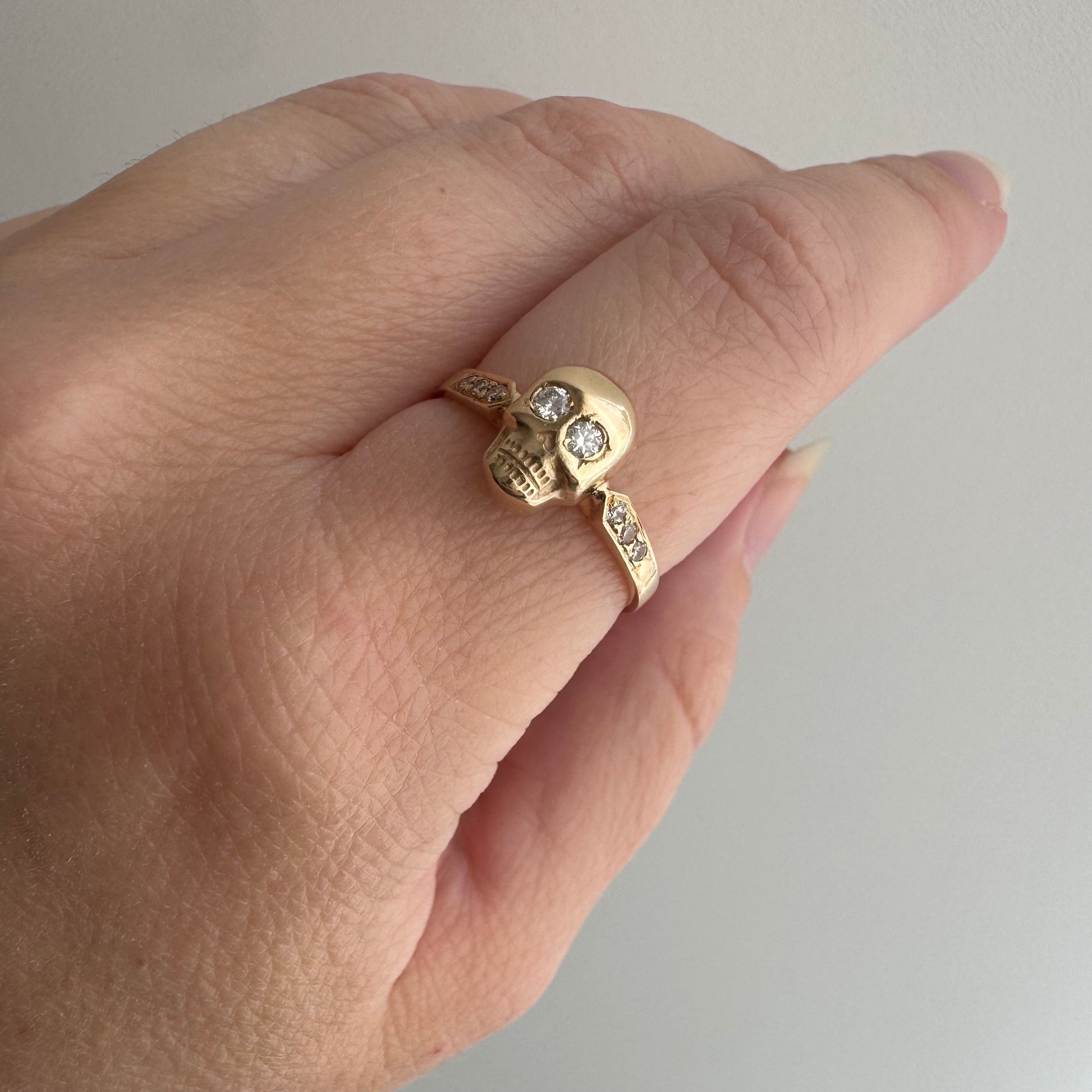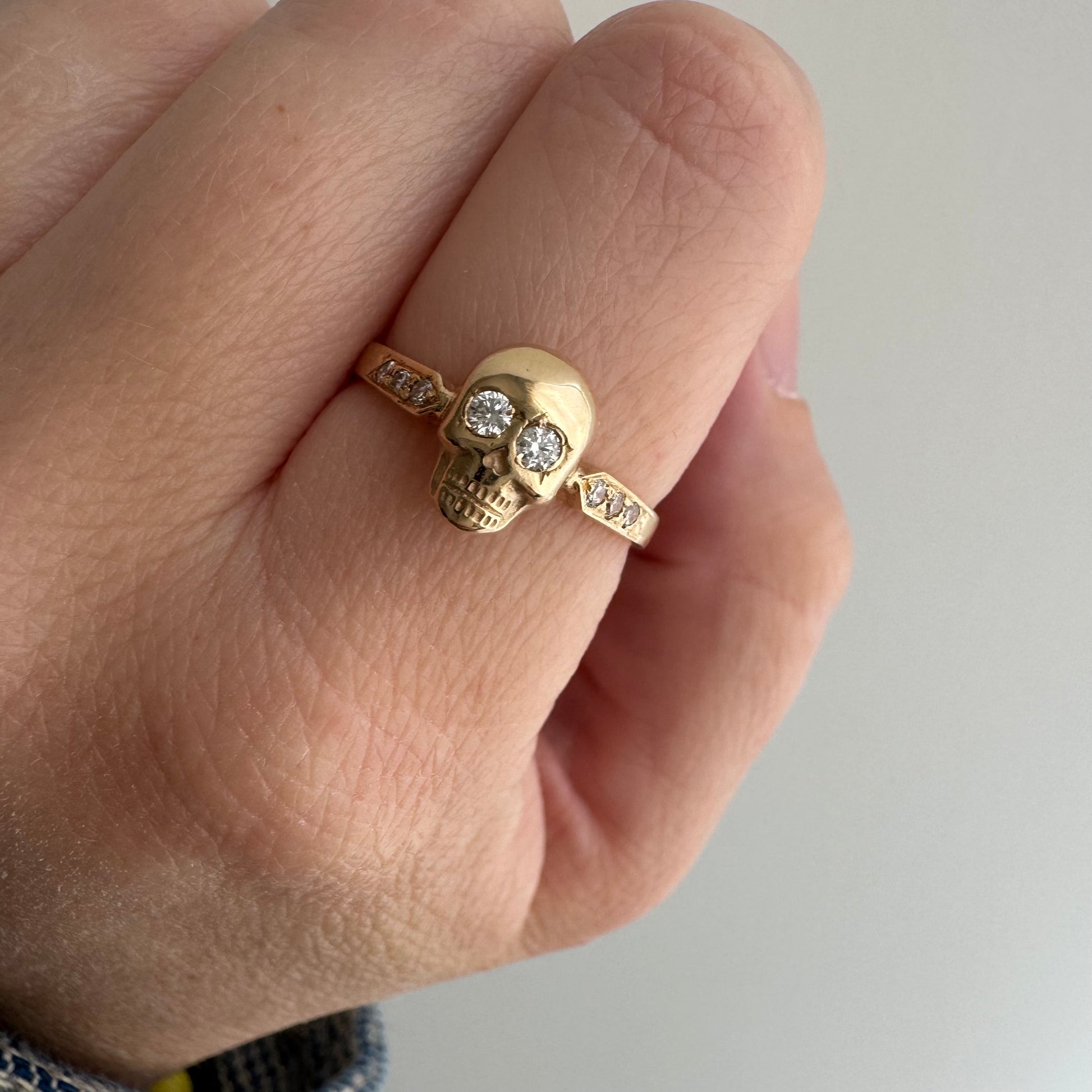 this is a true one of a kind. each one of the memento mori rings has its own personality, and per usual, this is crafted from a new 14k yellow gold original design skull modeled after skull pins of yesteryear paired with a 14k yellow gold classic half eternity band with pave diamonds in arrow-like settings pointing toward the skull's face